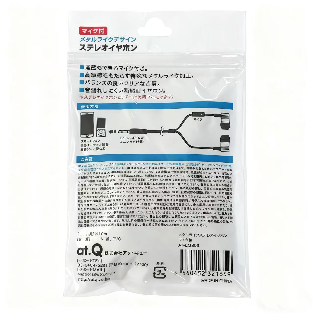 日本 at.Q 3.5mm插口入耳式金属质感立体声有线耳机AT-EMS03(1米)