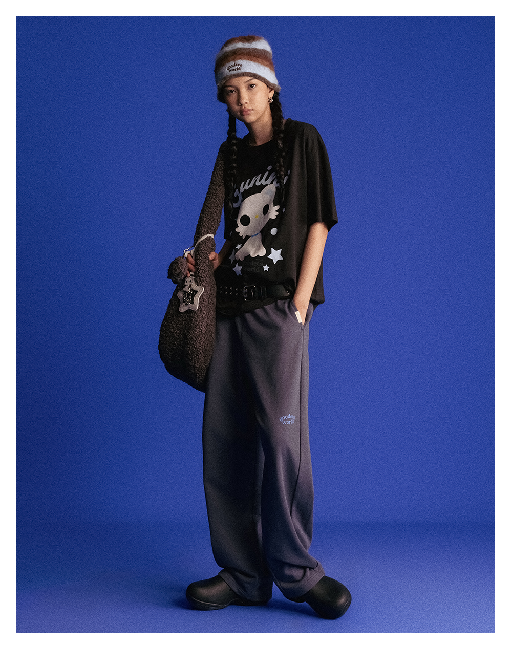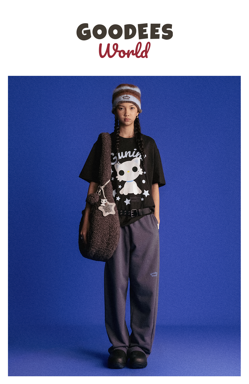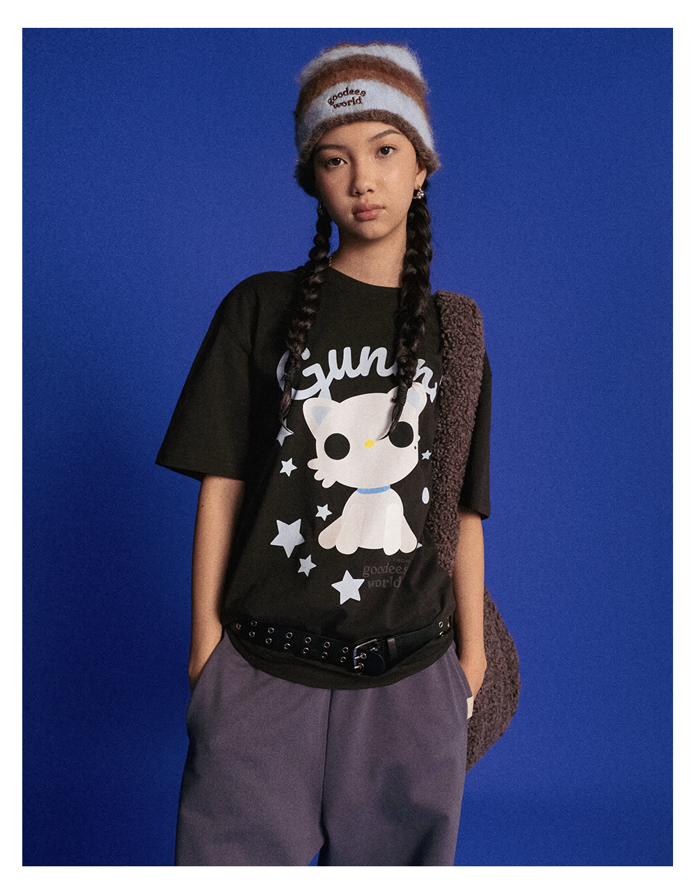 GOODBAI 春夏撞色印花短款圆领修身正肩飞袖T恤女