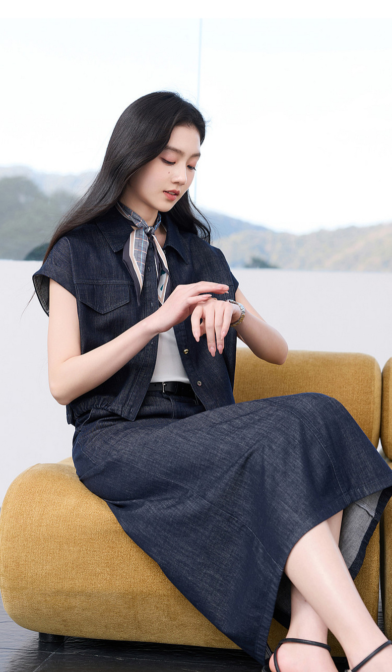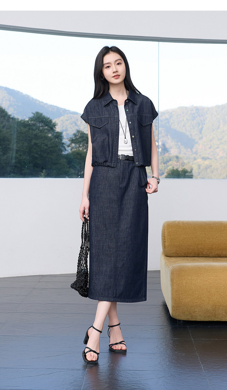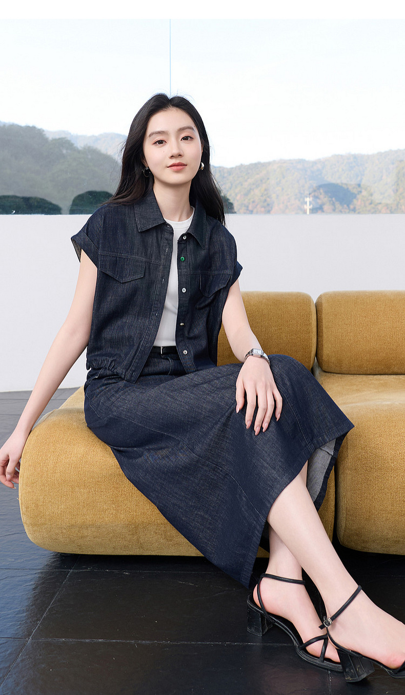 【100棉】三彩2026春季新款通勤牛仔套装上衣半身裙两件套S