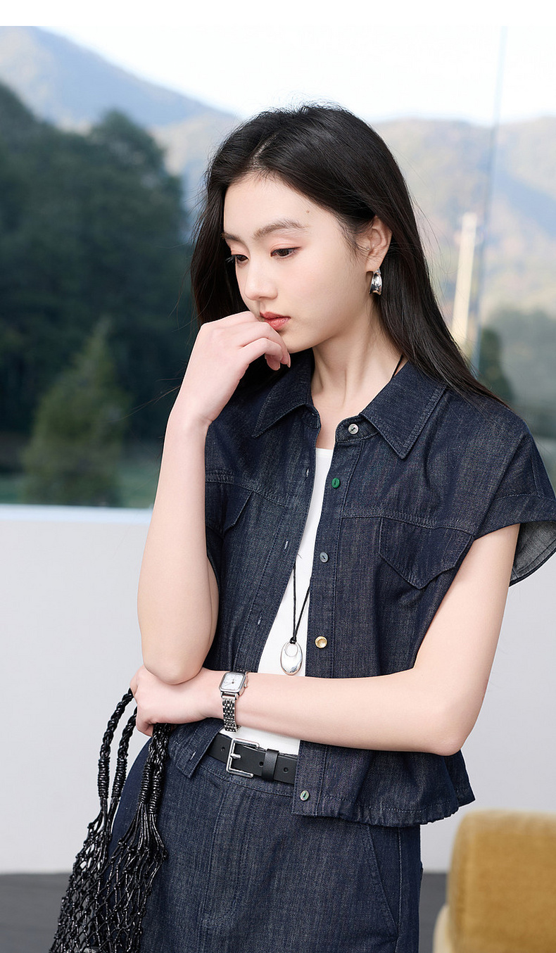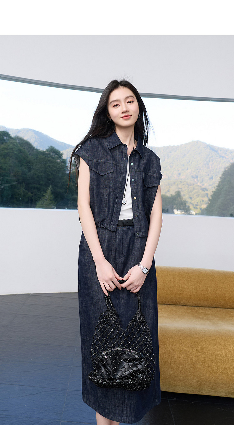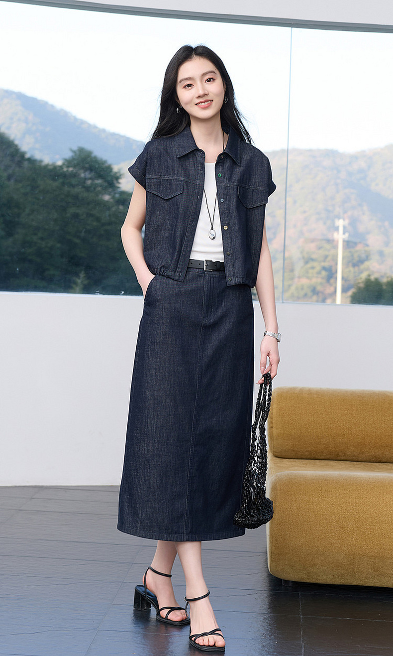 【100棉】三彩2026春季新款通勤牛仔套装上衣半身裙两件套S