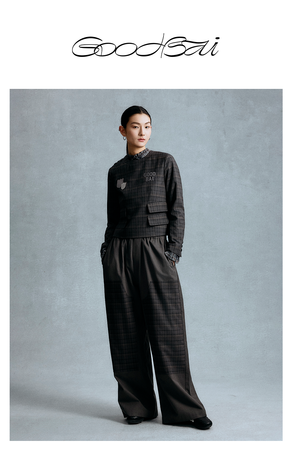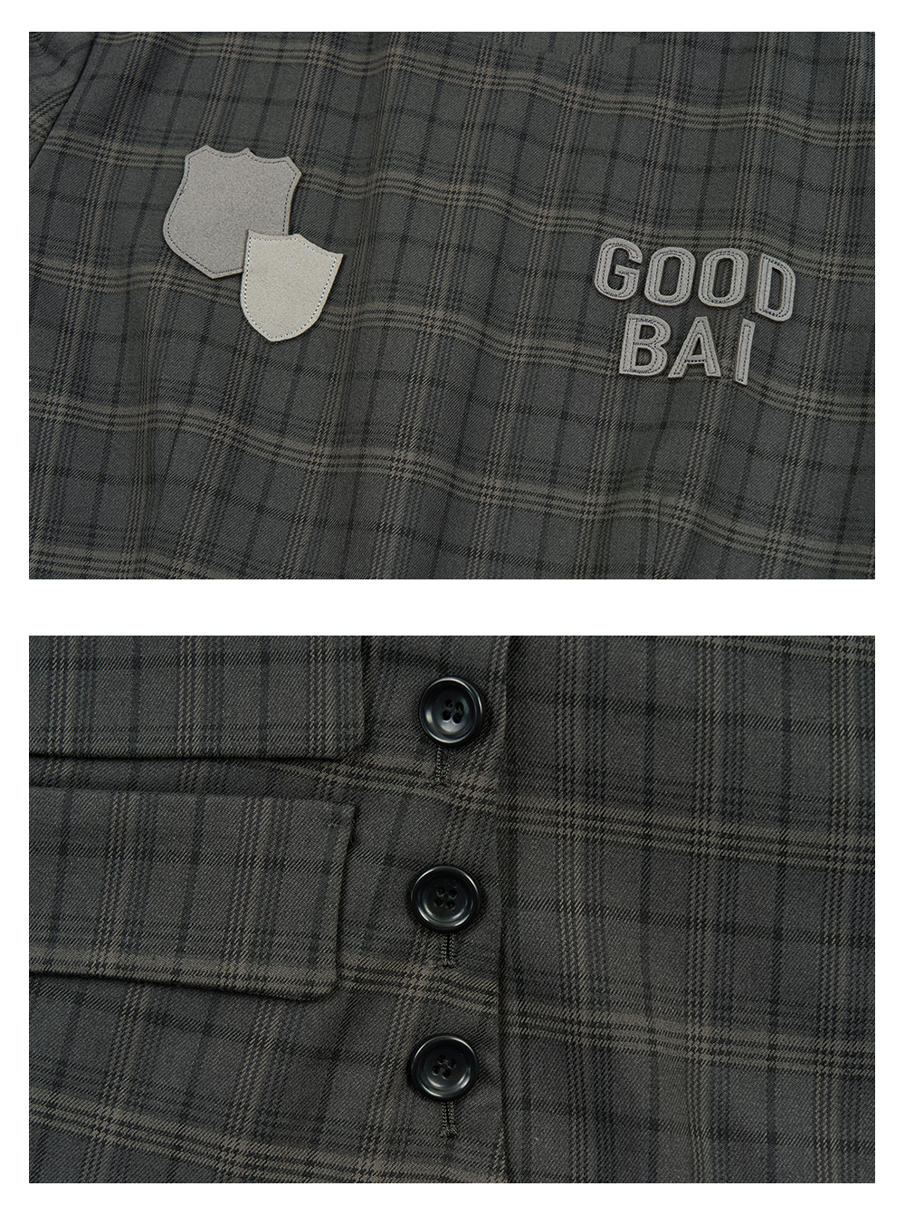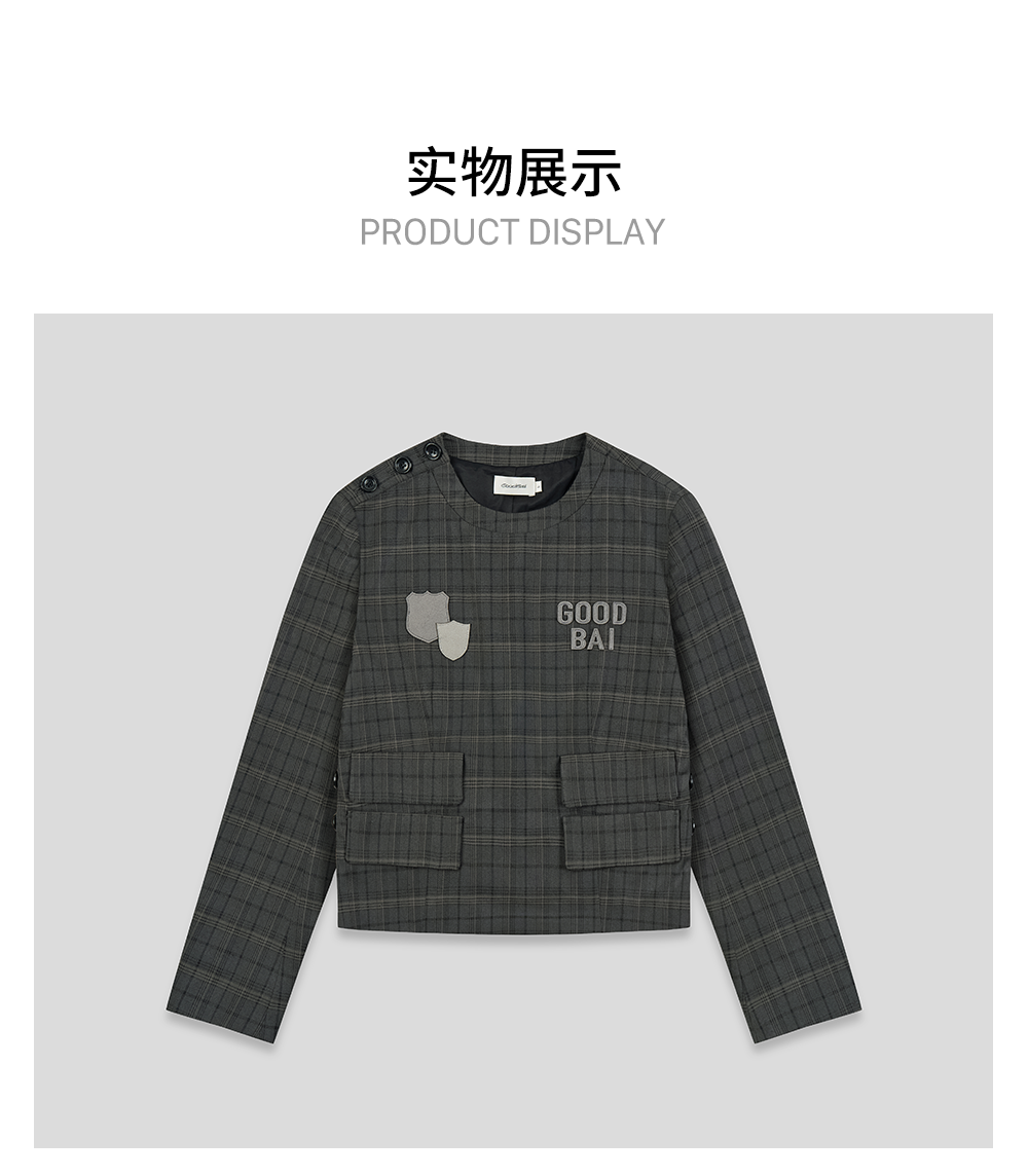 GOODBAI logo徽章剪影贴布绣格纹正肩圆领长袖上衣