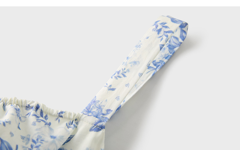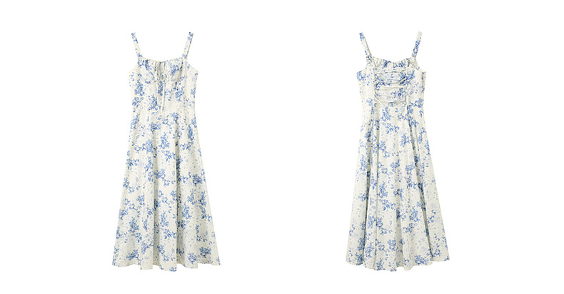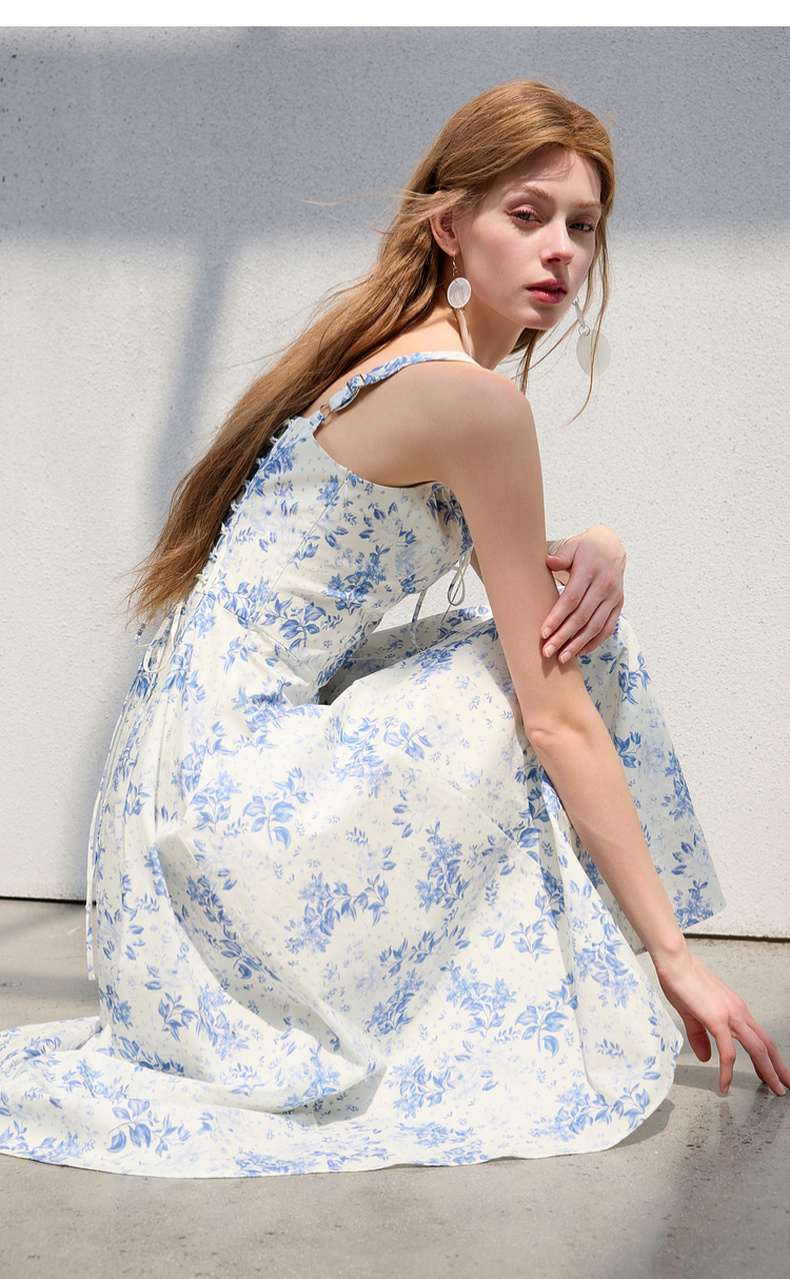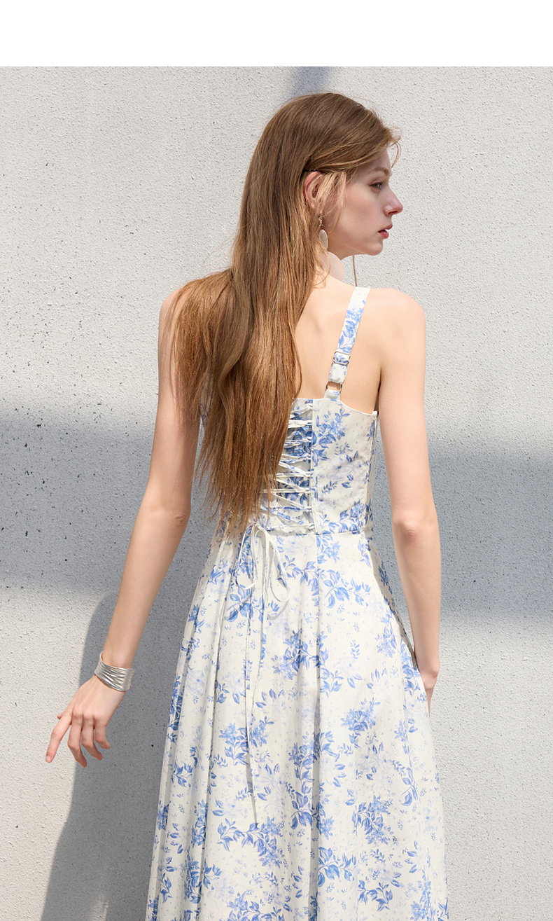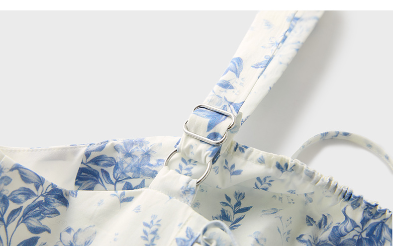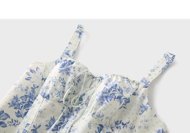 三彩2025夏季新款碎花连衣裙无袖收腰A字裙法式系带吊带裙S