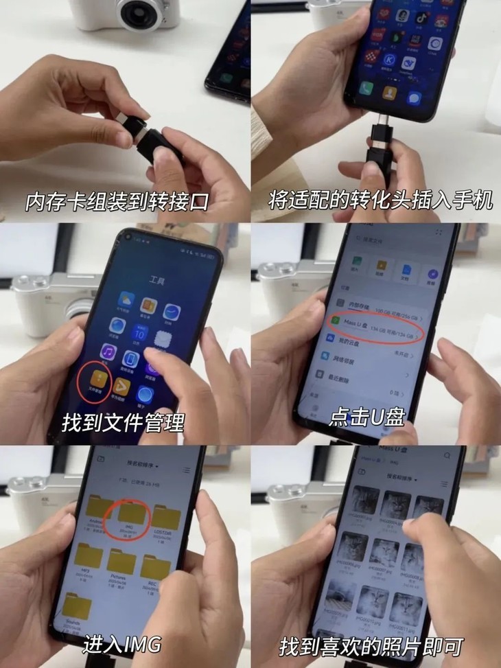 简单来说就是拍完后,从CCD相机拔下读卡器,插入读卡器,再把转接头插入手机或者电脑,就可以导入照片,修图或者发朋友圈了!