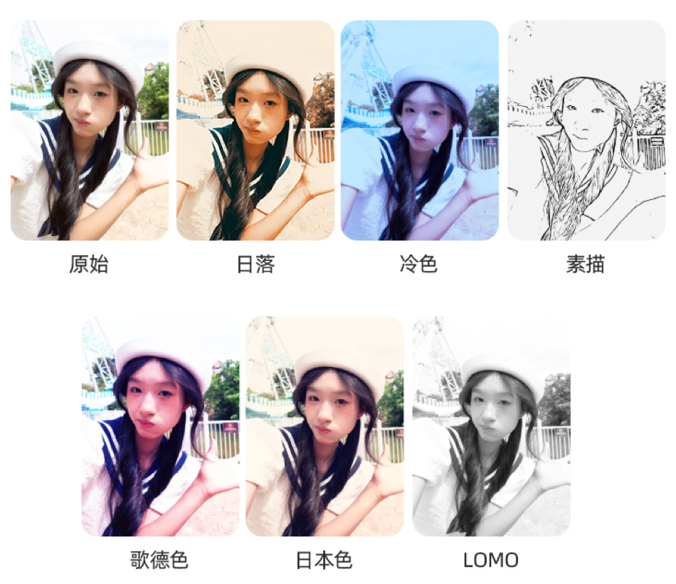 4种美颜滤镜,无论是清新日系风,还是甜酷欧美风,都能一键切换,满足你不同的拍摄风格需求。