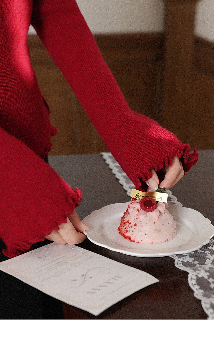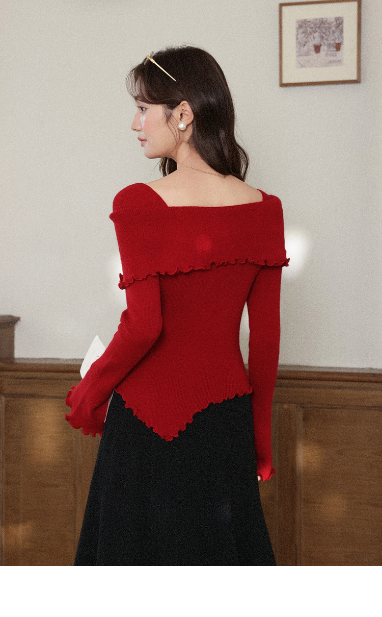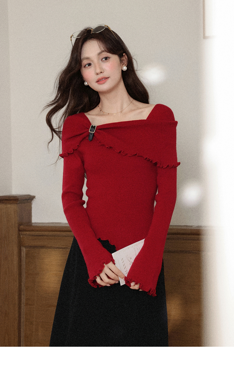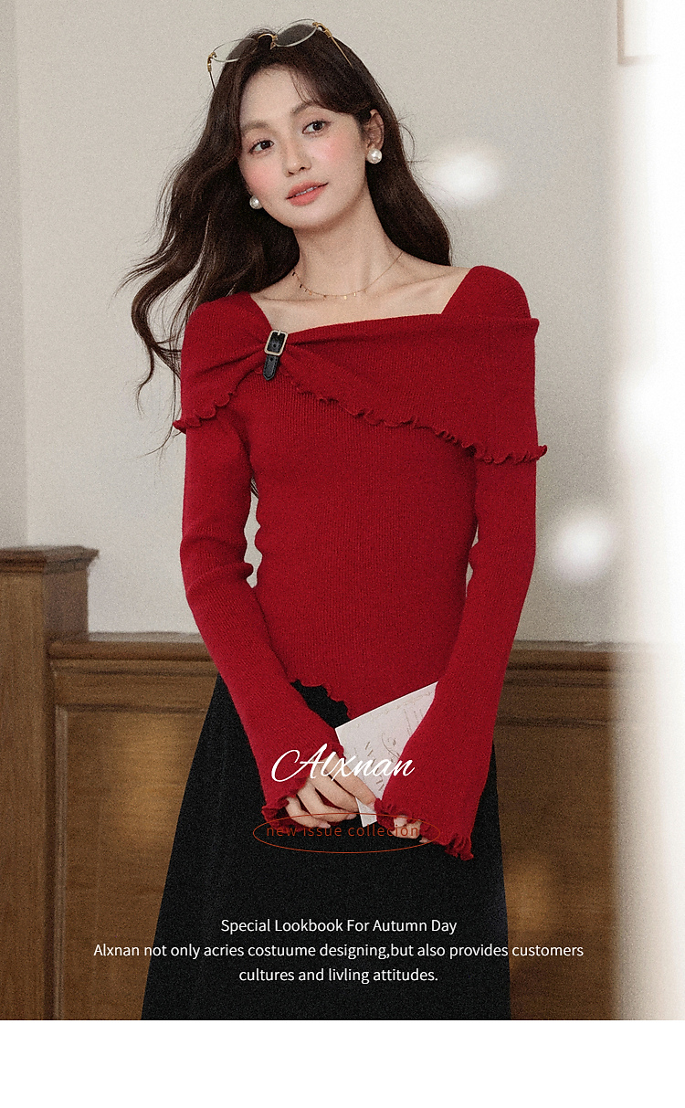 鹿向南「都市丽人」红色长袖毛针织衫秋冬不规则设计感时尚上衣女