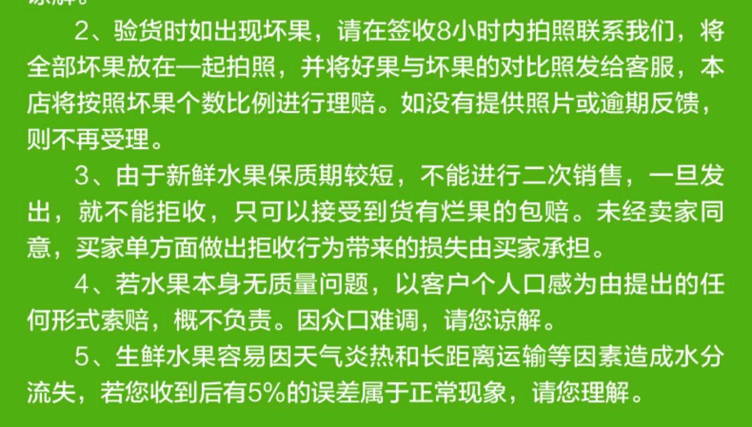 【售后标准】食品生鲜类商品暂不支持7天无理由,请在12小时内签收检查,如有质量问题,请将问题商品+快递面单放一起拍照,在12小时内找客服,超时商家不理赔的呢~感谢您的理解~