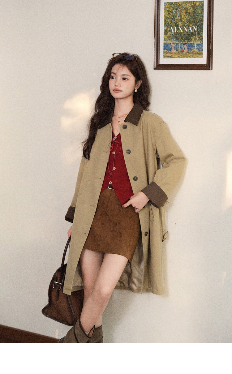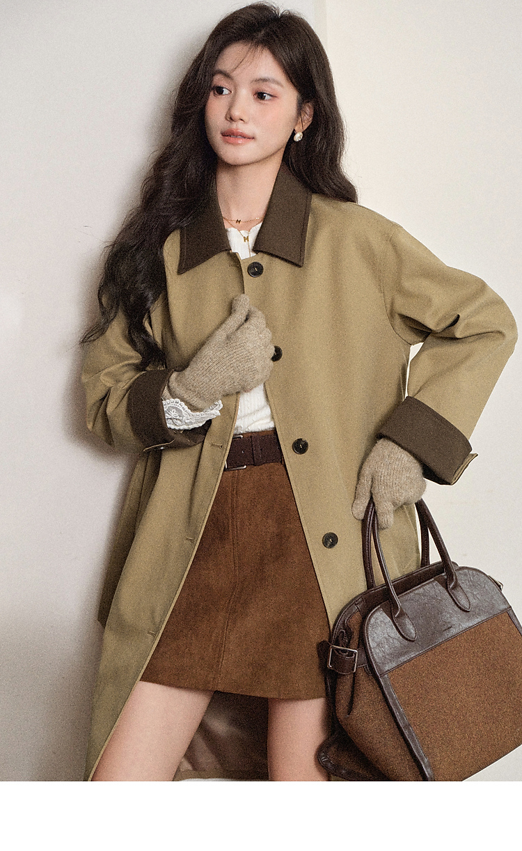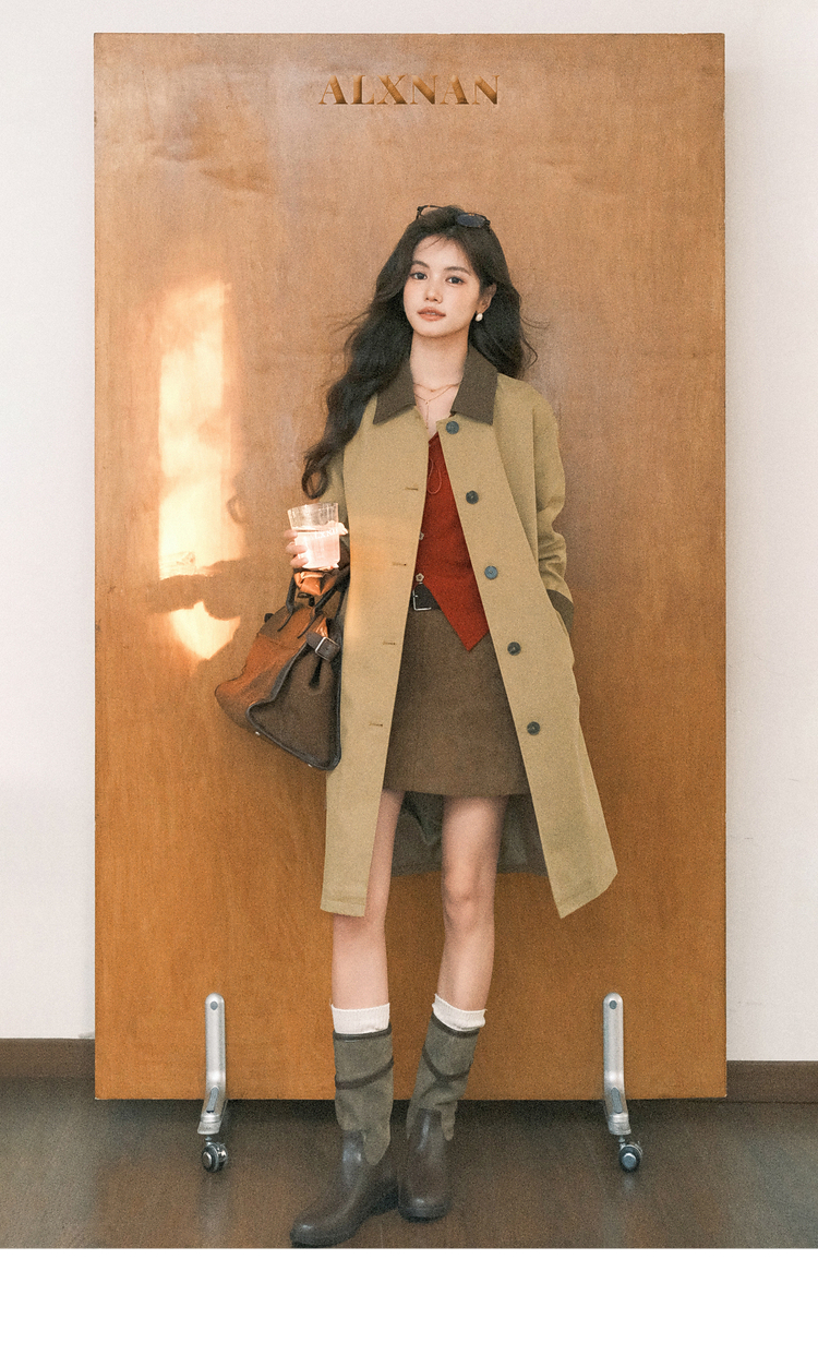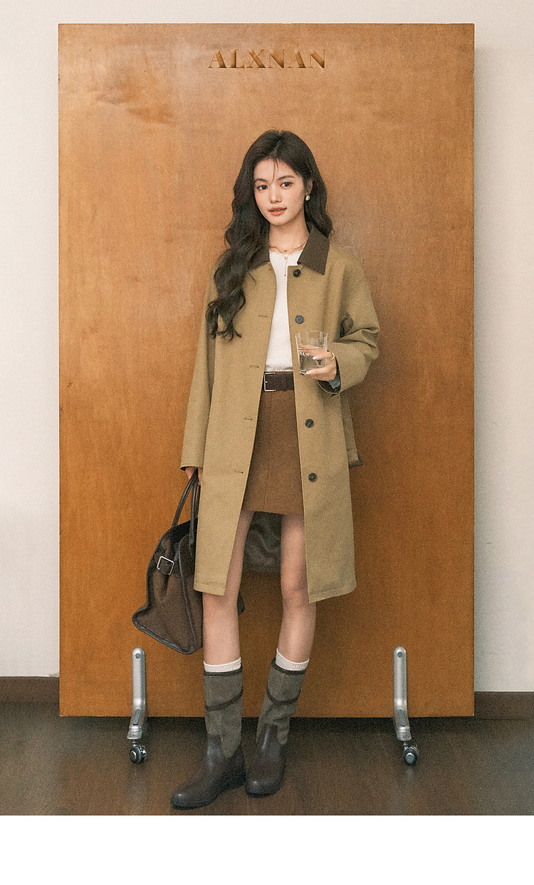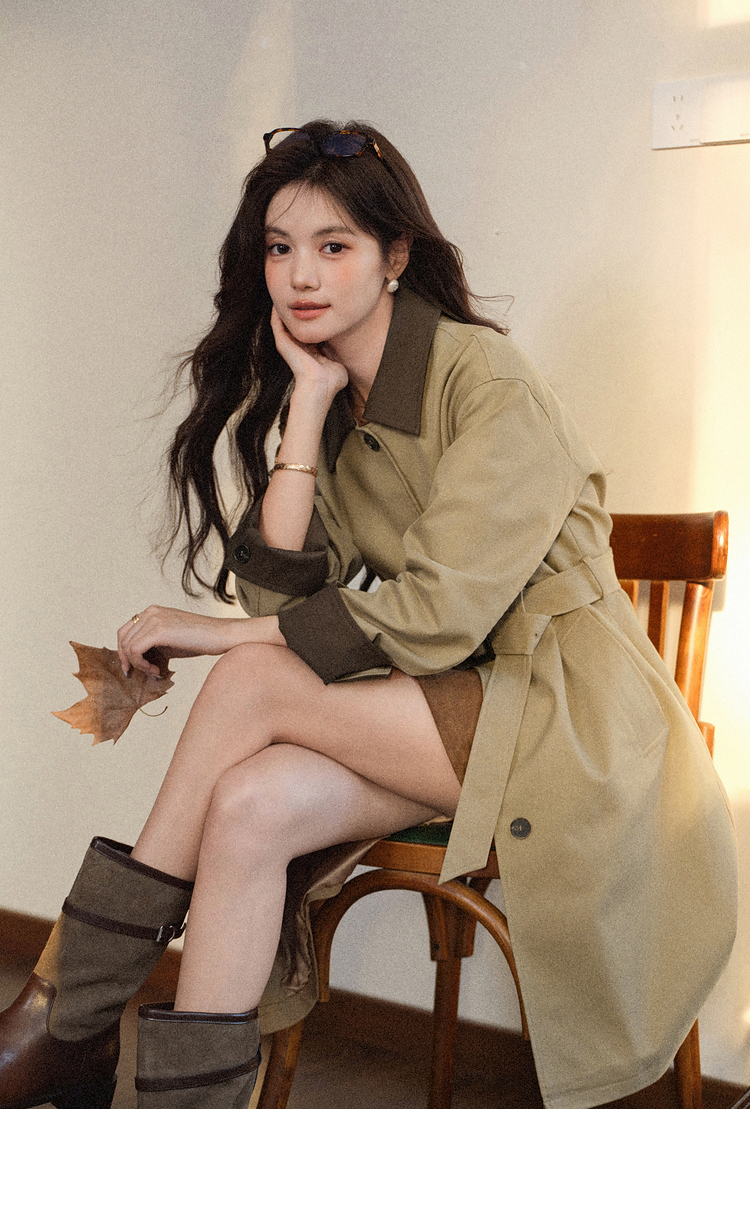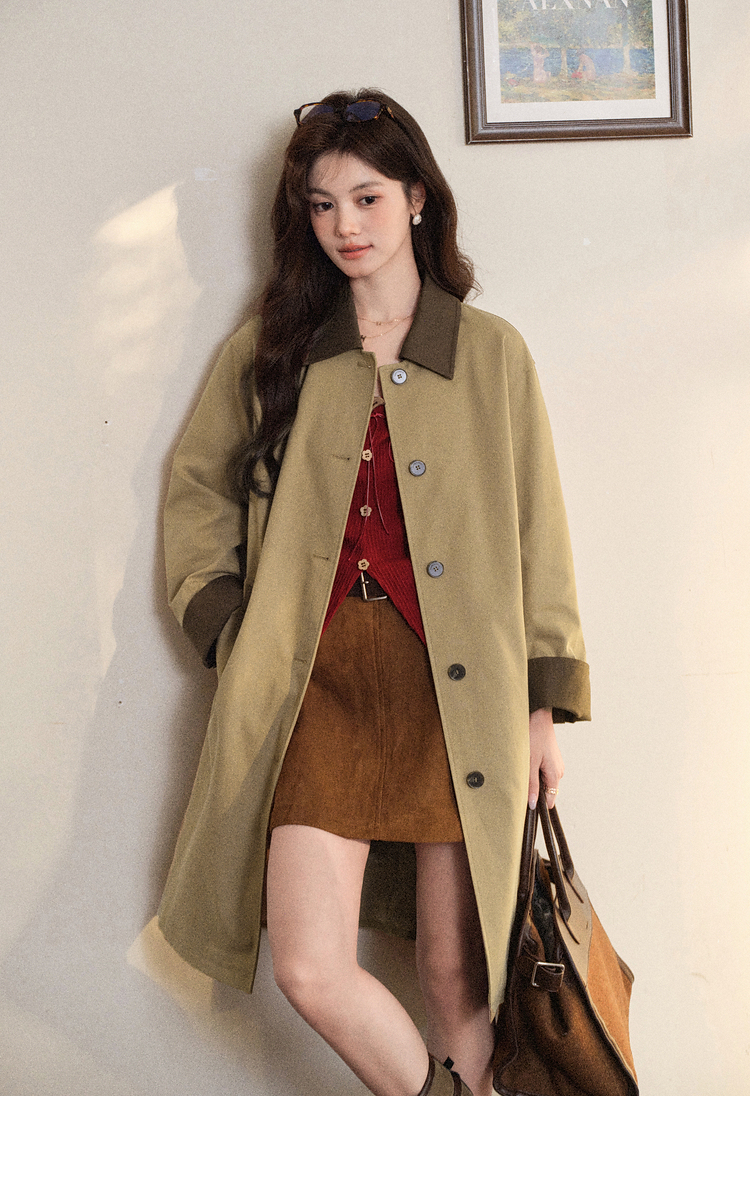 鹿向南「卡莉云拂」气质卡其色中长款拼色风衣女早秋宽松显瘦外套