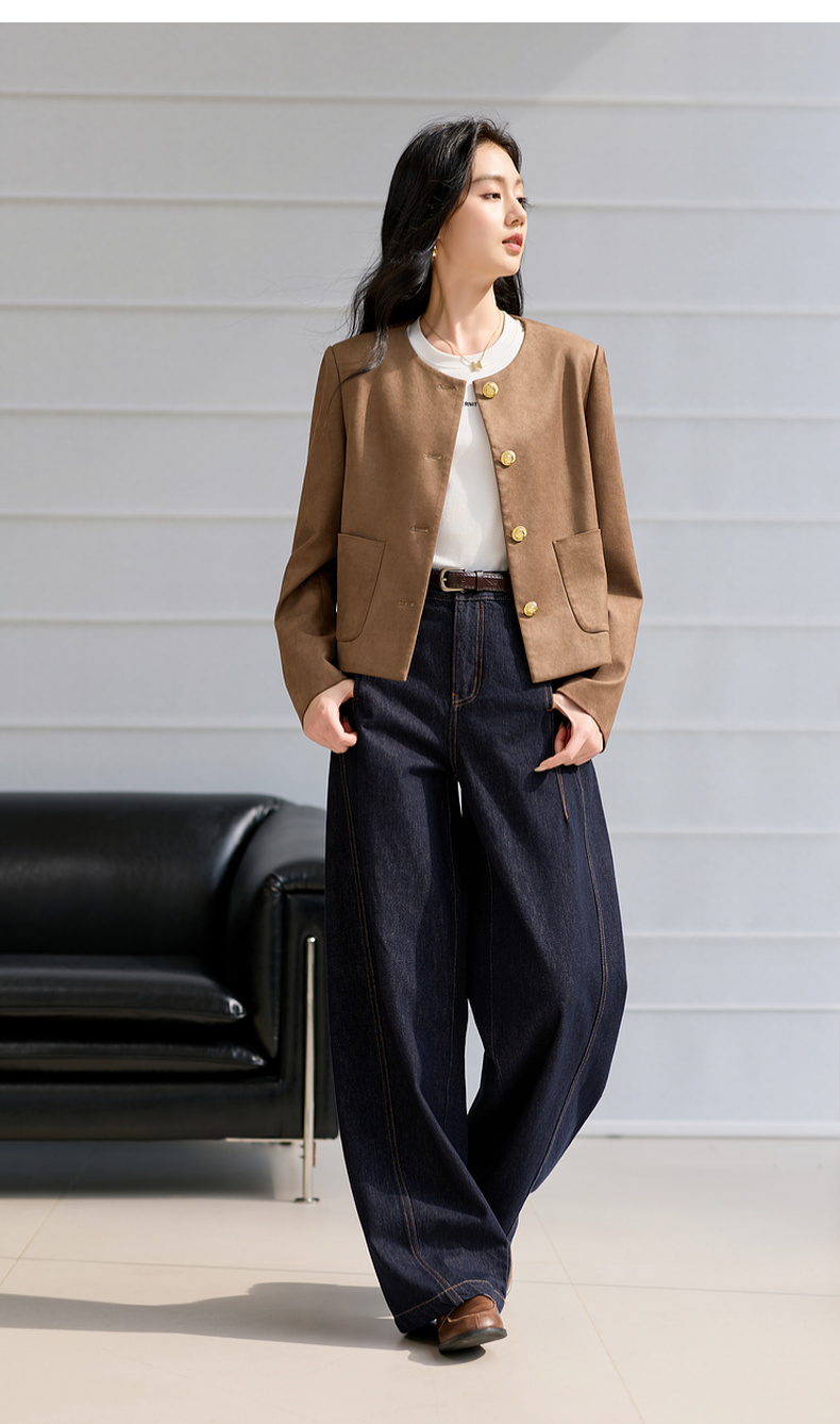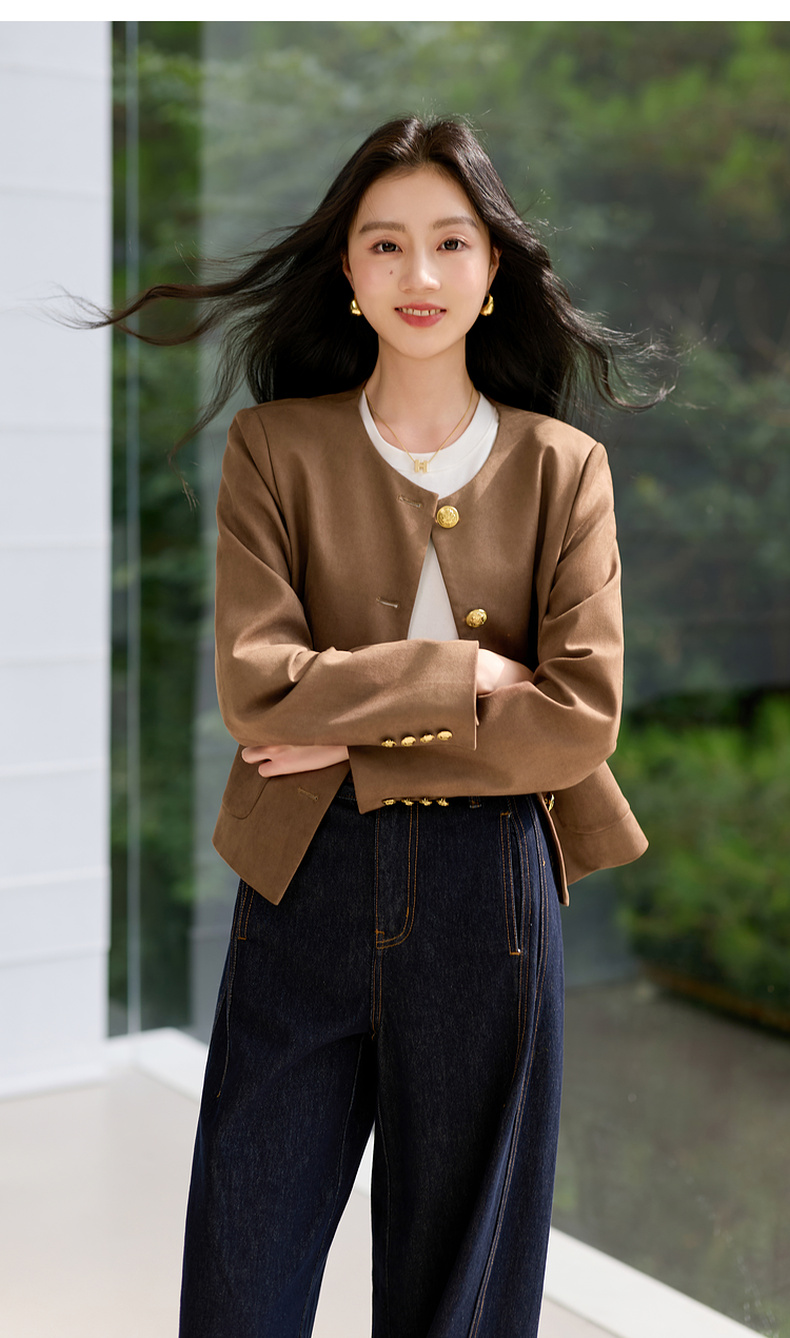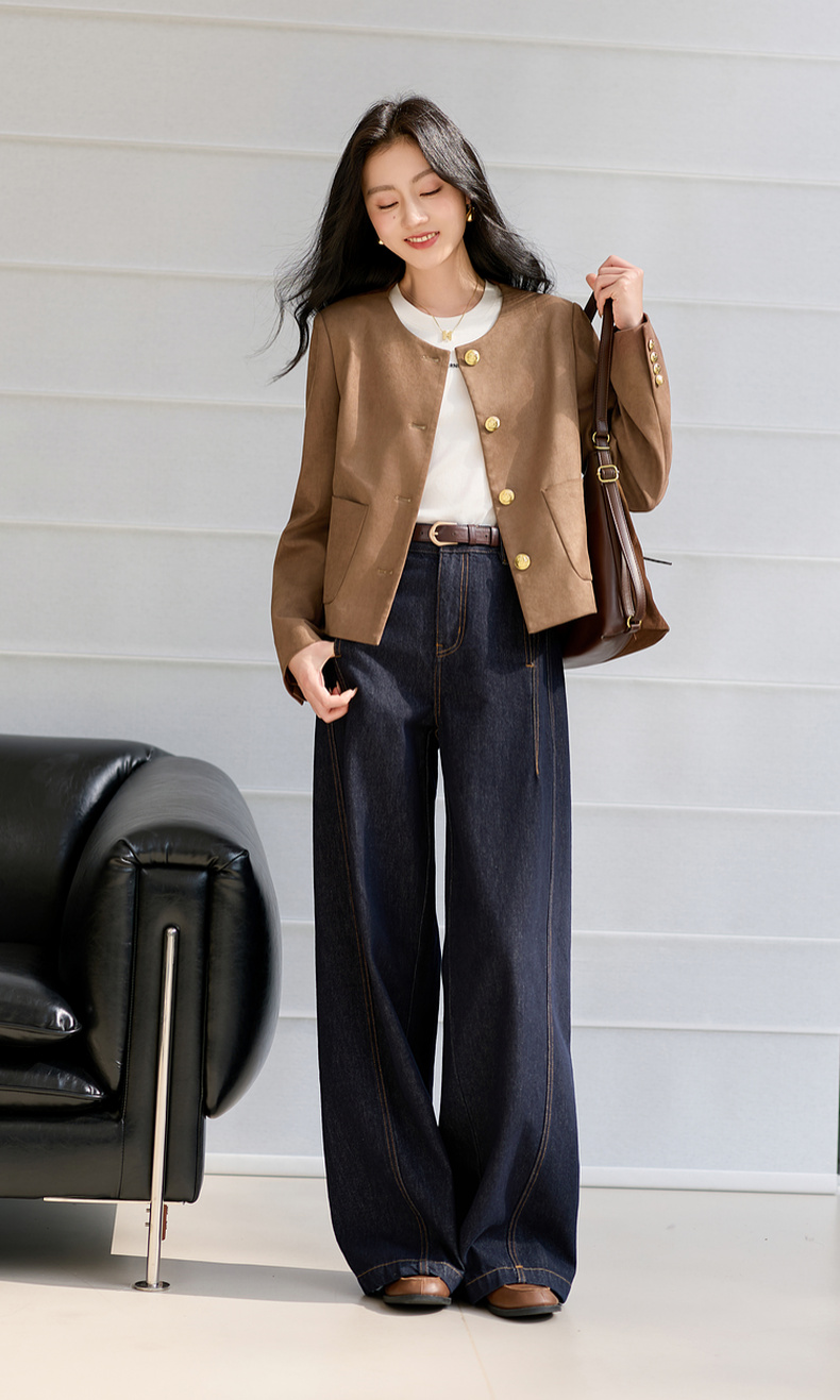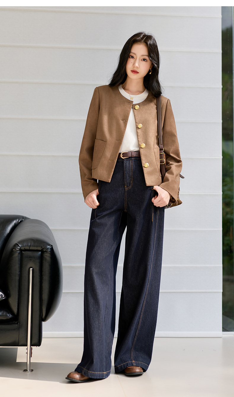三彩2025秋季新款休闲外套仿麂皮绒正肩长袖开衫上衣复古S