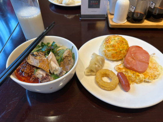 早餐是自助式,菜品丰富多达 40 多种,包子、馒头、花卷、炒粉、汤粉、粥、小菜、豆浆、鸡蛋等换着吃