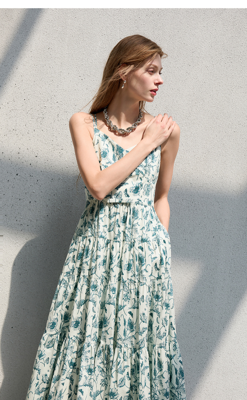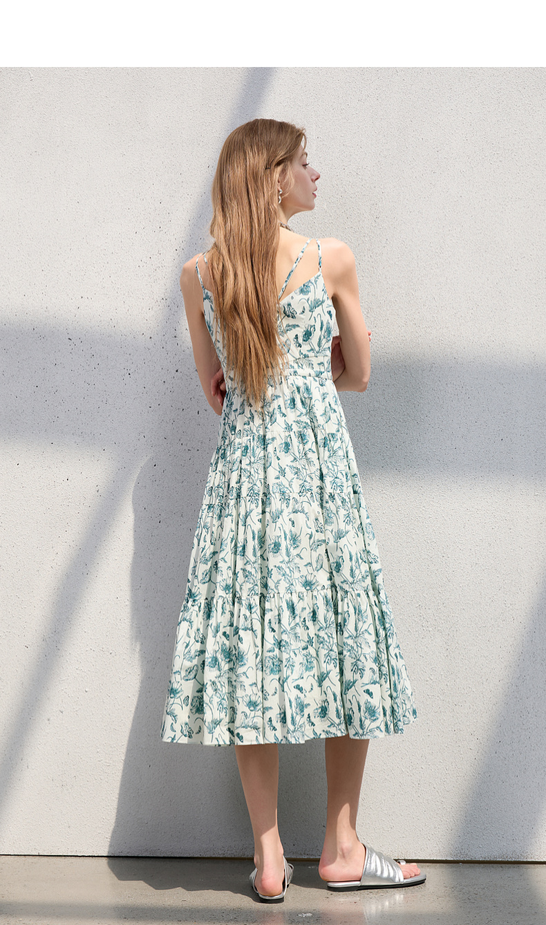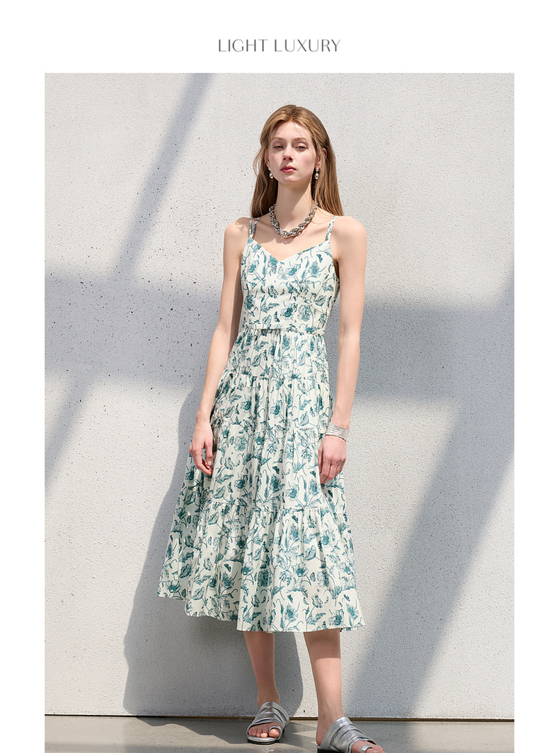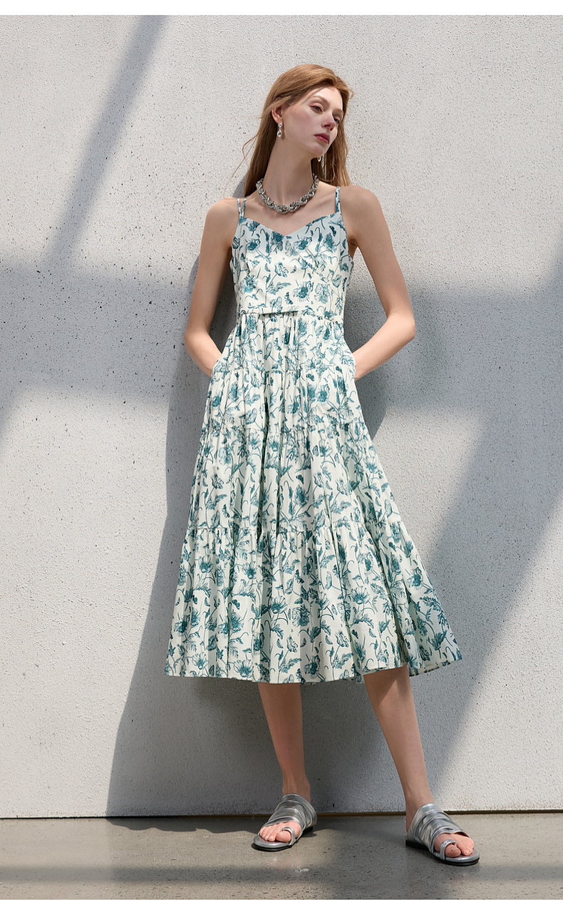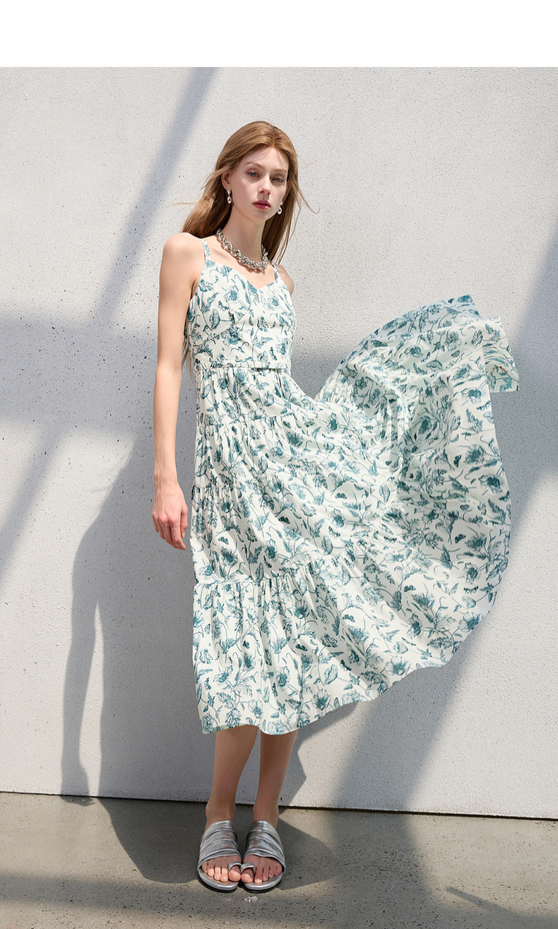 三彩2025夏季新款碎花连衣裙V领吊带裙收腰A字裙蛋糕长裙法式S