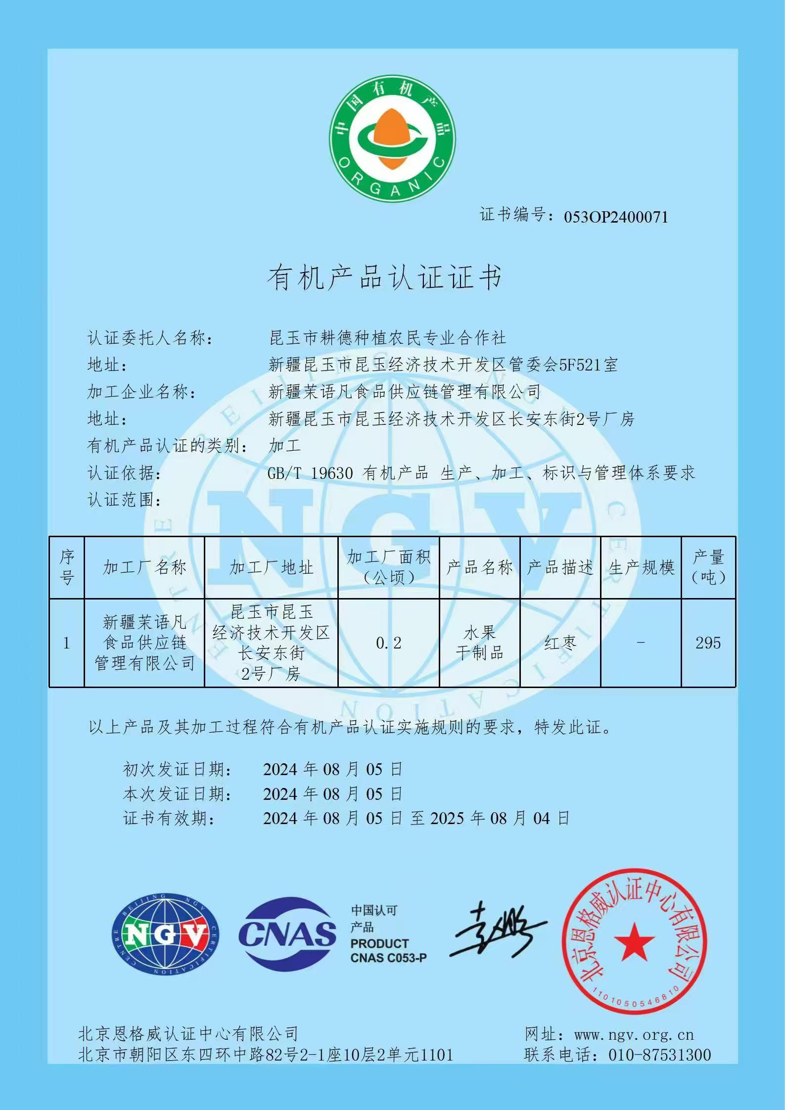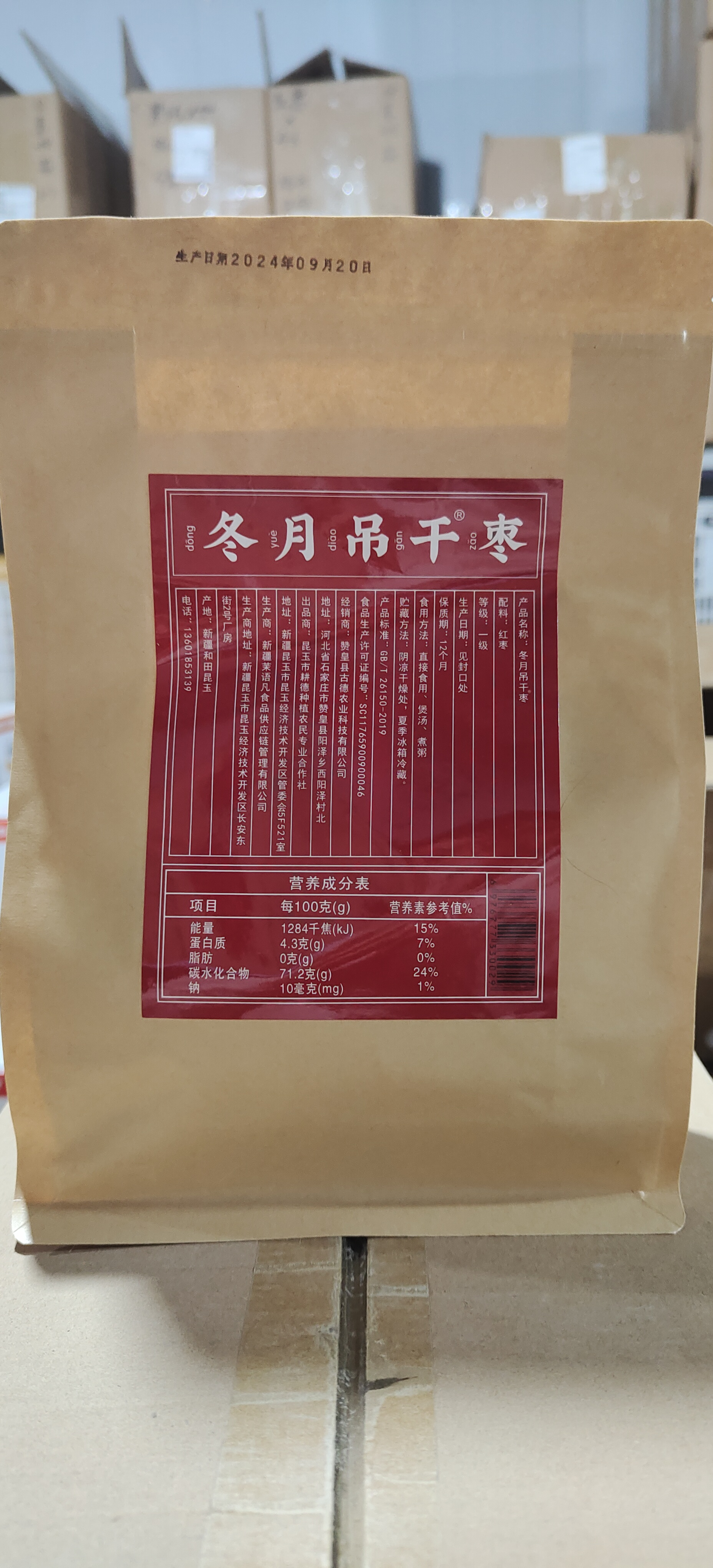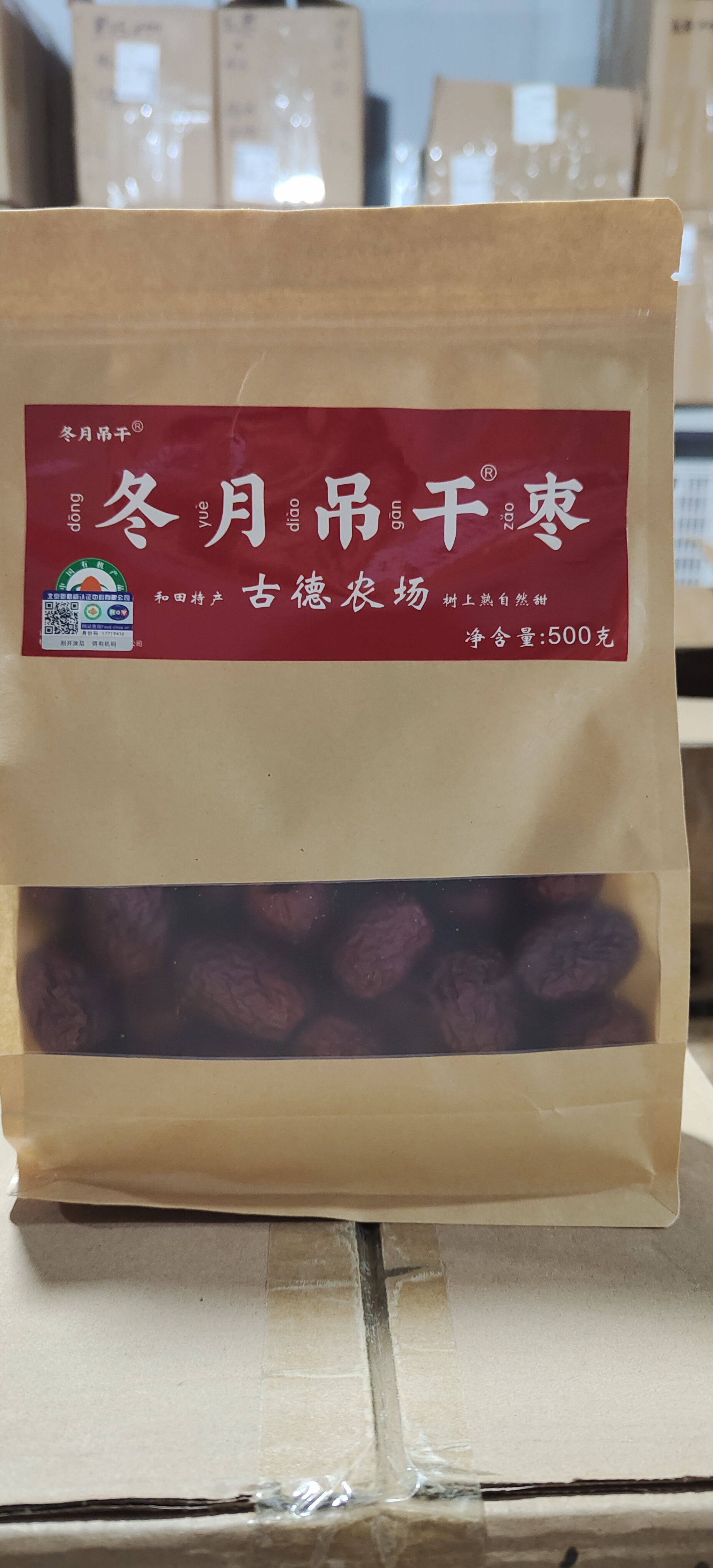 生产方式:冬月吊干枣品种为“金丝大枣”。具有肉质细腻,枣皮软薄,口感软糯甜辣(即“甘辛”入药首选大枣)的特点。在1956年全国枣评会上,被评为“大枣之冠”。冬月吊干枣连续6年通过CSA联盟要求的农残检测,2022年获得有机认证证书