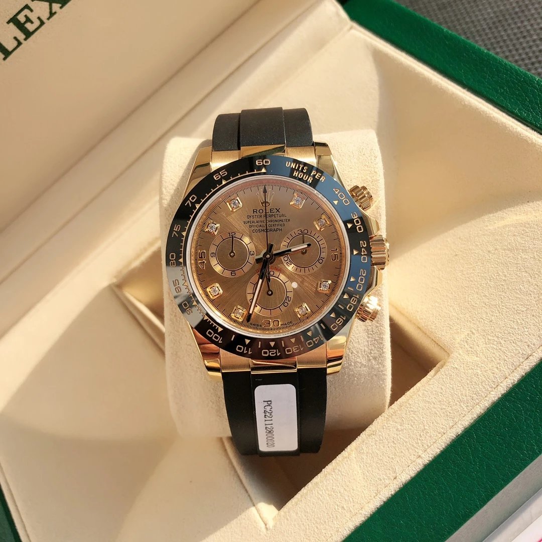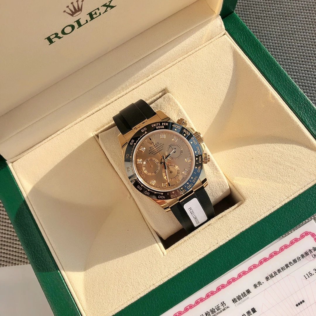 ROLEX-劳力士迪通拿系列。鼎力巨作 ,真真正正整表包金永不掉色。劳力士专利904钢百分百。顶级工艺包金真金含量支持任意检测!每一块腕表均严格检测 搭载超级稳定4130机芯。持GTC中国国检检测证书,联网可查!所有功能原版一致,调时间没有空档,一档调时。计时秒针 3字位9字位小针 功能原装一致!表壳原版开模,表盘尺寸40mm。厚度12.4正品原版一样12.4厚度。陶质实心外圈连计速刻度(采用真陶瓷工艺 刮不花 永bu退色 质感和正品一致)功能盘字体和盘面logo采用叠加印刷工艺,从侧面观察会有微微隆起之感。盘面的底色纹路经过无数次过滤改正,确保百分百吻合与原装其上的劳力士904钢金属LOGO单独开模,无论是立体感还是圆润度均可PK原装 易读Chroma light夜光显示 配长效夜光物质。表镜平形蓝宝石水晶玻璃 抗刮损,效果绝不重影,吻合正品六字位正品一致的有防伪的小皇冠(注意细节)表扣采用进口精钢1:1散件打磨而成 拉沙内侧 腐蚀劳力士钢印 外置正品一模一样的表扣保险环,完美在每一个细节!配全套顶级包装!不满意支持退换,终身保修!