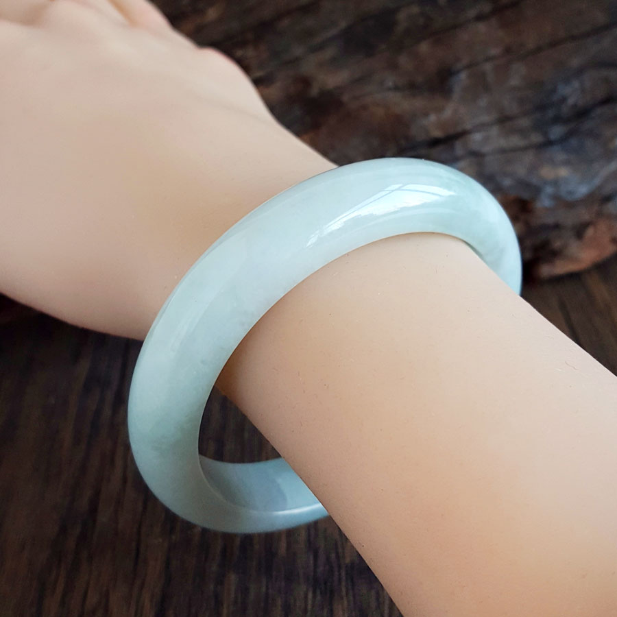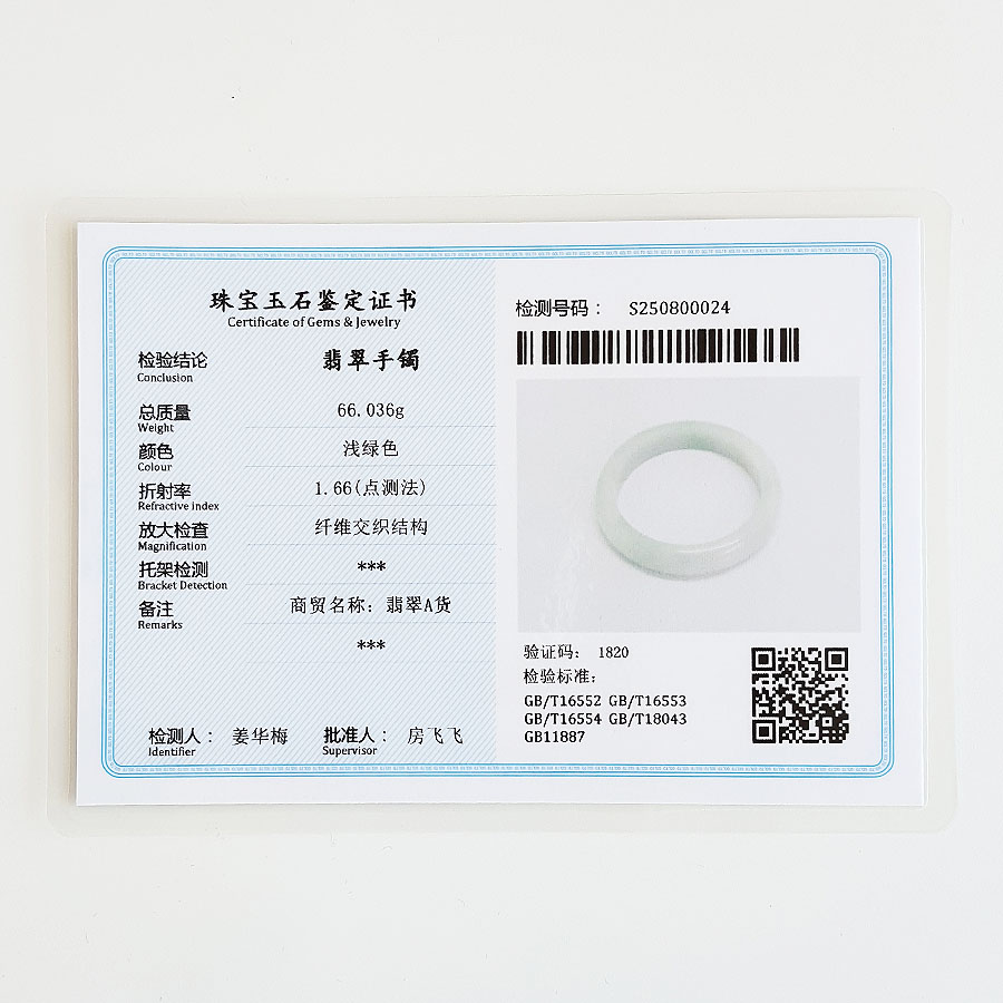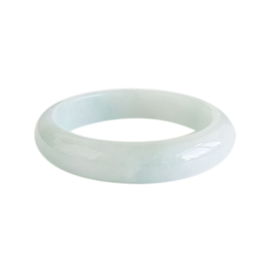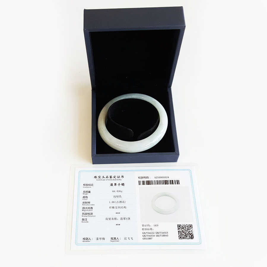 名称 | 天然细腻无纹裂正桩细豆种58.5号青白含绿翡翠手镯 |