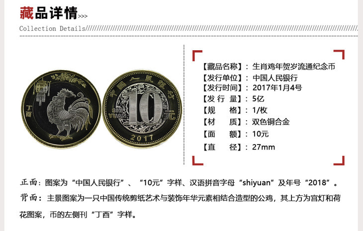 鸡年纪念币 面值10元 2017年发行