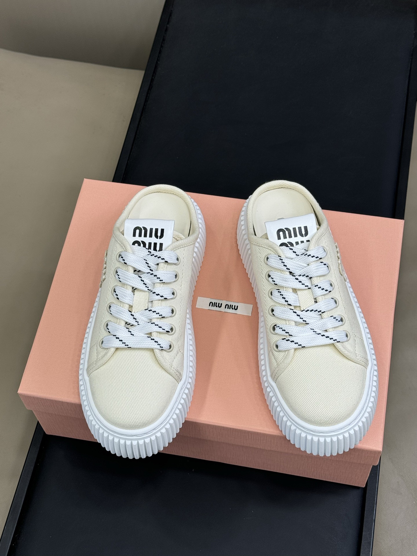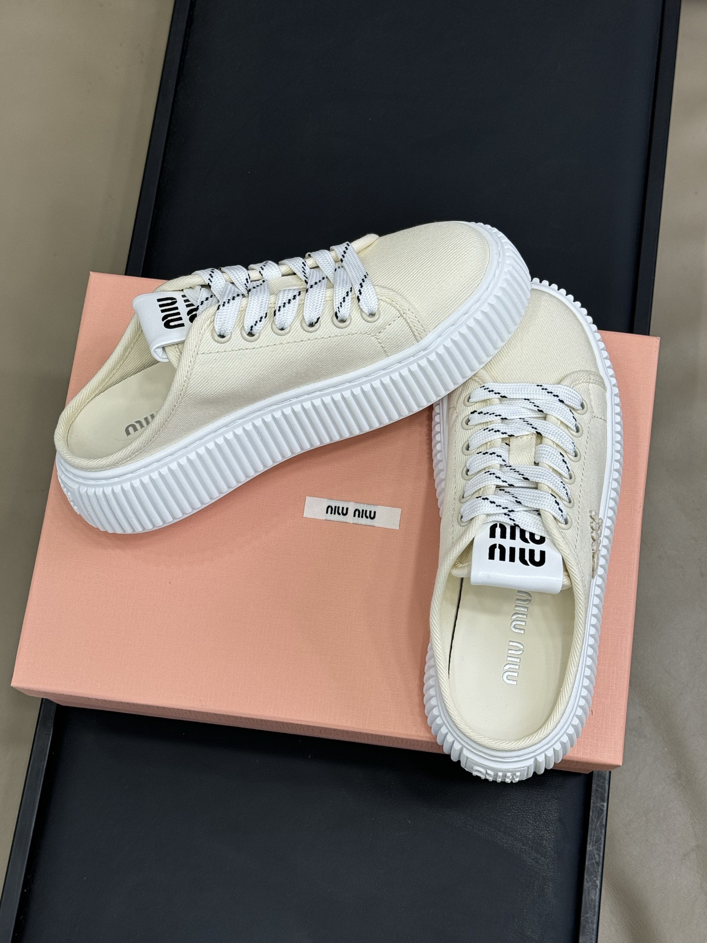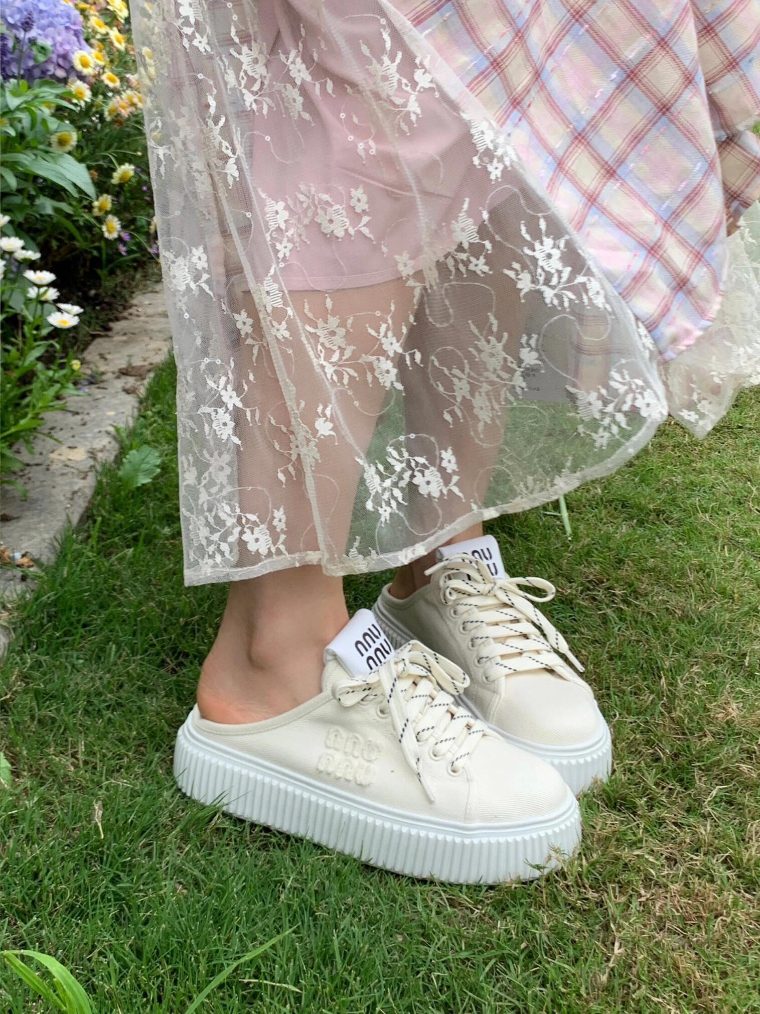 缪缪·miumiu 春夏时尚新品,厚底轻便增高半托小白鞋 体现了Miu Miu 的大胆特色,尽展女士魅力,简约线条 ,别致徽标饰于鞋舌点缀,现代风格简约高级 轻松搭配,尽显女士风彩