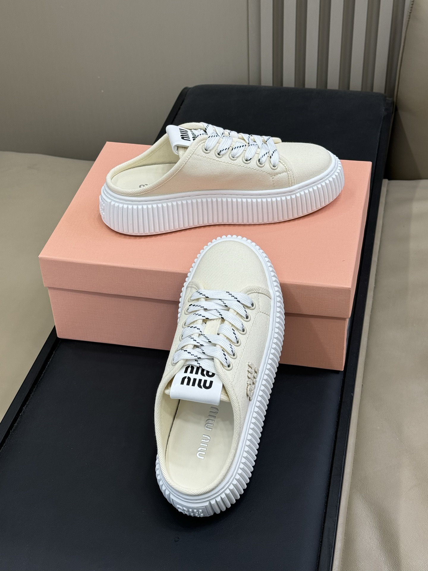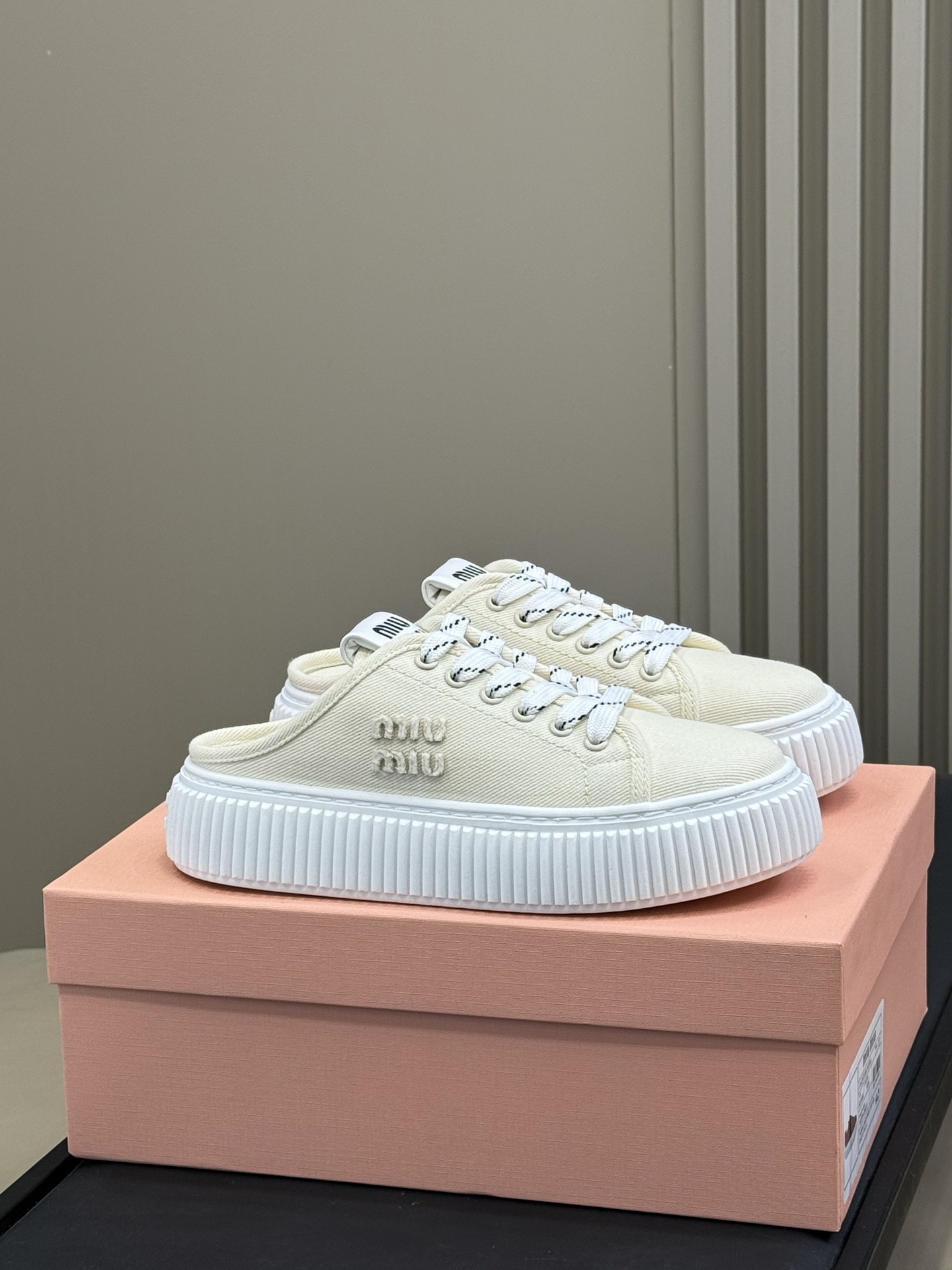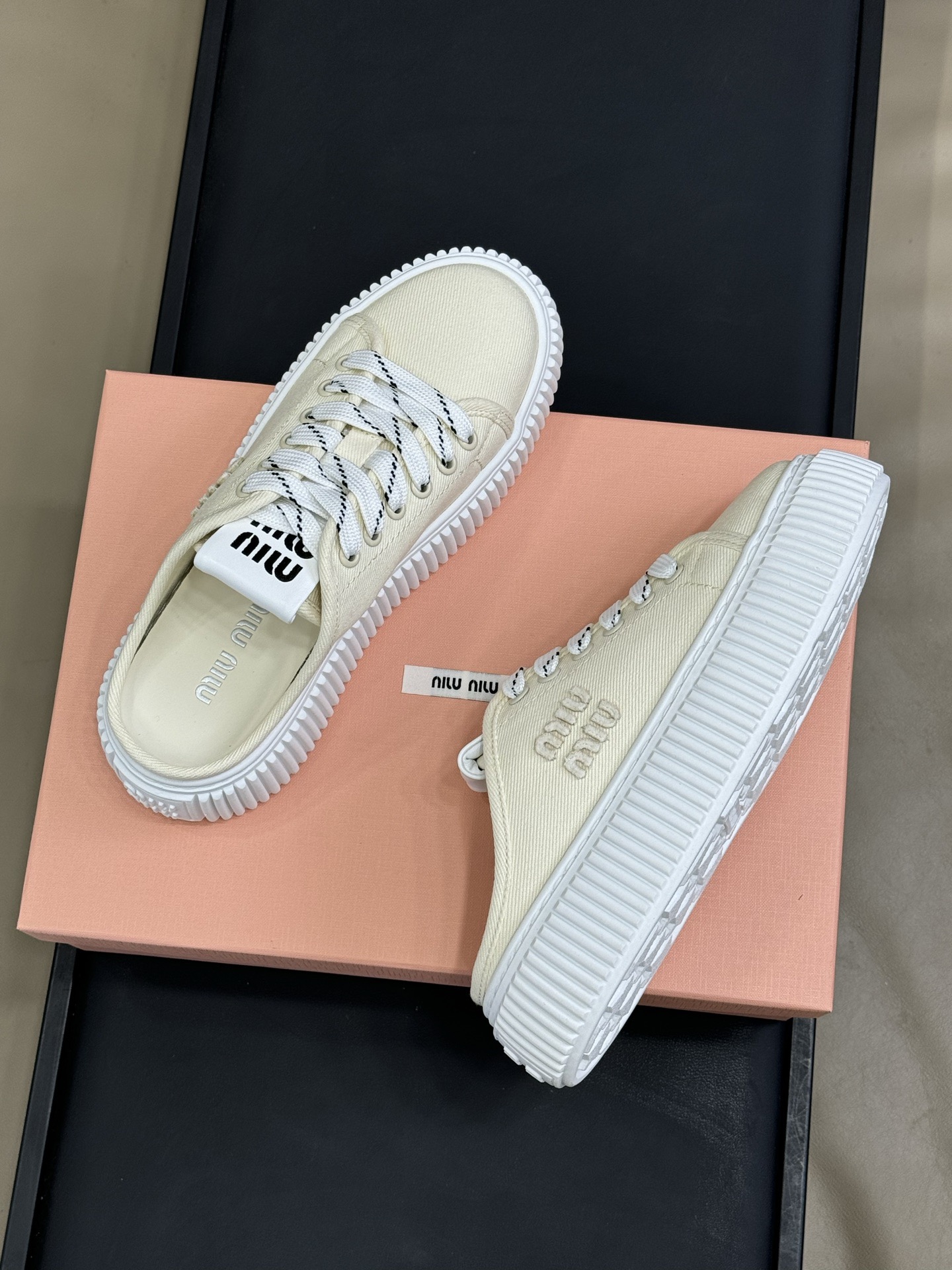 缪缪·miumiu 春夏时尚新品,厚底轻便增高半托小白鞋 体现了Miu Miu 的大胆特色,尽展女士魅力,简约线条 ,别致徽标饰于鞋舌点缀,现代风格简约高级 轻松搭配,尽显女士风彩