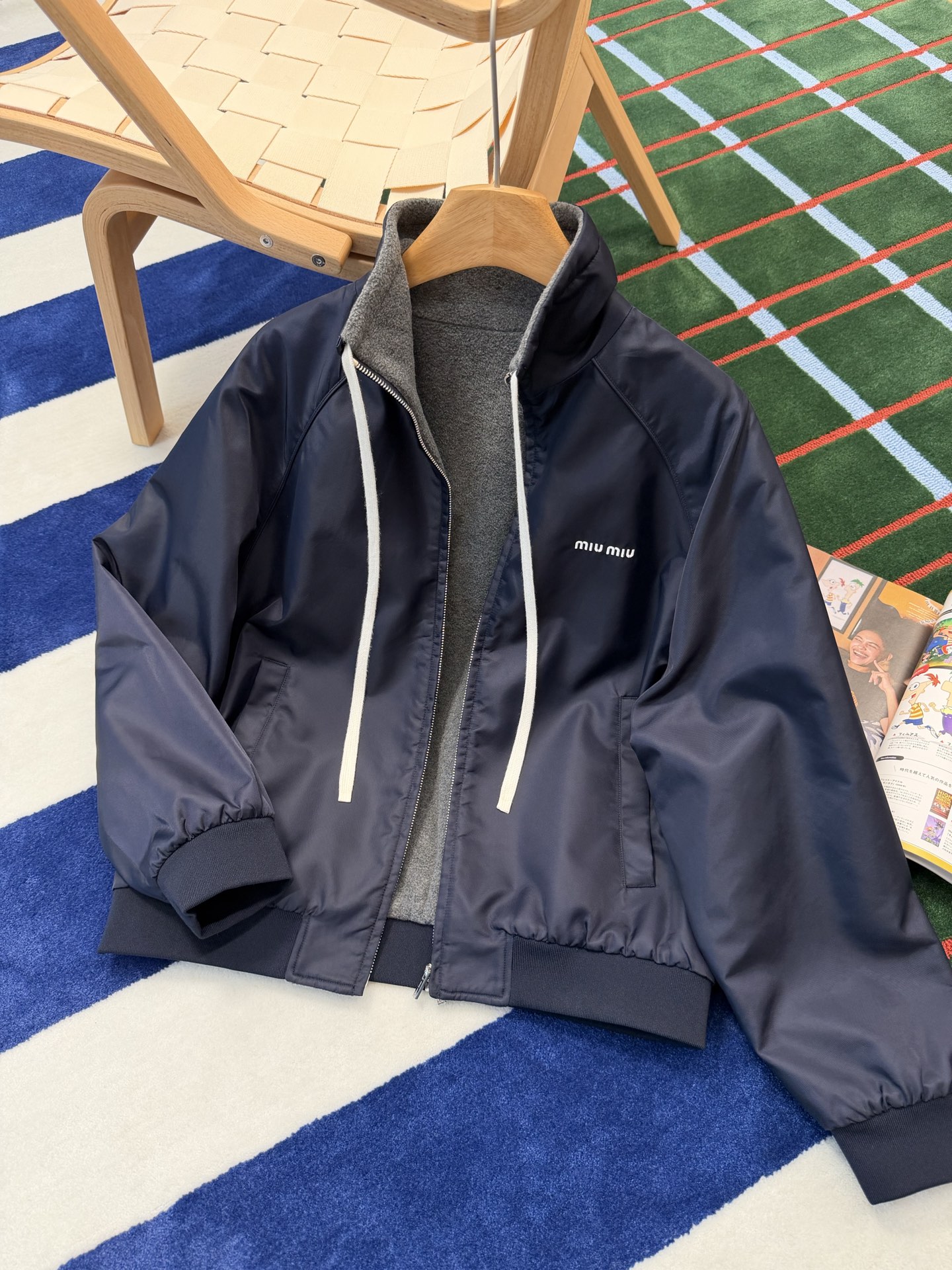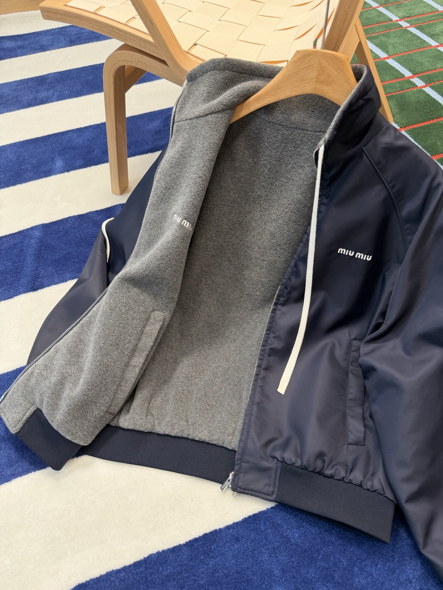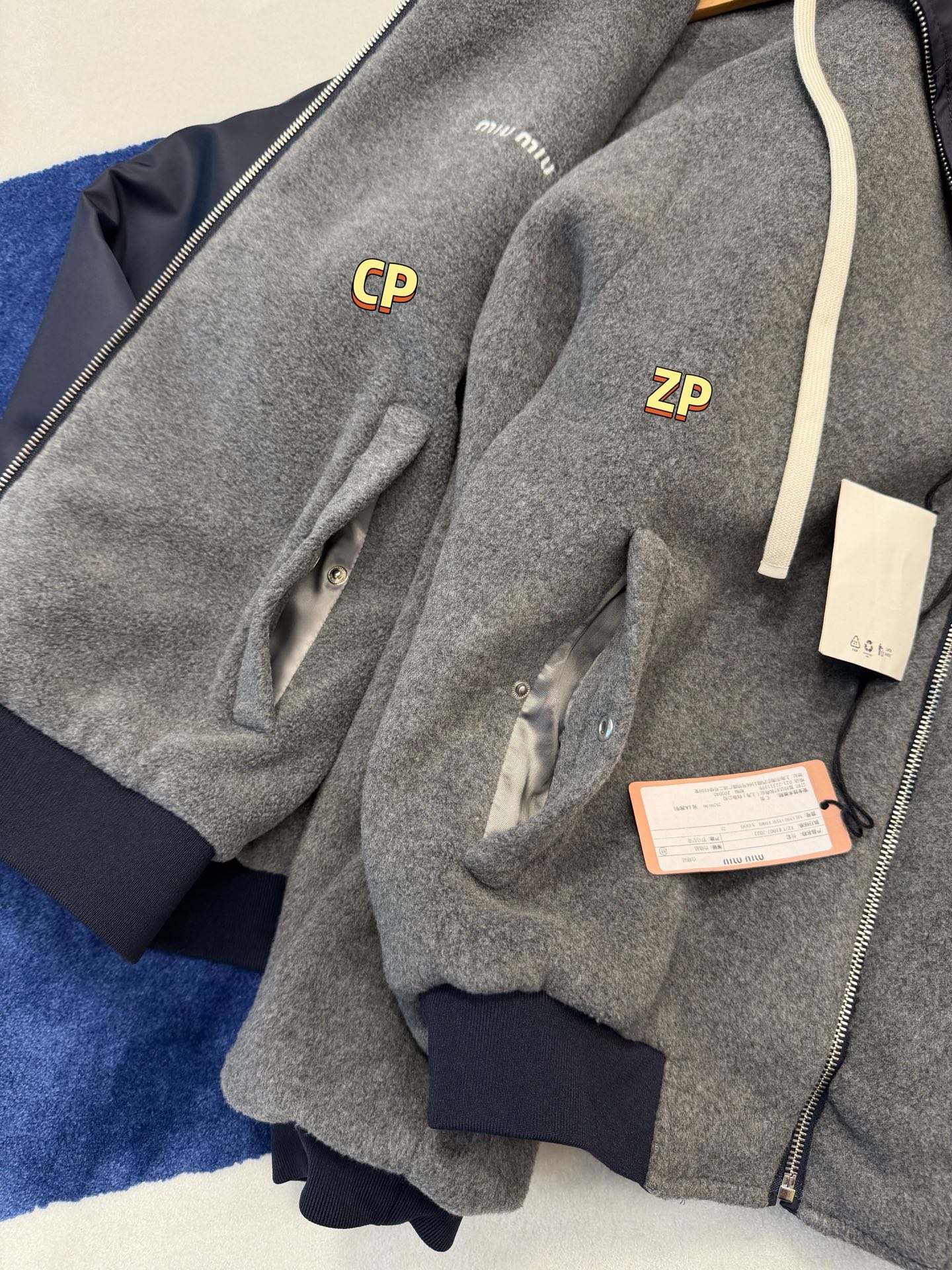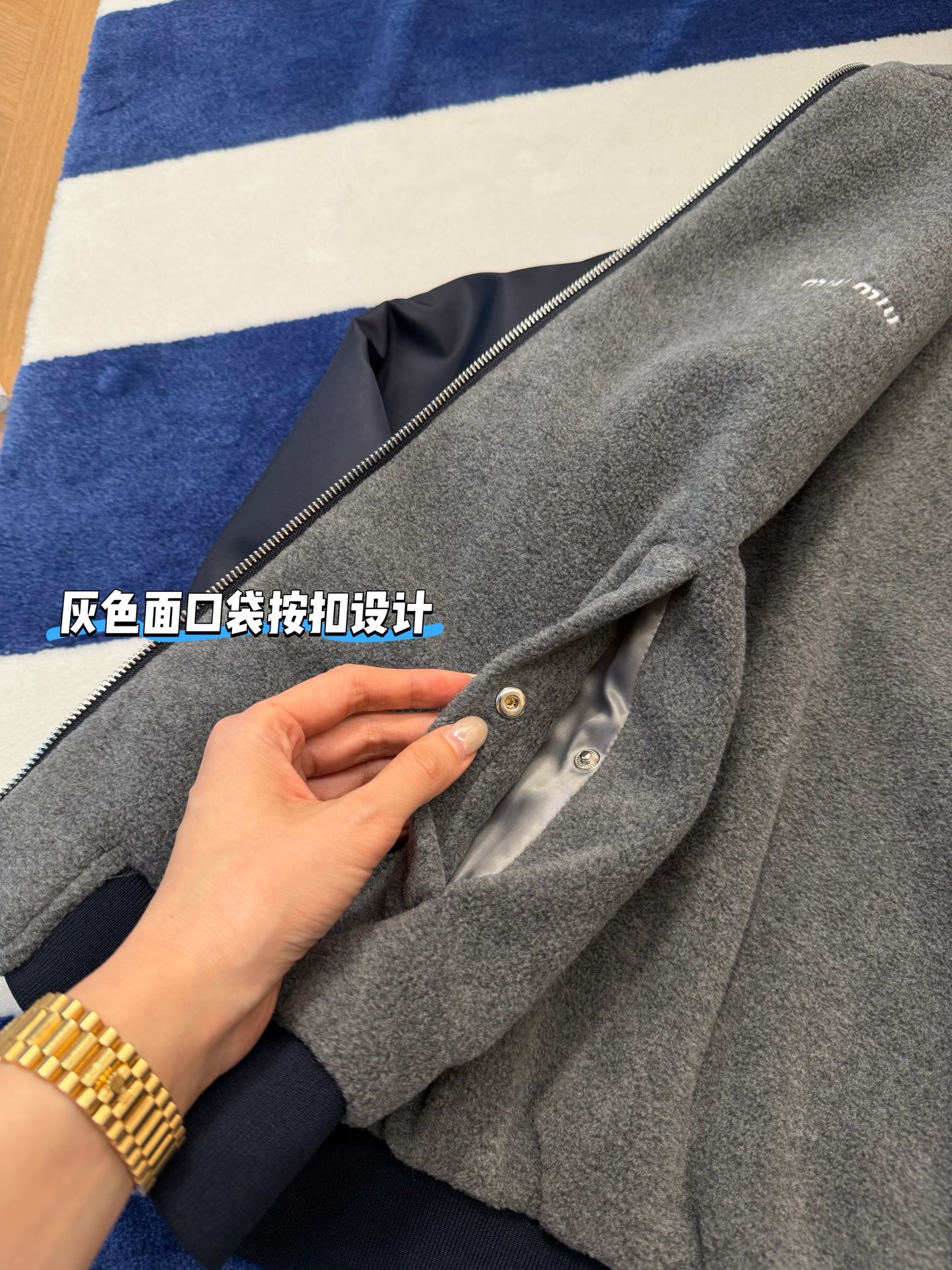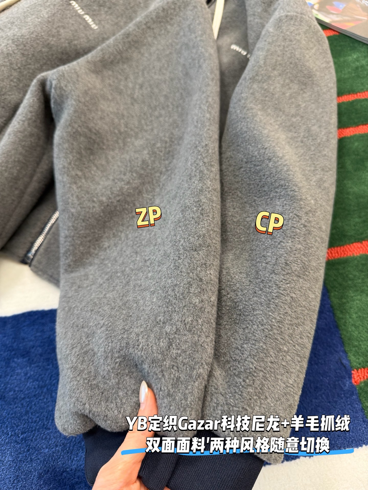 最最最新款 双面穿外套💫一件等于两件衣服的快乐,保暖又好看,慵懒时髦感, 科技Gazar面料与羊毛软料相结合➕这款双面飞行员夹克传递舒适感和酷炫态度✨ 胸前饰有刺绣,拿到手才知道有多香,两面完全是两种风格,一面是软糯糯的灰色摇粒绒手感巨舒服,像裹着云朵走路秋冬氛围感直接拉满,翻过来是酷酷的蓝色尼龙面立马变身街头辣妹风,版型宽松但不臃肿藏肉显瘦一绝 ✔️两面都有口袋实用性满分〰️姐妹们一定要拥有😜码数SML