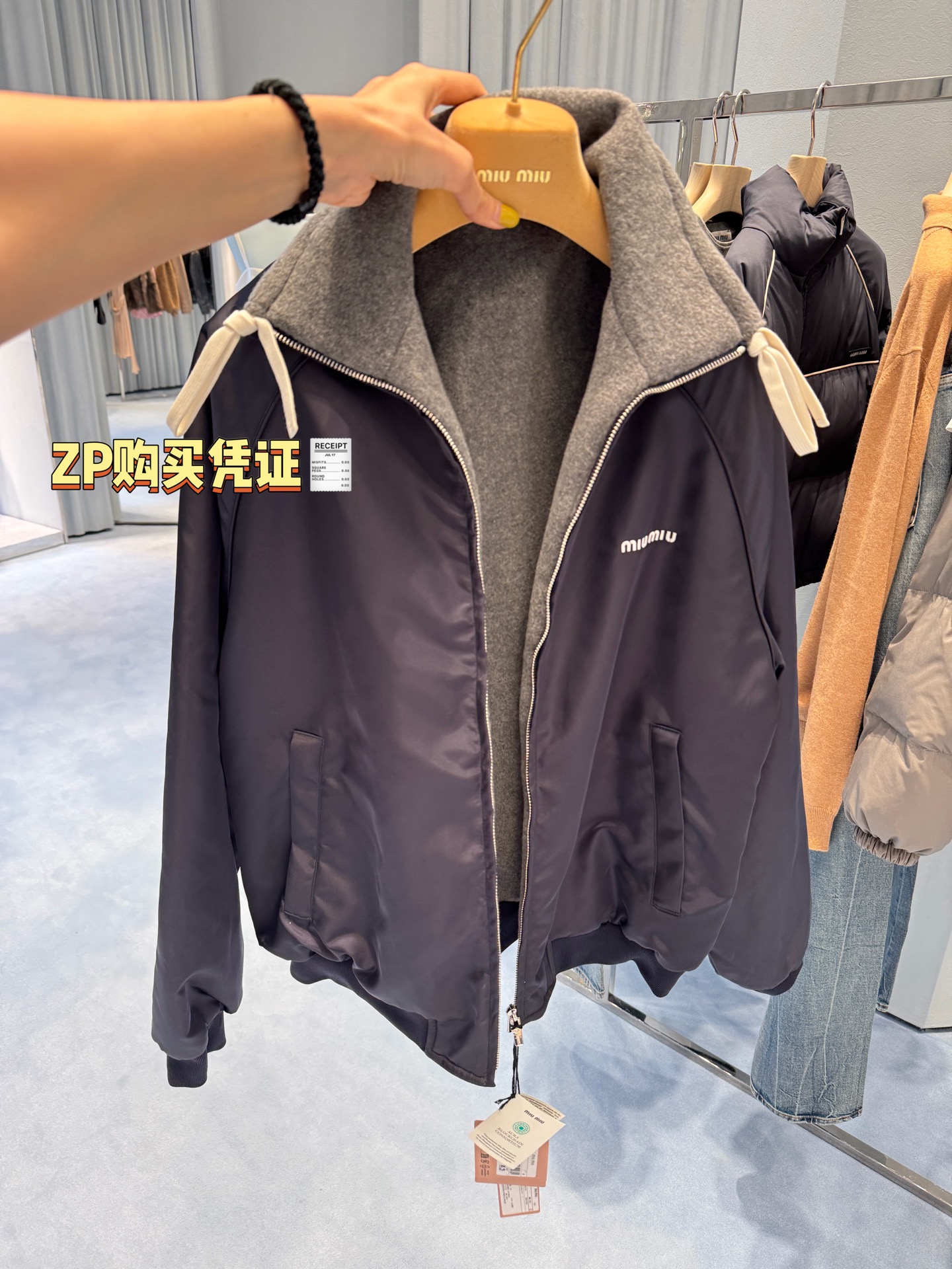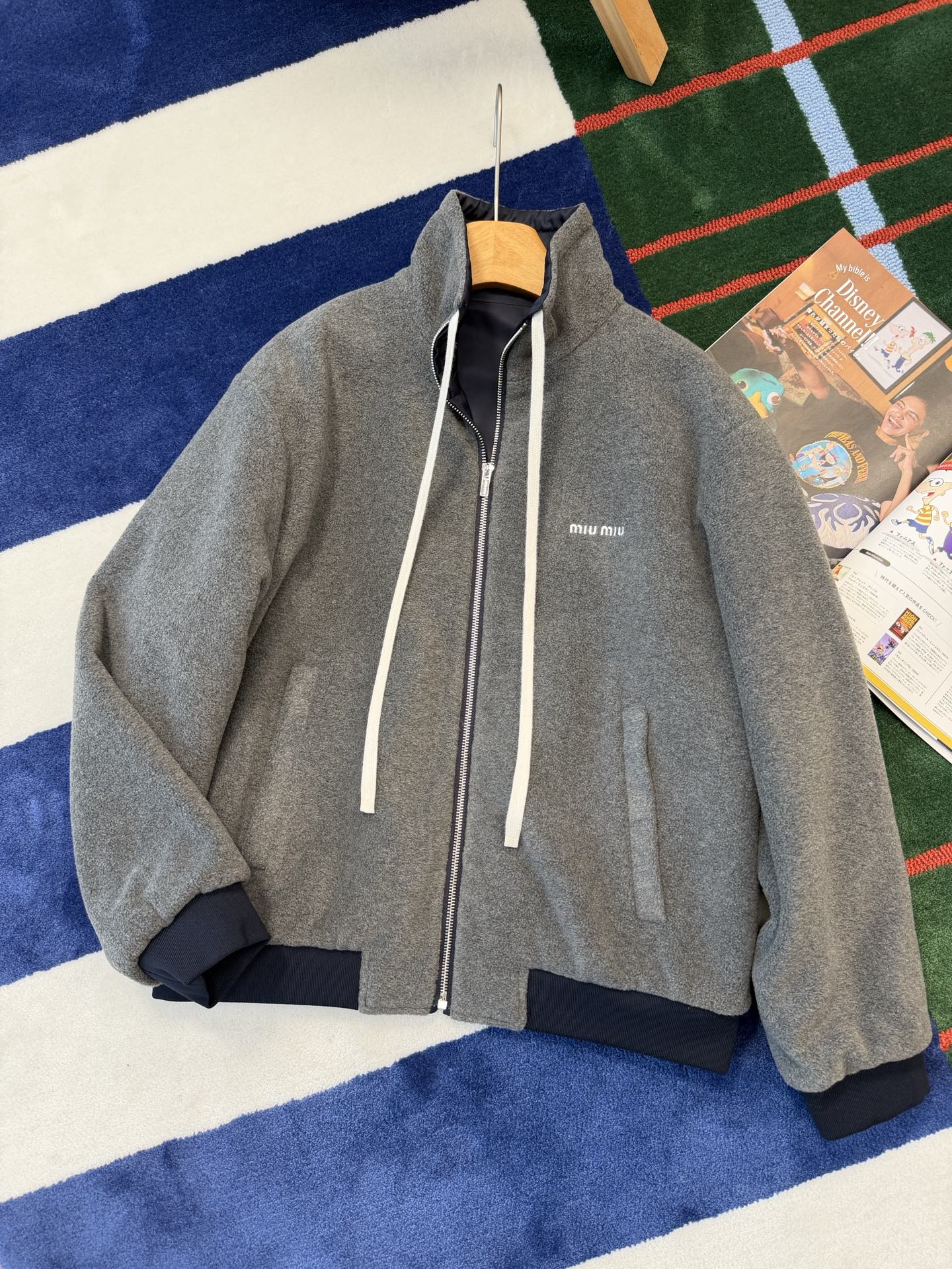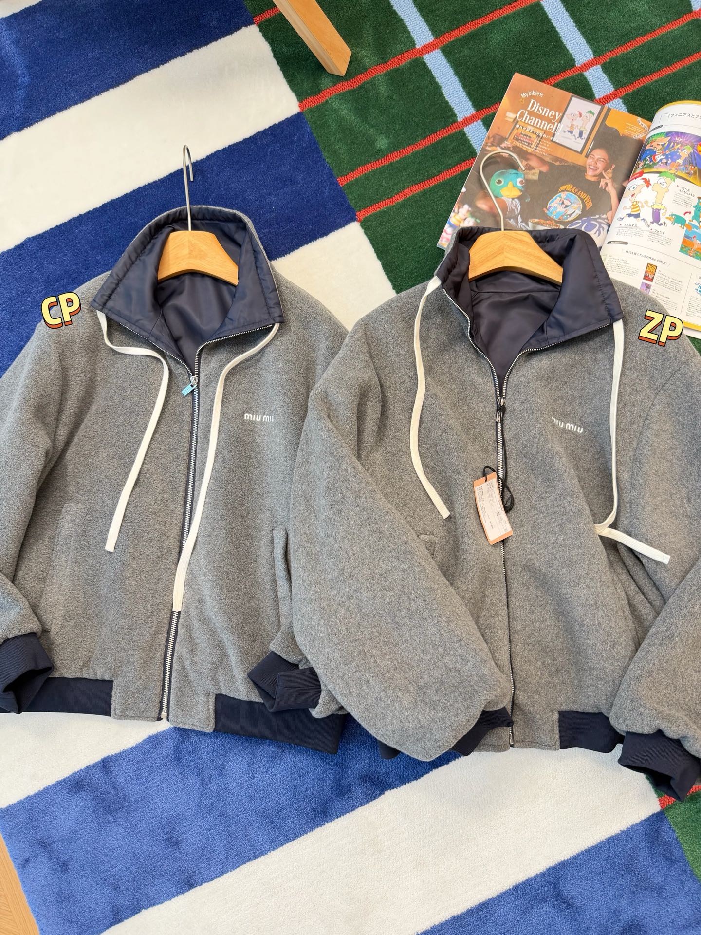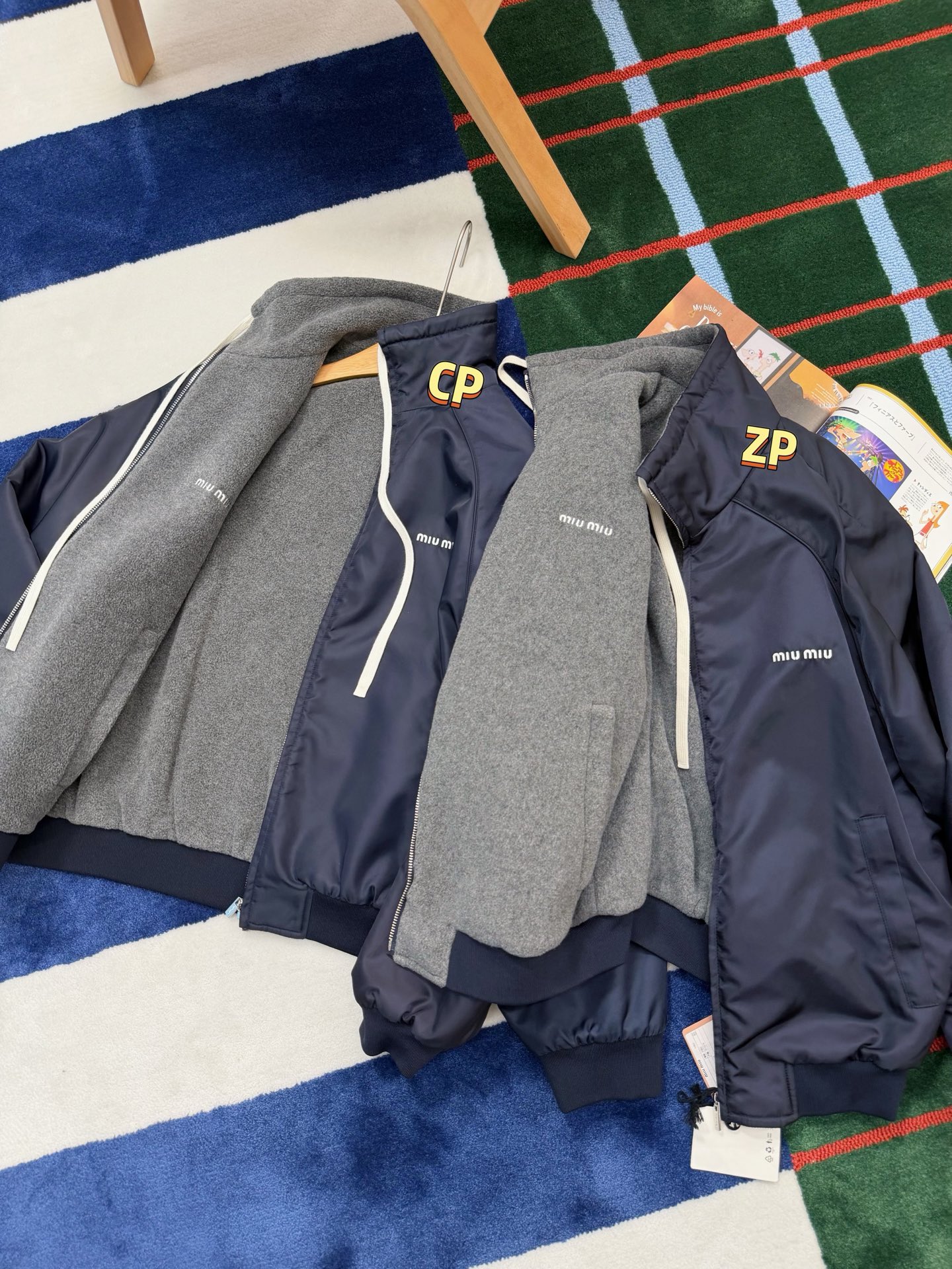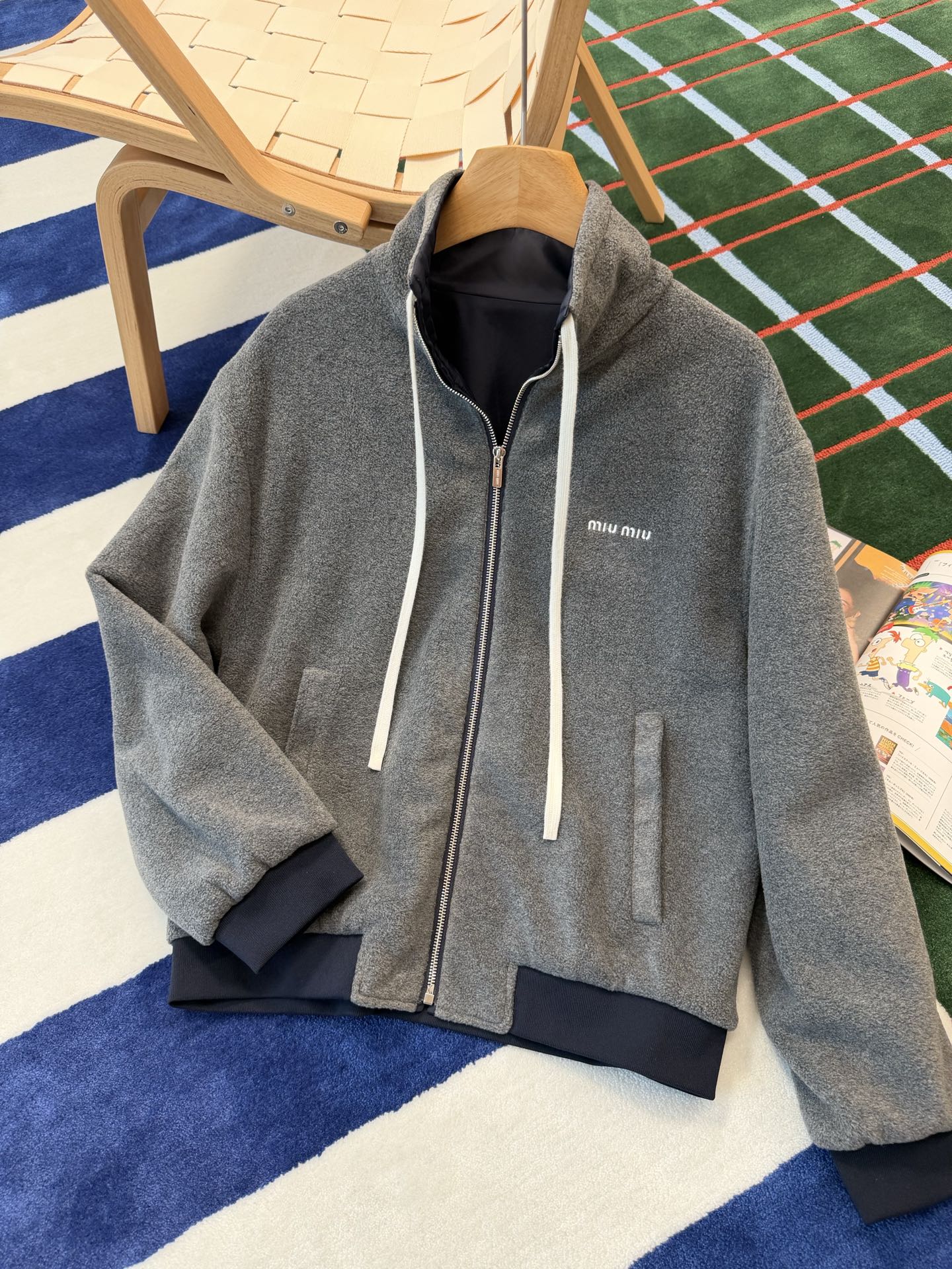 最最最新款 双面穿外套💫一件等于两件衣服的快乐,保暖又好看,慵懒时髦感, 科技Gazar面料与羊毛软料相结合➕这款双面飞行员夹克传递舒适感和酷炫态度✨ 胸前饰有刺绣,拿到手才知道有多香,两面完全是两种风格,一面是软糯糯的灰色摇粒绒手感巨舒服,像裹着云朵走路秋冬氛围感直接拉满,翻过来是酷酷的蓝色尼龙面立马变身街头辣妹风,版型宽松但不臃肿藏肉显瘦一绝 ✔️两面都有口袋实用性满分〰️姐妹们一定要拥有😜码数SML