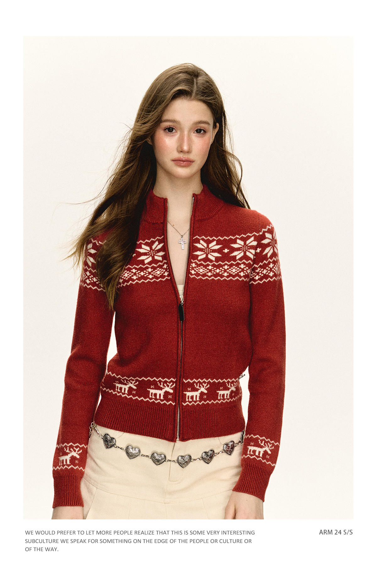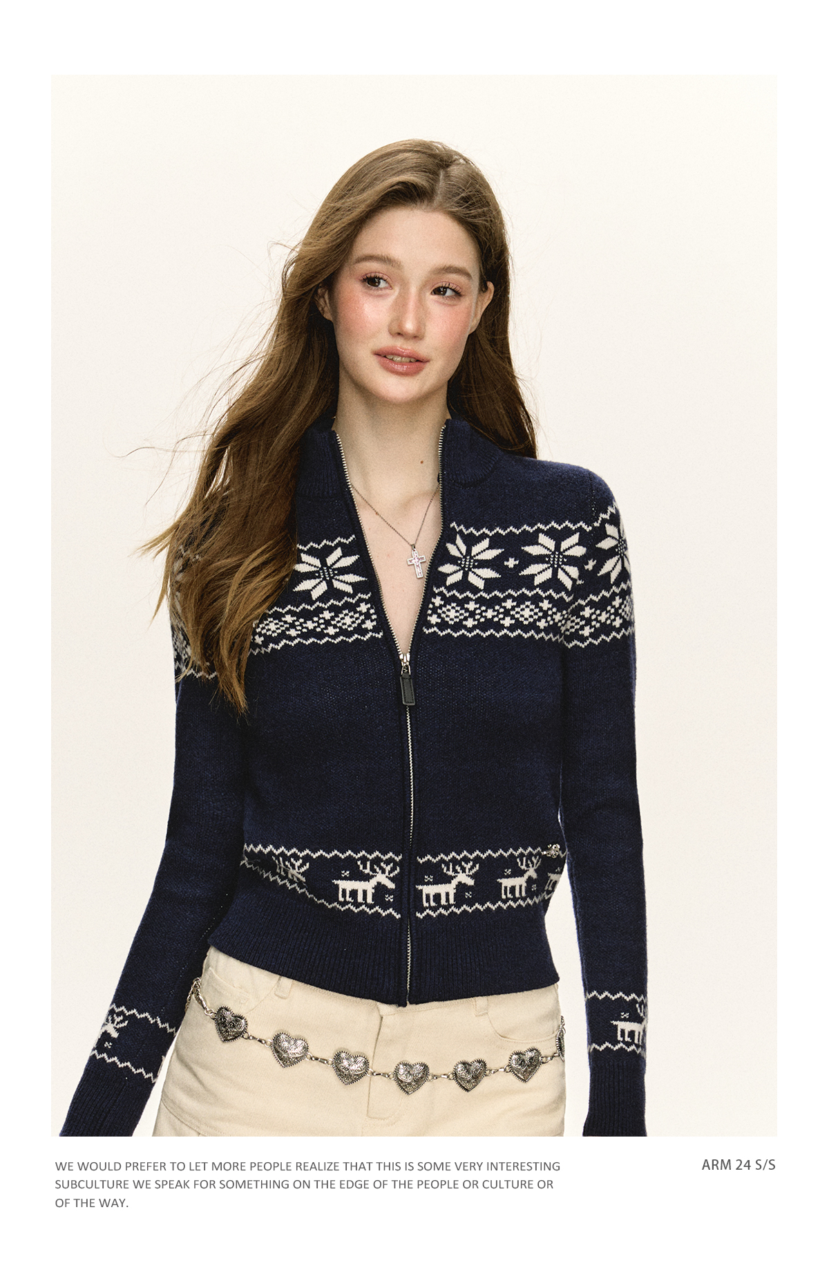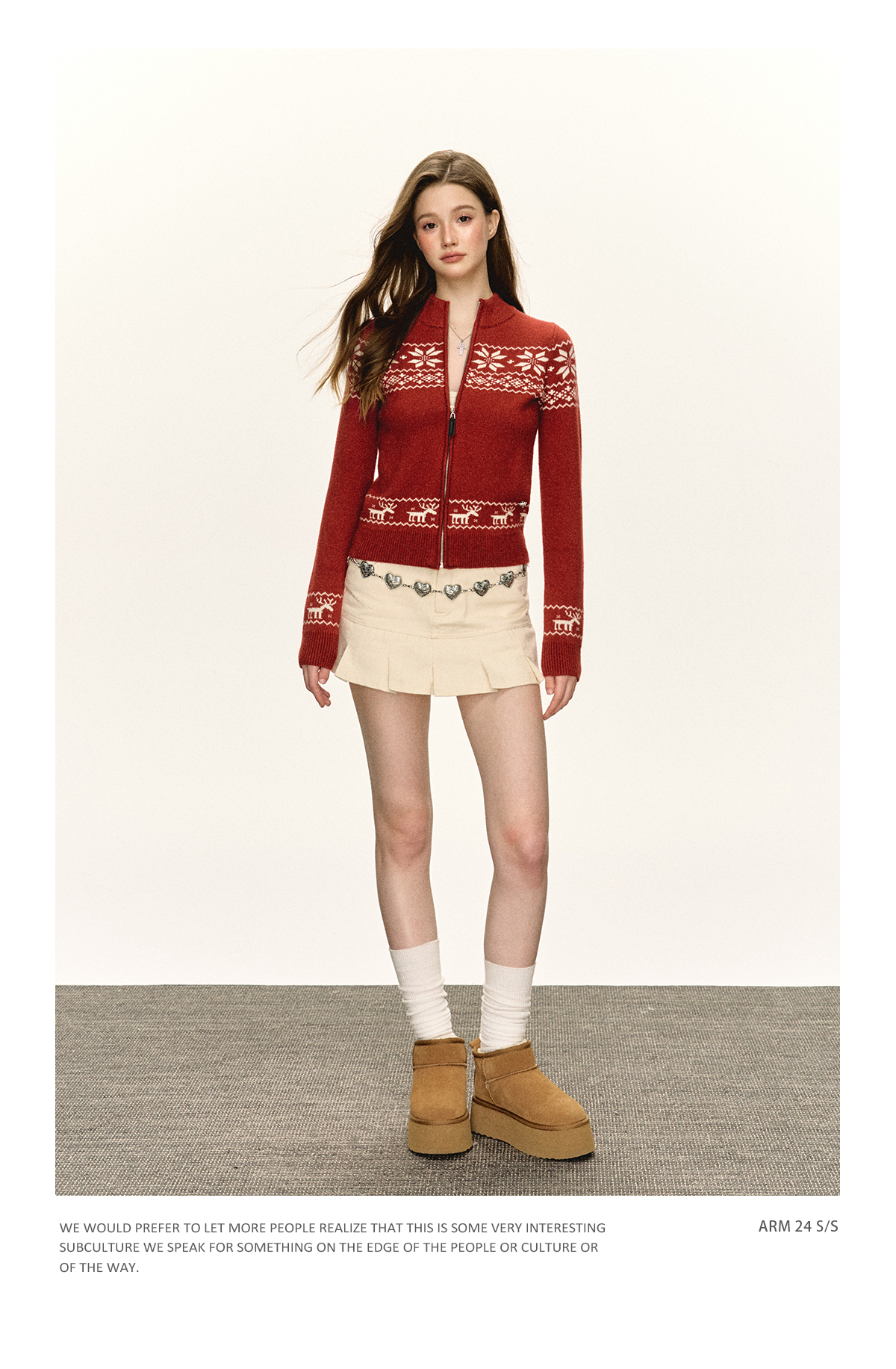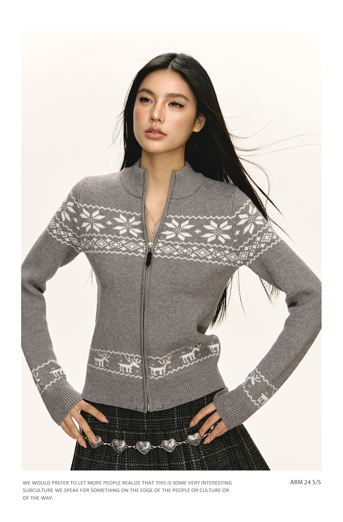 Ariseism 美式复古费尔岛花纹立领拉链开衫女春季新款修身上衣
