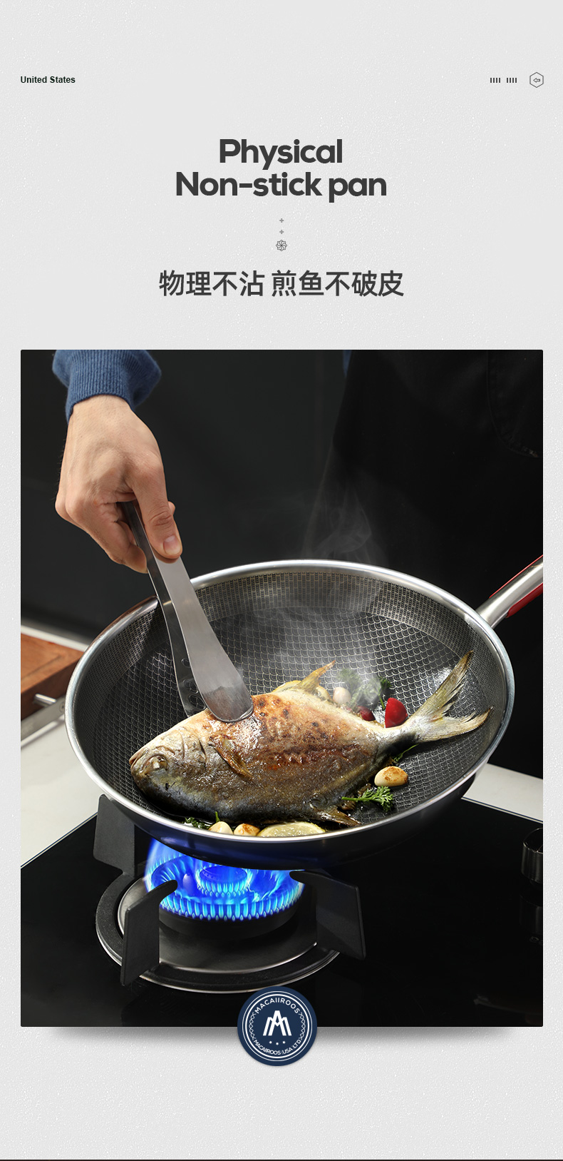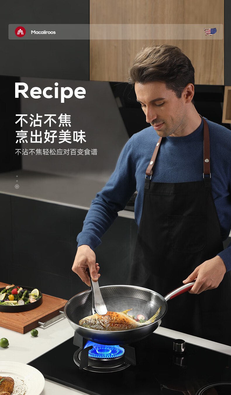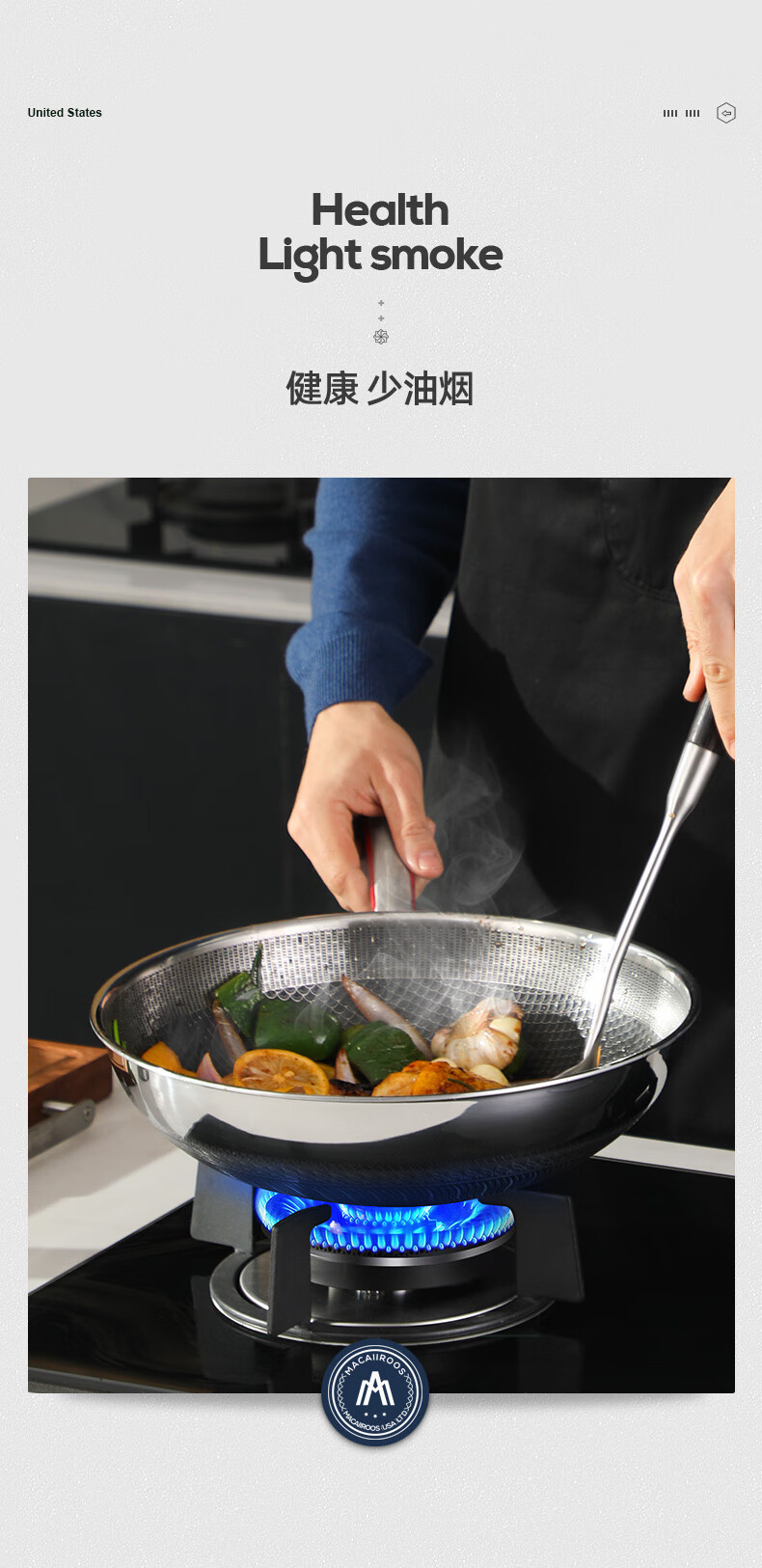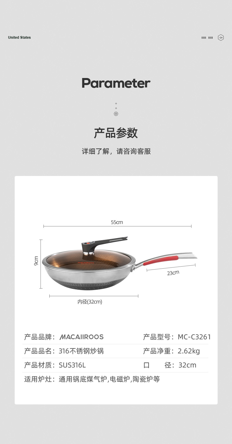 Macaiiroos 炒锅炒菜锅不锈钢不粘锅可立盖电磁炉燃气灶通用迈卡罗 MC-C3261(316材质)