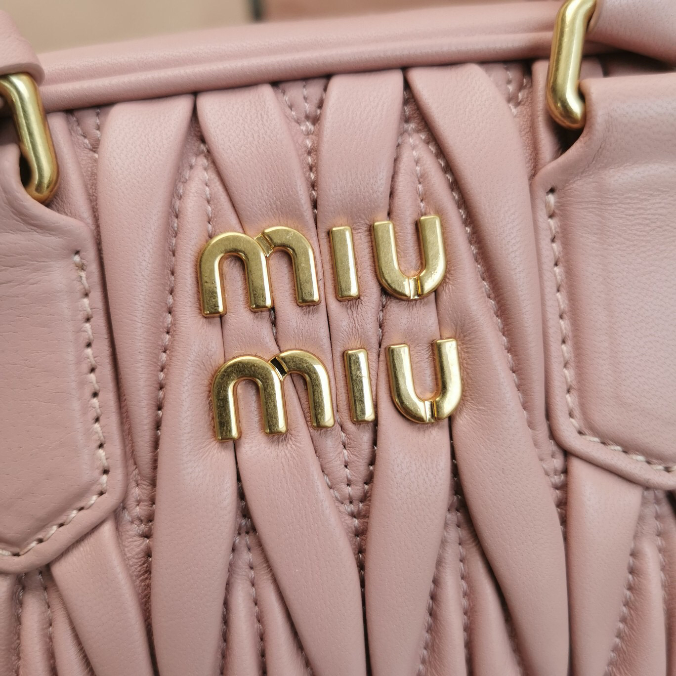 MiuMiu新品too pretty保龄球手袋,采用进口小羊皮经典品牌标志性Matelasse纹理绣花,复古磨砂五金,保留了应有的俏皮感,包型整体硬挺有型,充满个性,可甜可盐,容量可光,各大时尚搏主几乎人手一个,火爆程度不亚于之前的MiuWander,颜色多多,三个尺寸,小号尺寸:19X13X6CM,配原版包装