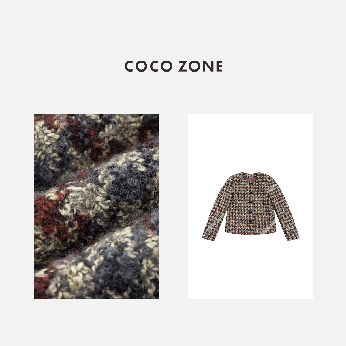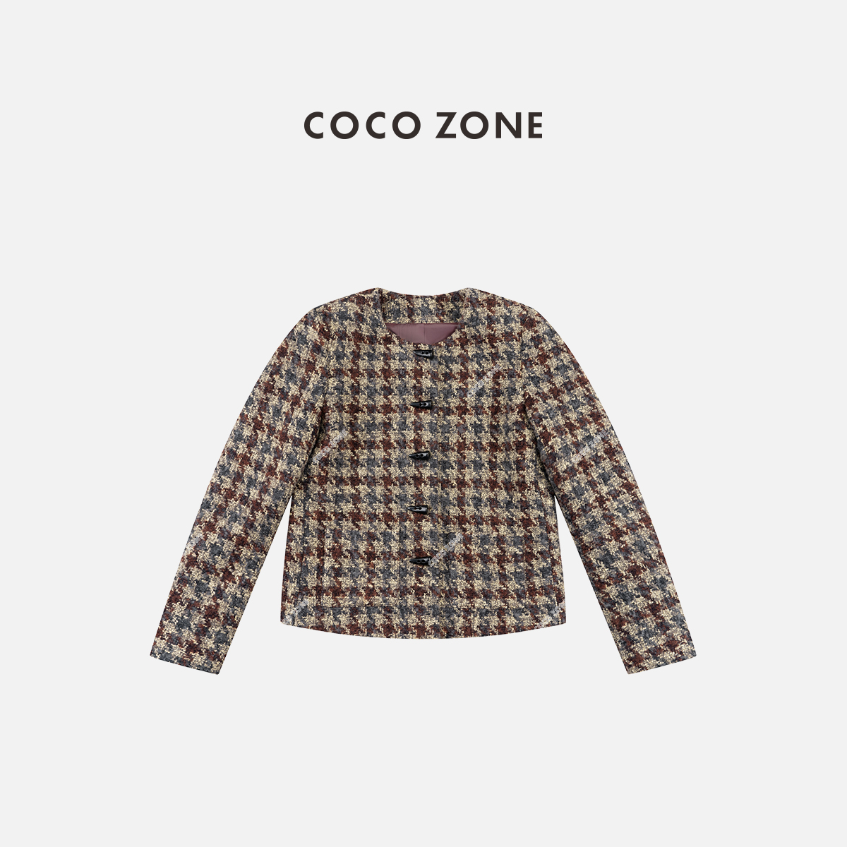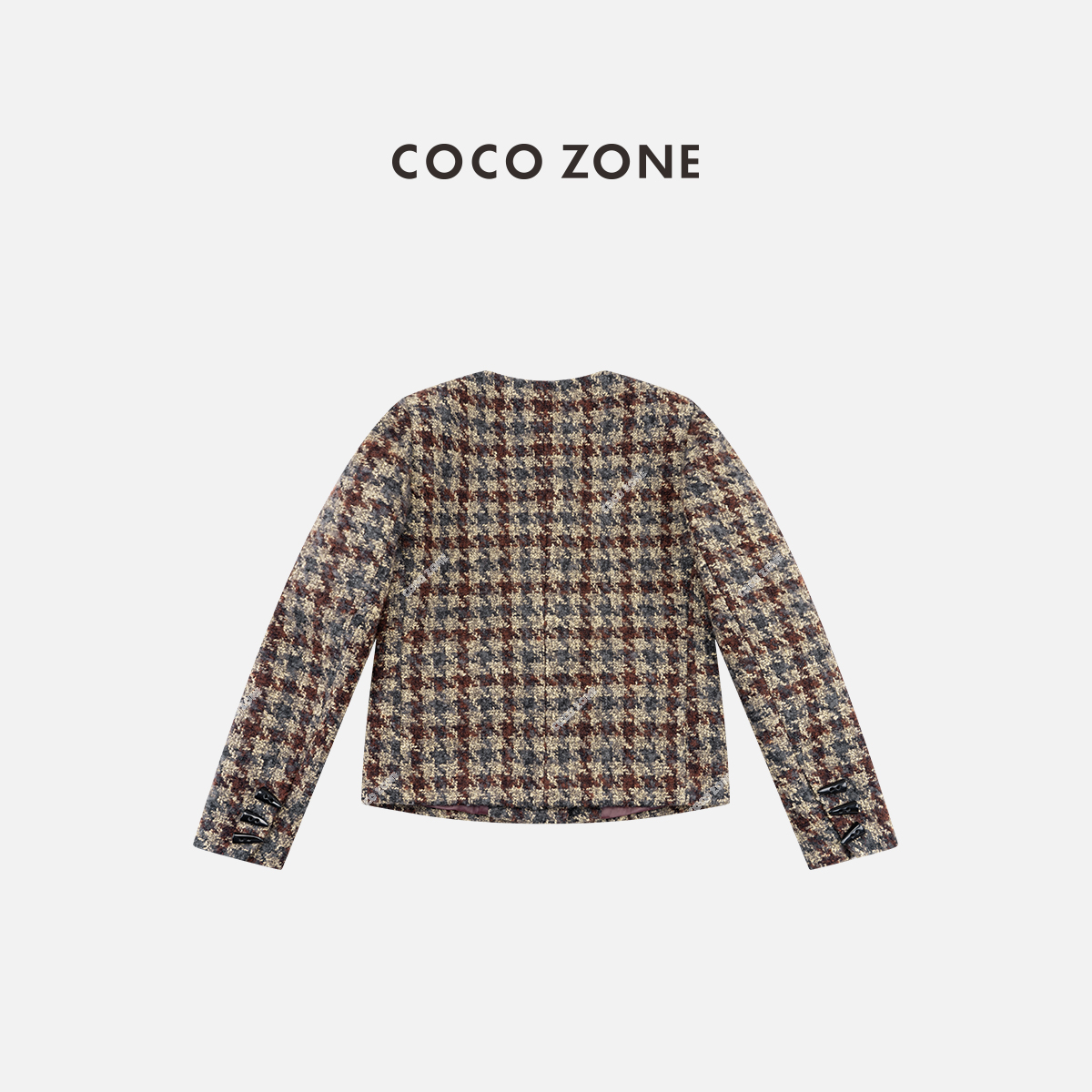 COCO ZONE 设计感撞色格纹外套牛角扣圆领上衣CC1D2358