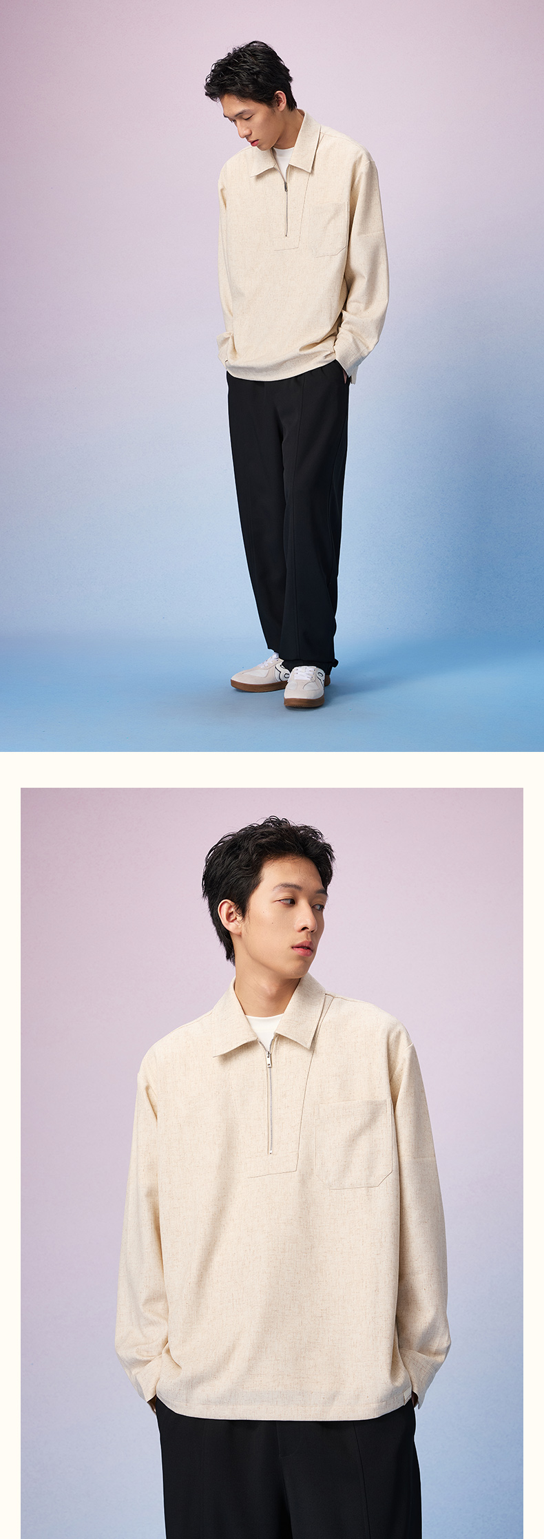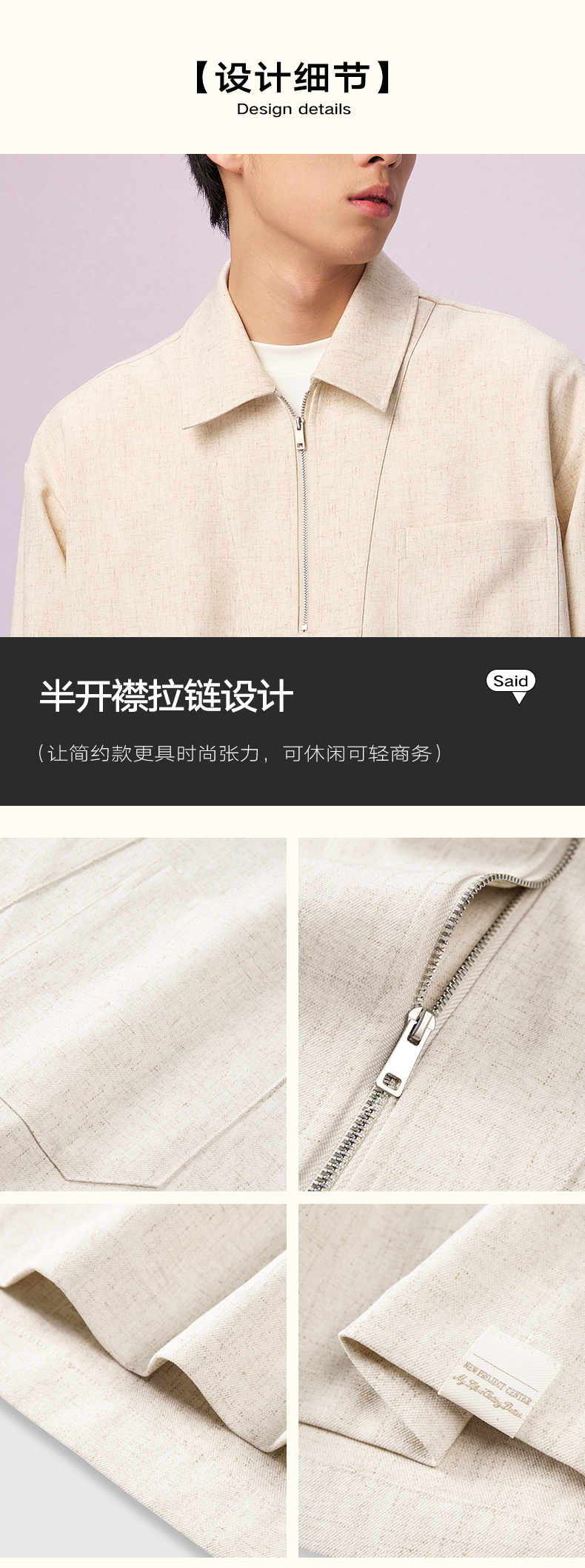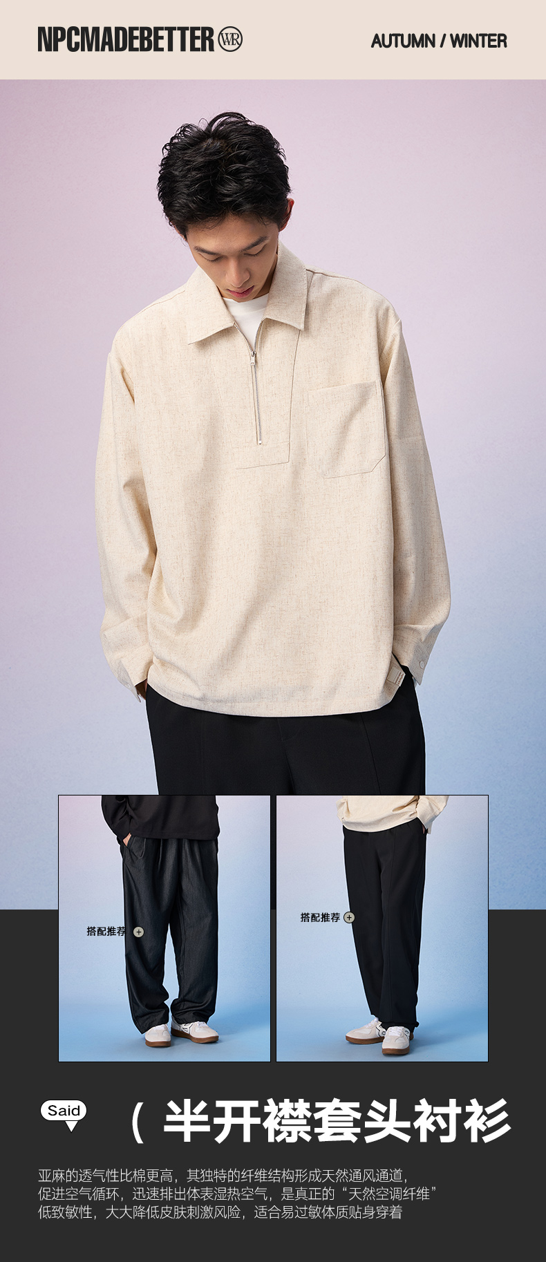 NPC潮牌亚麻混纺宽松落肩半开襟拉链衬衫男秋季上新NP57SH17