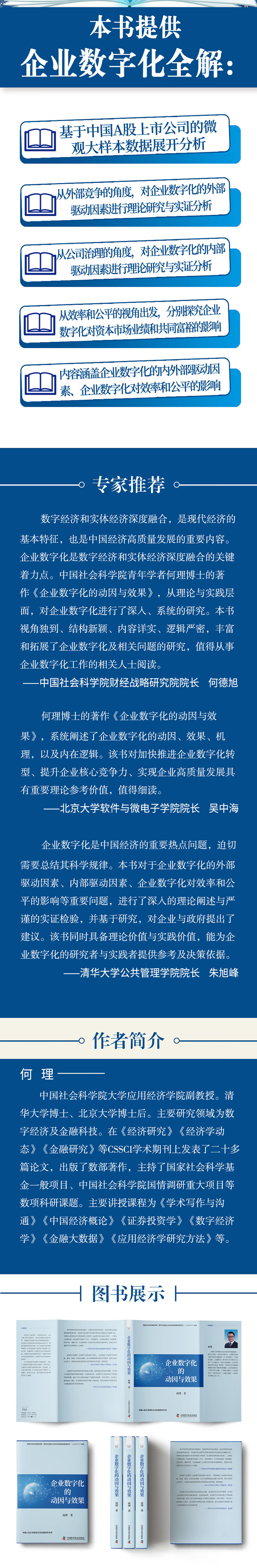 在经历了农业经济、工业经济时代后,人类进入数字经济时代。中国正在加快发展数字经济。企业数字化是数字经济发展的微观支撑点,也是数字经济和实体经济深度融合的发力点,推进企业数字化非常重要。对于企业数字化的动因和效果,本书系统而深入地开展了理论研究与实证分析,详细阐释了企业数字化的外部驱动因素、企业数字化的内部驱动因素、企业数字化对资本市场业绩的影响、企业数字化对共同富裕的影响等。