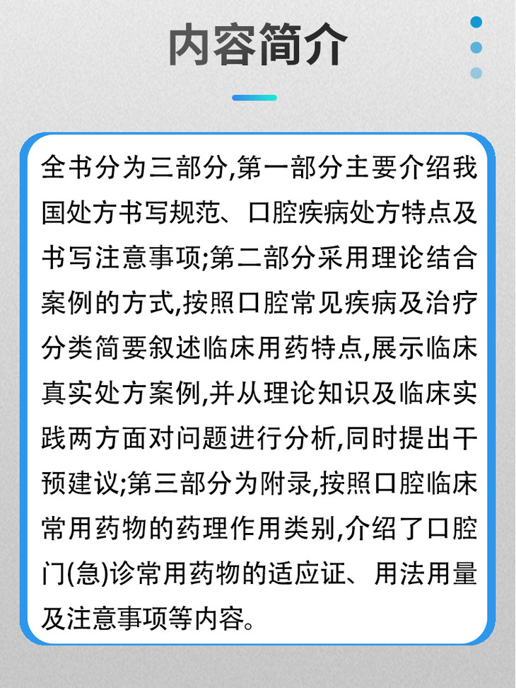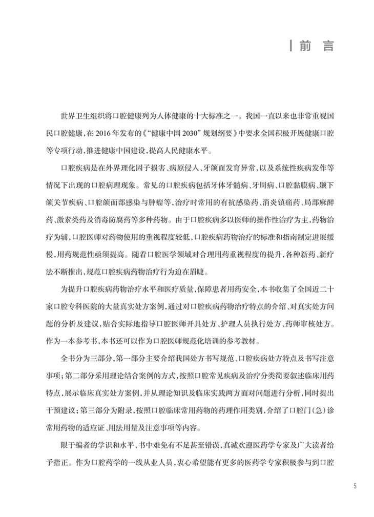 本书分为三部分,共10章。第一部分 口腔处方书写规范,第二部分 口腔常见问题处方及解析,第三部分 口腔临床常用药物索引(用法用量、注意事项)。本书既可以作为口腔科临床医生、开展口腔诊疗服务的综合医院药师及护士,特别是基层医疗机构和年轻口腔医务人员的岗前培训、继续医学教育的参考教材,又可以作为口腔医学、药学院校的学生参考书,也是口腔科医务人员日常工作的参考用书。本书编写团队涵盖北京大学、第四军医大学、四川大学、上海九院等知名口腔专科医院,覆盖面广、代表性强,业务能力过硬,具有良好的学科影响力,极大提升本专著的市场价值。