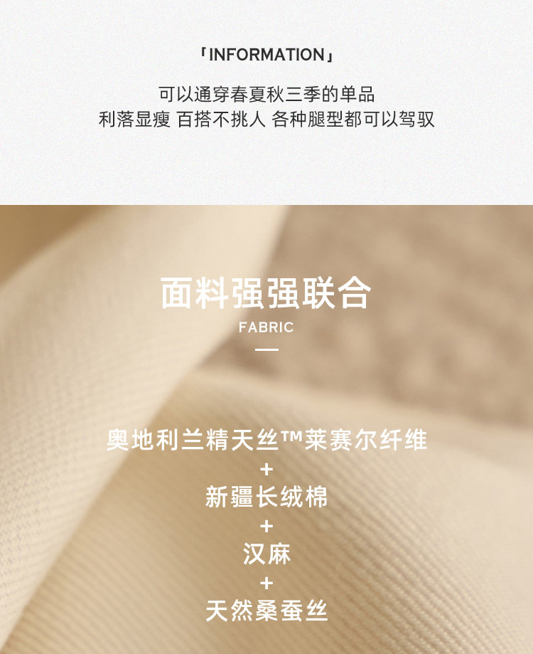 这条裤子的面料真的是我们下了很多功夫,市面上不多见,非常舒服。 夏天就要穿这种舒适透气的裤子~~