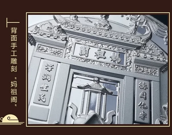 背面是手工雕刻的澳门著名名胜古迹之一“妈祖阁”,澳门地区在十二生肖兽首回归之路中起重要作用。