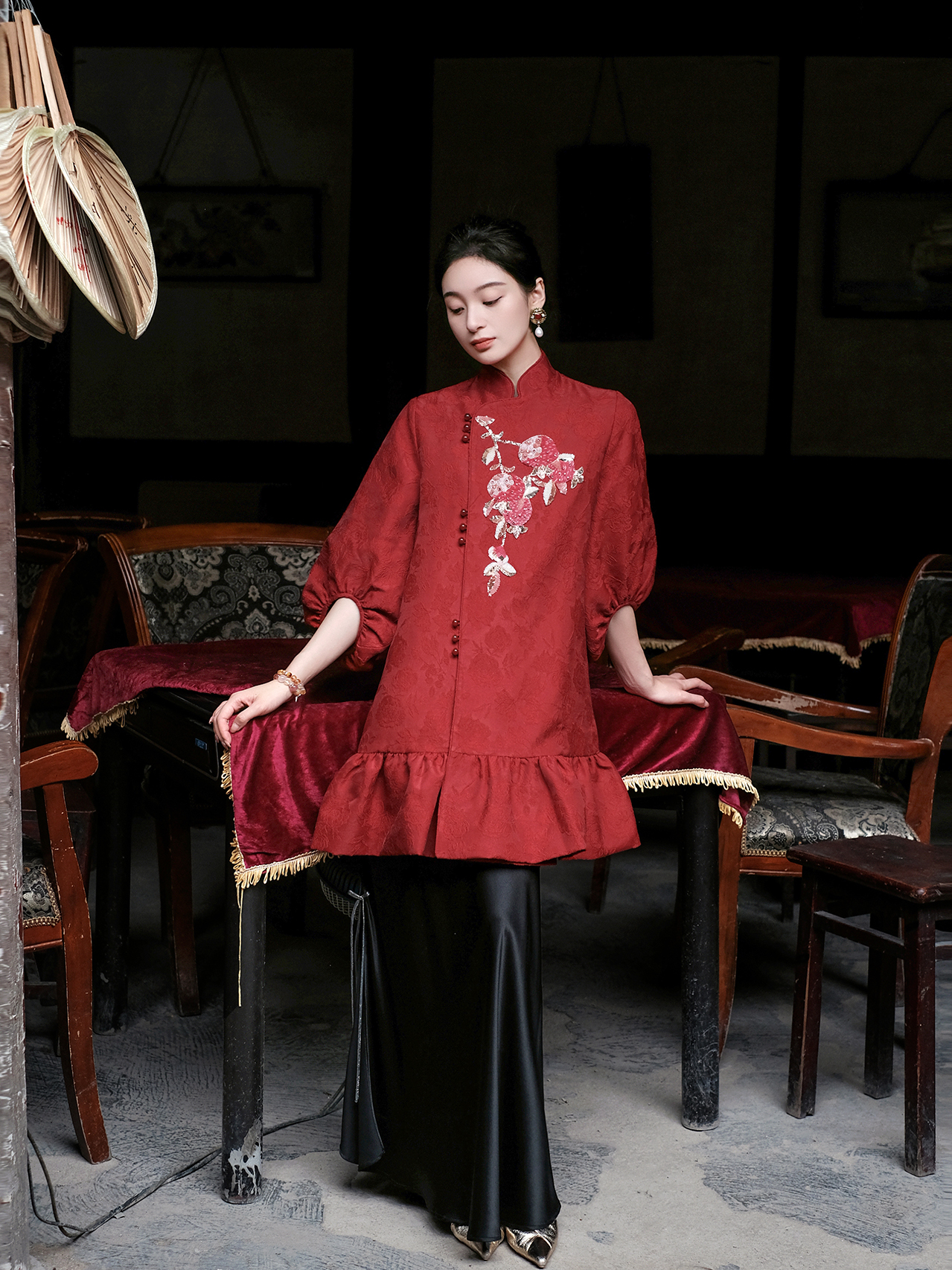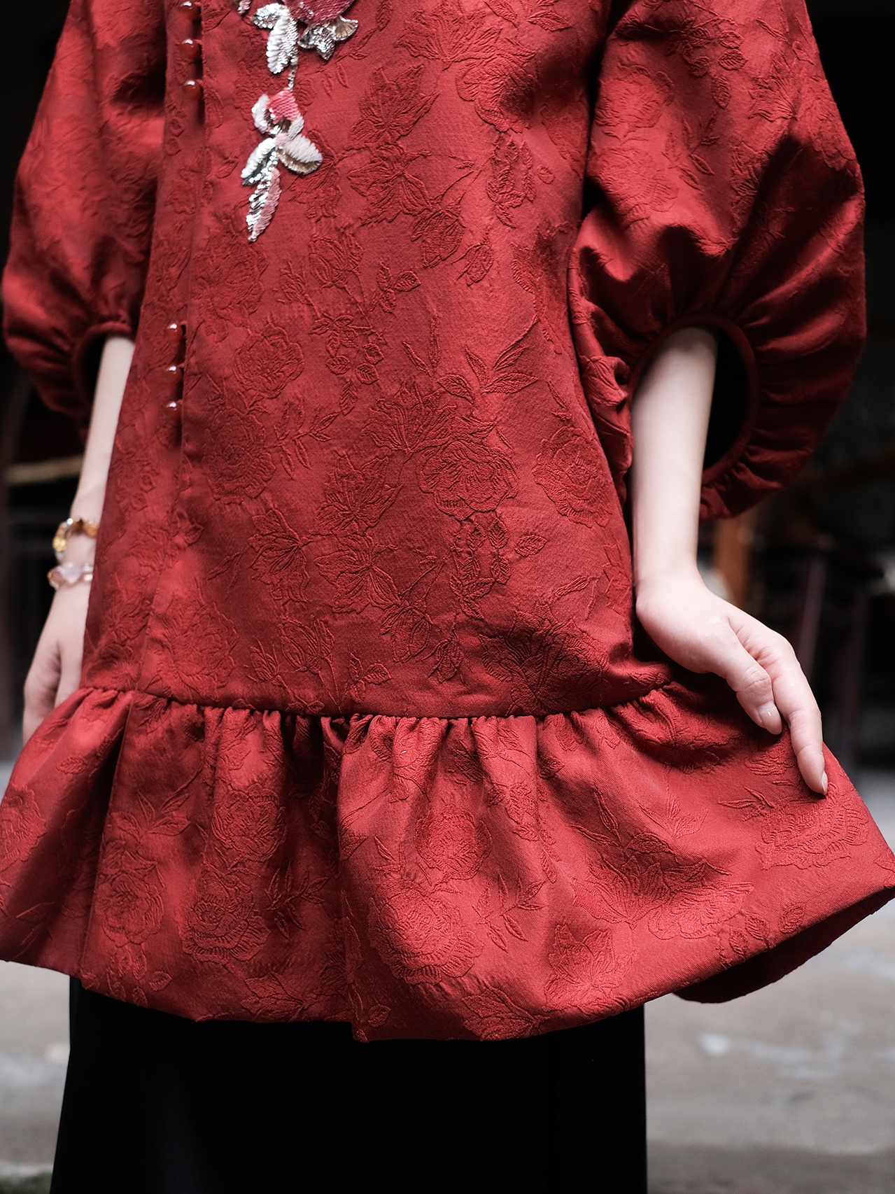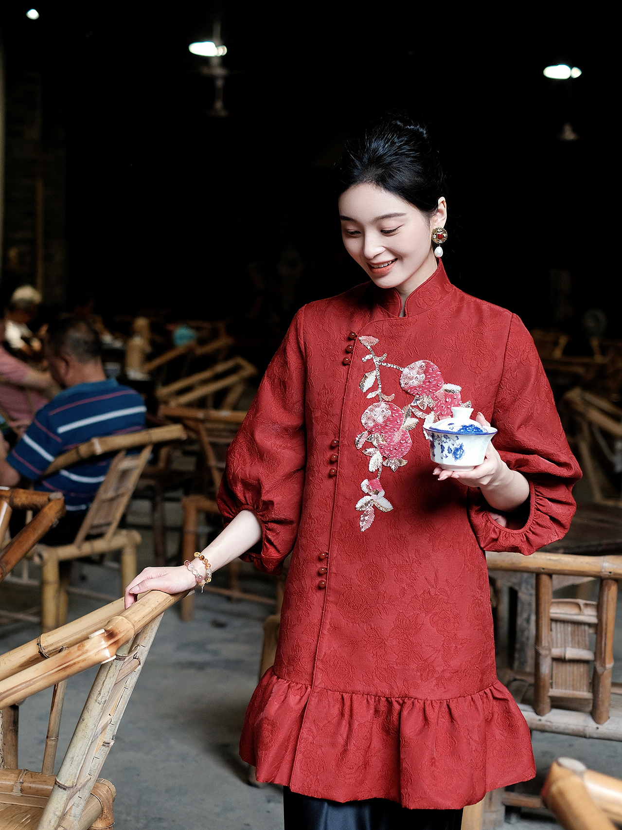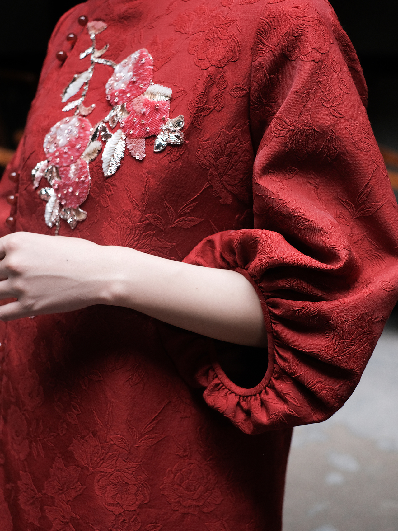 盛唐牡丹 |梅兰竹菊真丝冠乐皱斜襟旗袍裙