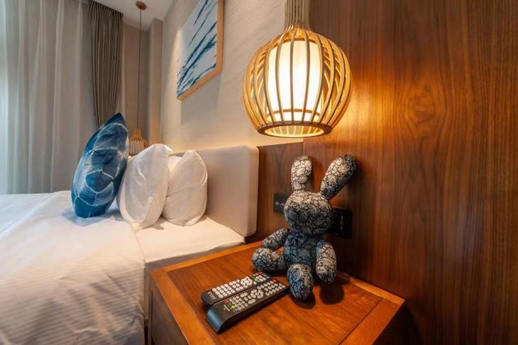 带花园的房间,落地窗,配上独家定制的扎染布料,房间冷暖配色协调,很是好看!