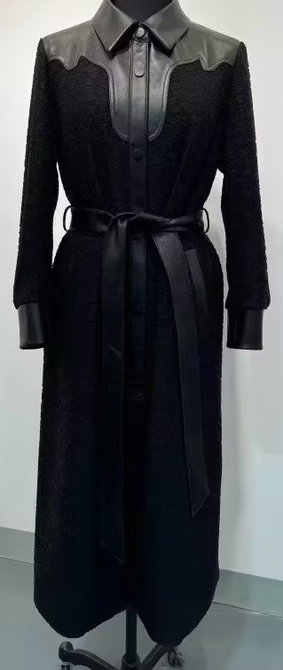 伯妮斯茵 | 甜酷暗黑风 皮质拼接肌理感连衣裙 系带收腰长款衬衫裙 秋冬气质通勤裙 HJ3C10