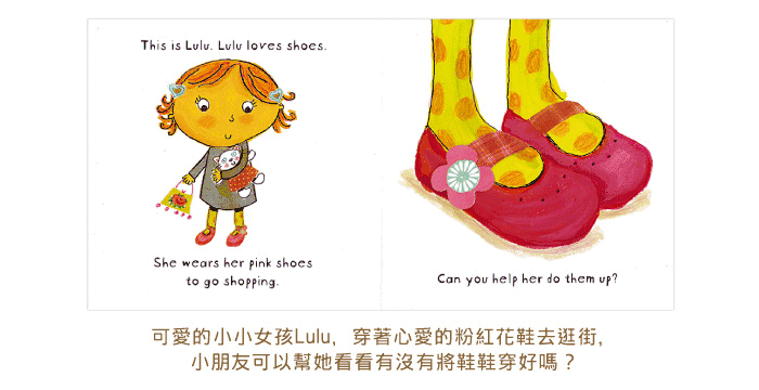 圆圆的脸蛋绑着可爱发夹的小小女孩Lulu,她爱穿着心爱的粉红花鞋去逛街了,小朋友,你可以帮她看看有没有将鞋鞋穿好呢?在公园里玩了溜滑梯,Lulu爱荡秋千那种摇摆的感觉啰~冬天时Lulu会带着她的小狗出门,这时候就要穿上冬天的厚底暖暖鞋,小朋友,帮Lulu看看鞋鞋的绳子有没有打好了呢?夏天则是穿着黄色大花的海滩鞋去海边,在家就要穿舒服轻便的兔兔粉红拖鞋啰~