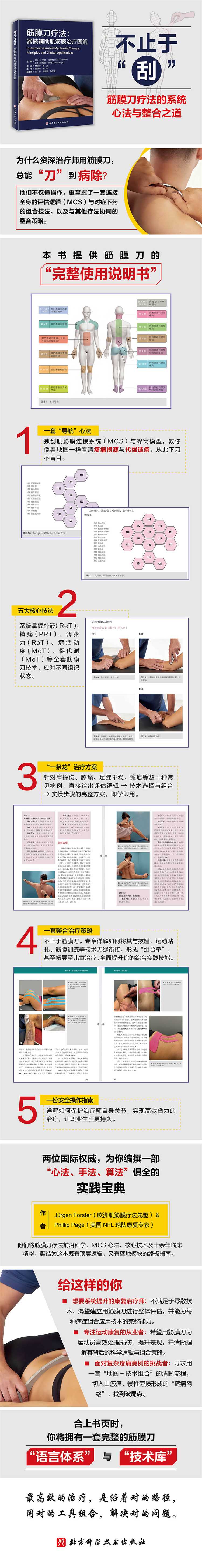 本书是器械辅助肌筋膜疗法(IAMT,即;筋膜刀疗法)的权威临床指南,由国际顶尖专家团队撰写。全书以肌筋膜连接系统(MCS)? 为核心框架,通过独创的蜂窝模型直观揭示人体筋膜网络的整体连接,指导治疗师超越局部症状,进行系统性的评估与治疗。本书不仅系统阐述了筋膜刀疗法补液、镇痛、调张力、增活动度、促代谢五大核心技术,更以独特的模块化结构组织内容。全书按身体区域及常见病症分章,每章独立成篇,直接聚焦如肩、膝、足踝等具体临床问题。每章均遵循统一高效逻辑:基于MCS分析病理,通过清晰示意图展示操作路径,并提供一套整合了核心技术的标准化治疗方案,包含评估、步骤、时长与进阶建议,形成从诊断到干预的完整闭环。这种;框架十技术十模块化方案的一体化设计,旨在赋能康复与运动医学从业者,使其能安全、规范且高效地运用IAMT,显著提升在疼痛管理、功能恢复和运动损伤康复中的临床疗效。