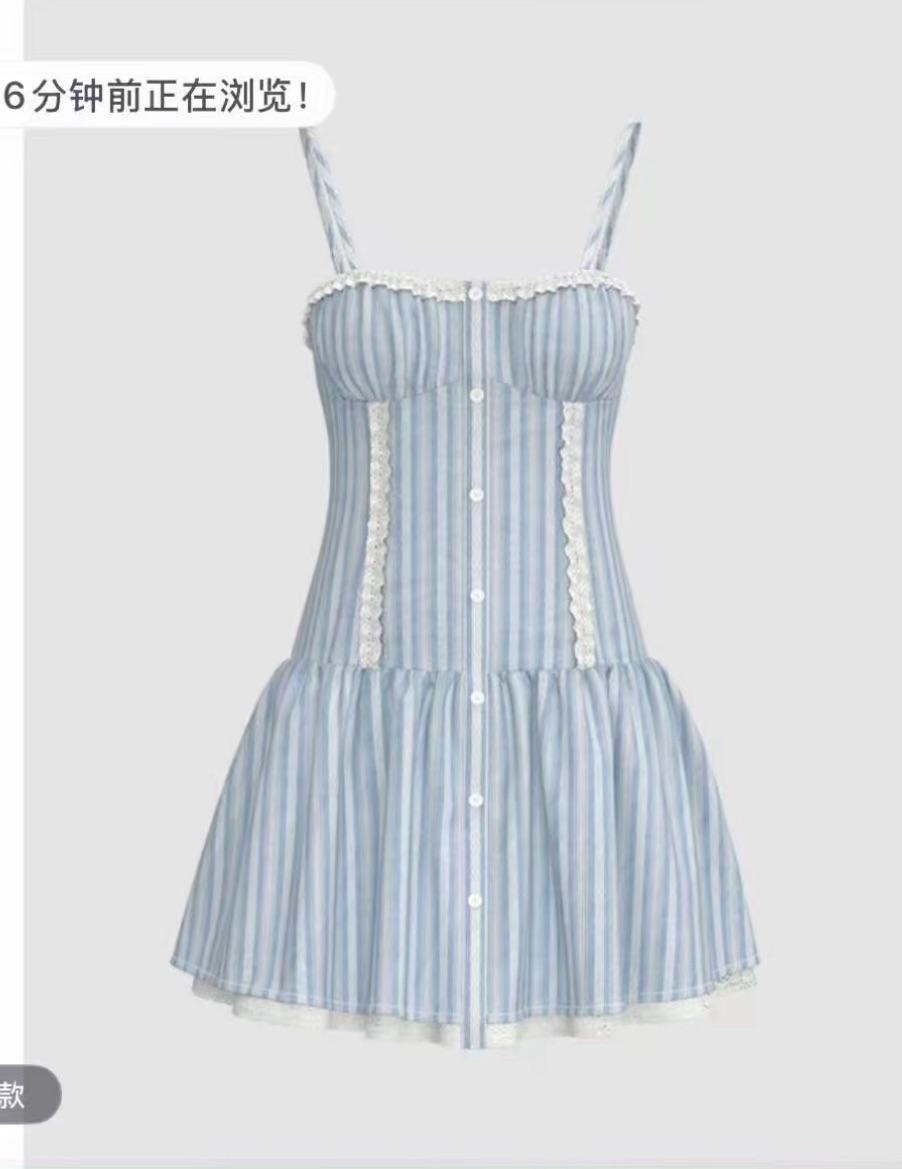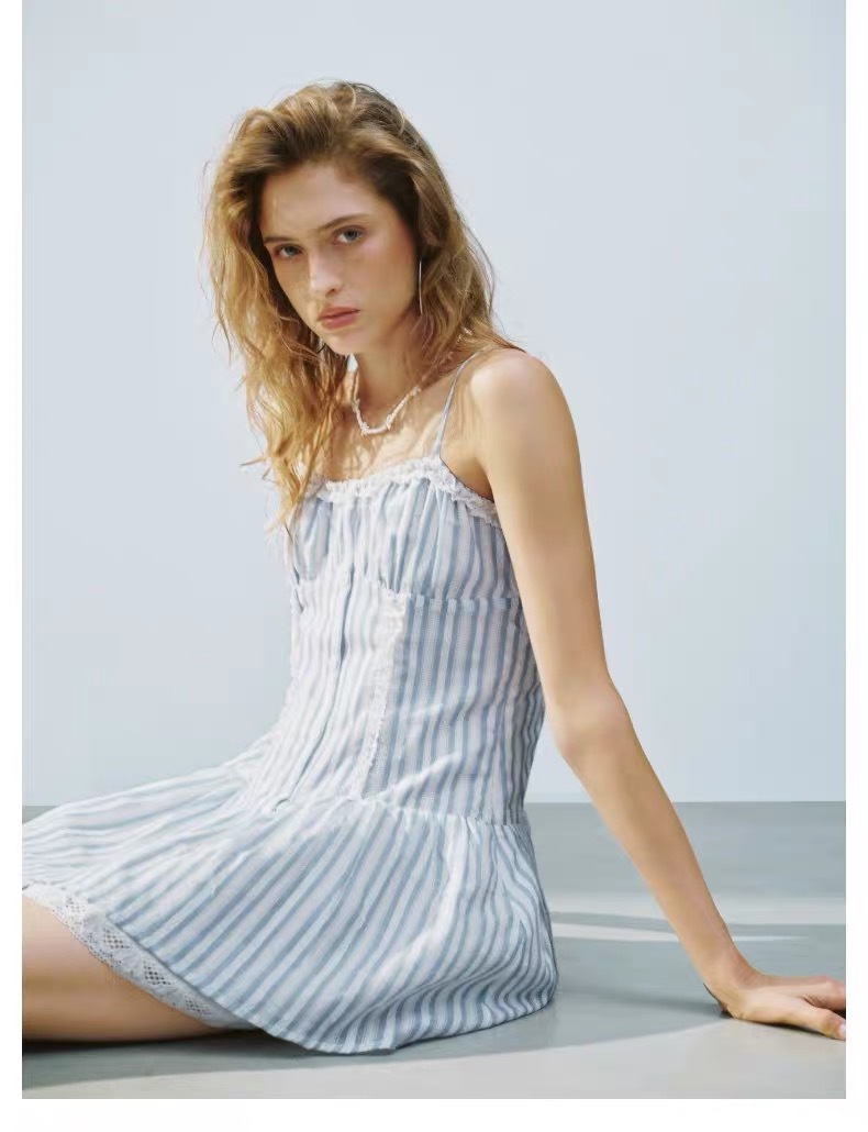 D070128夏季新款女装波嬉度假风拼接蕾丝条纹吊带连衣裙UYL750037