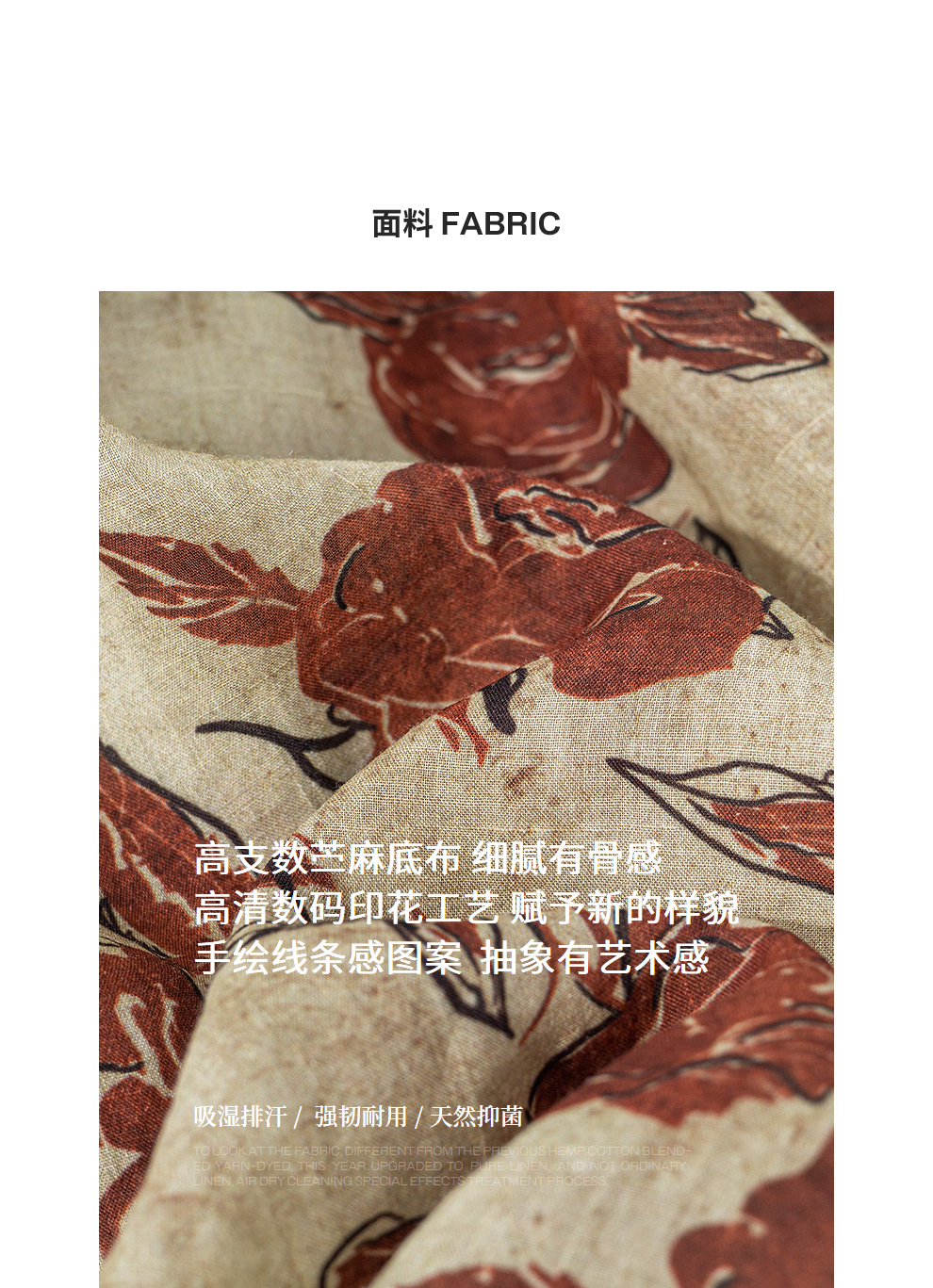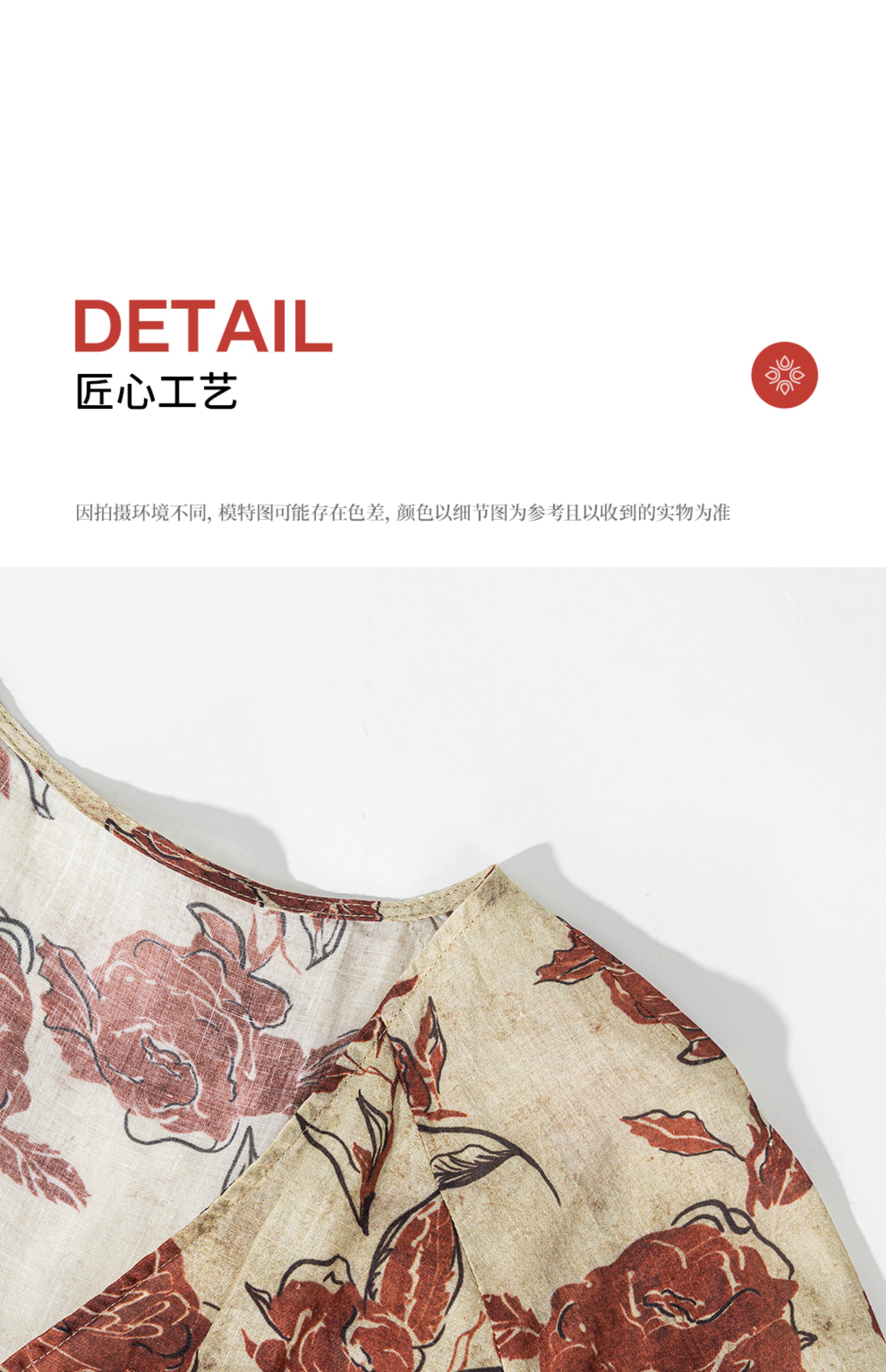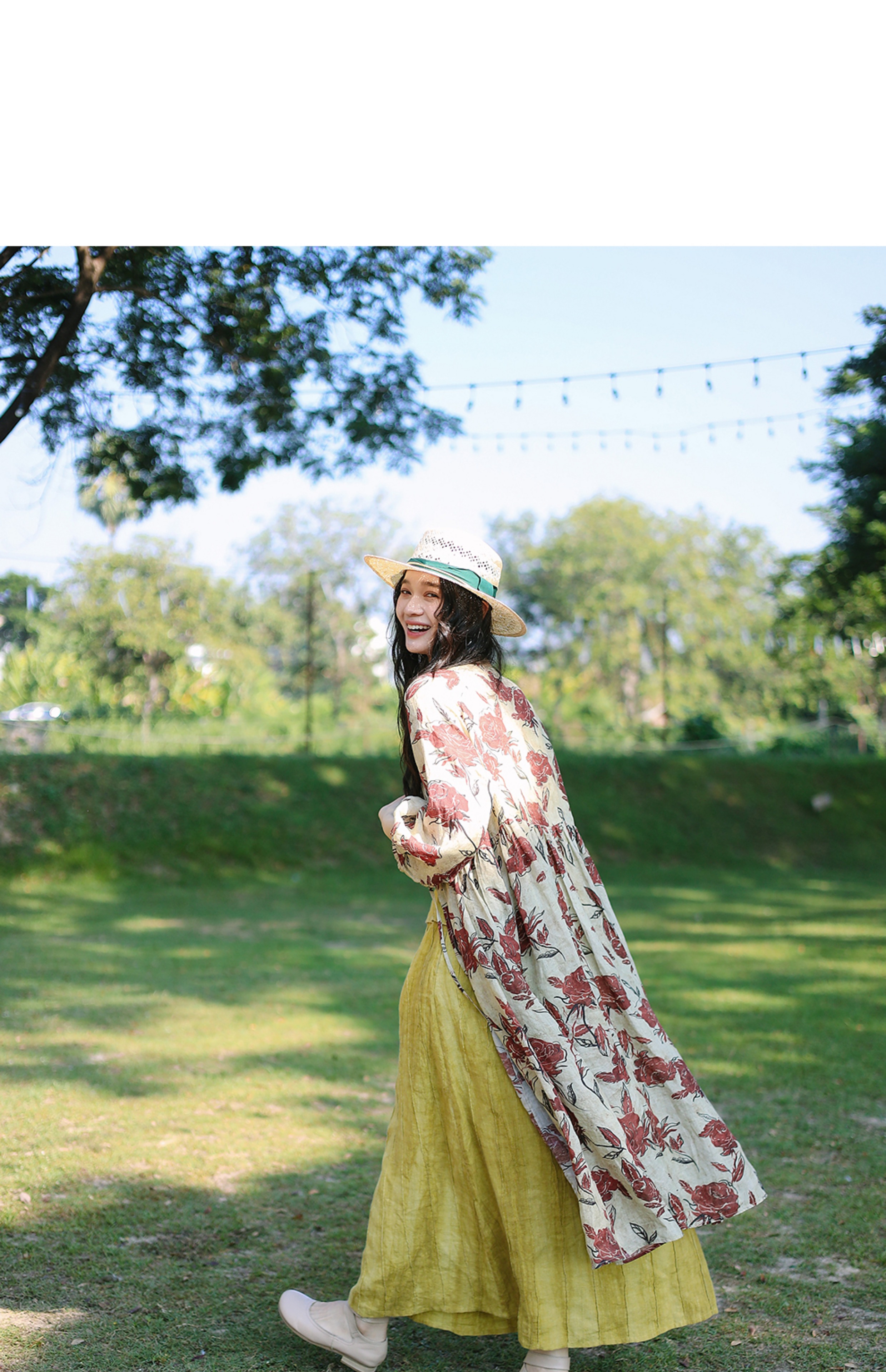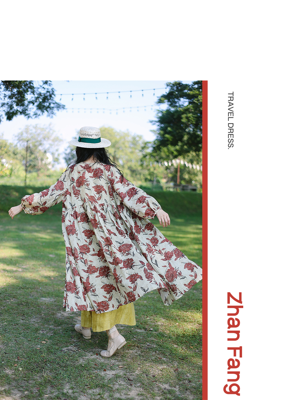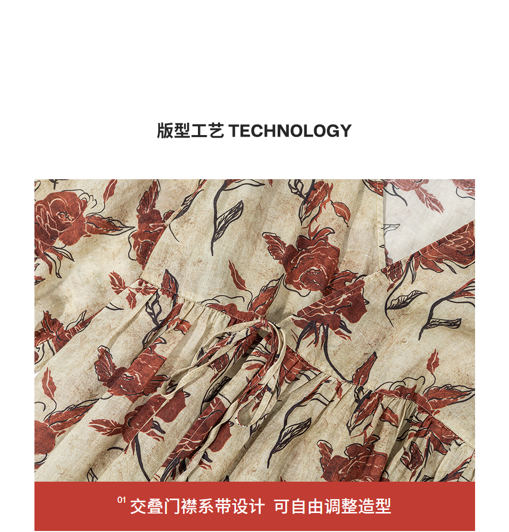 绽放旅行女装075朵/山茶花连衣裙苎麻印花交叠开门襟长袖开衫裙子