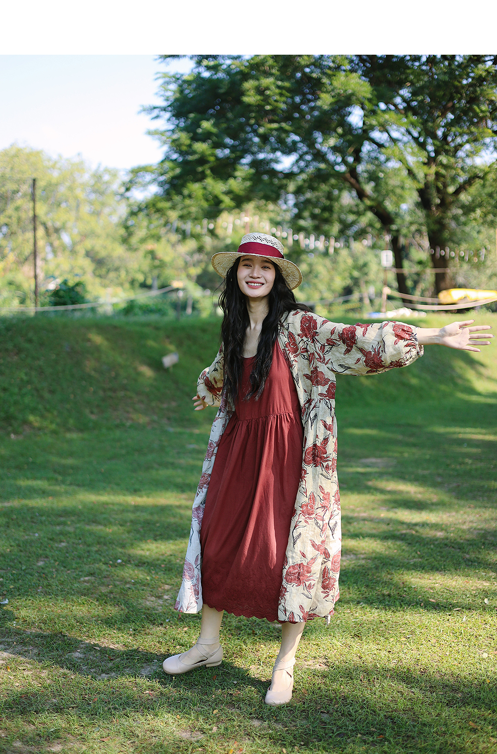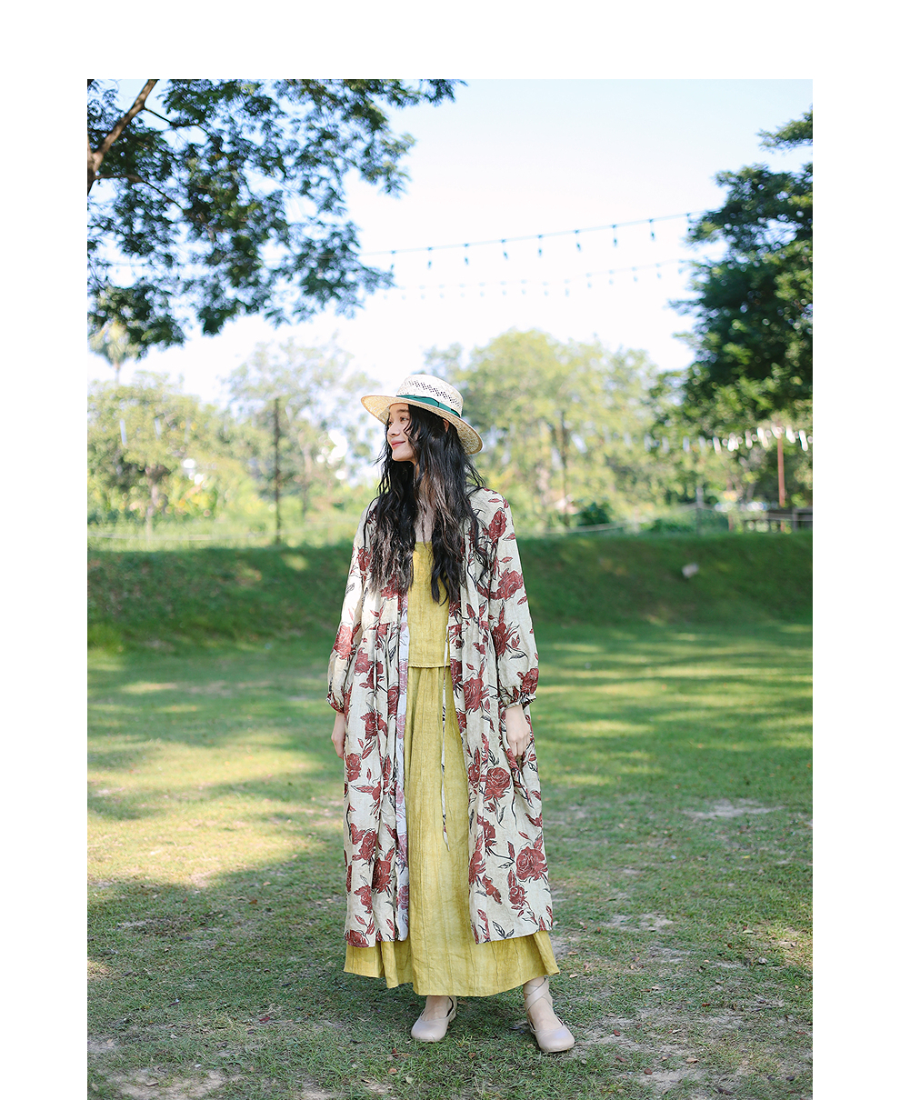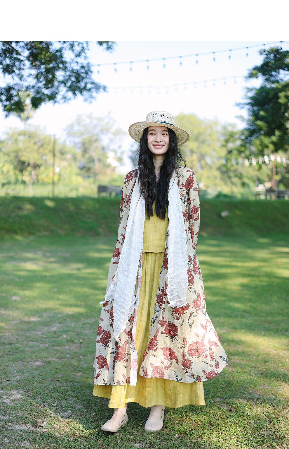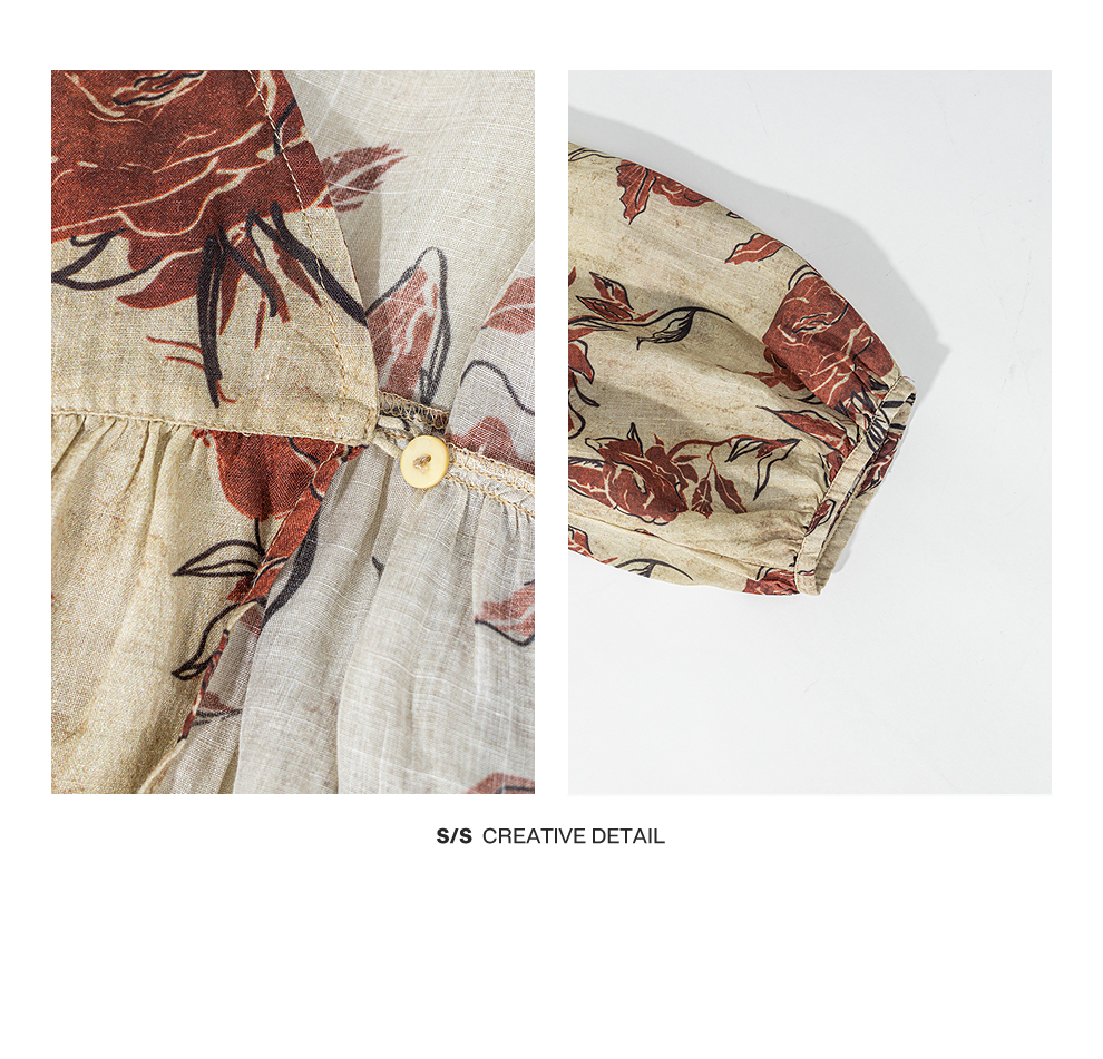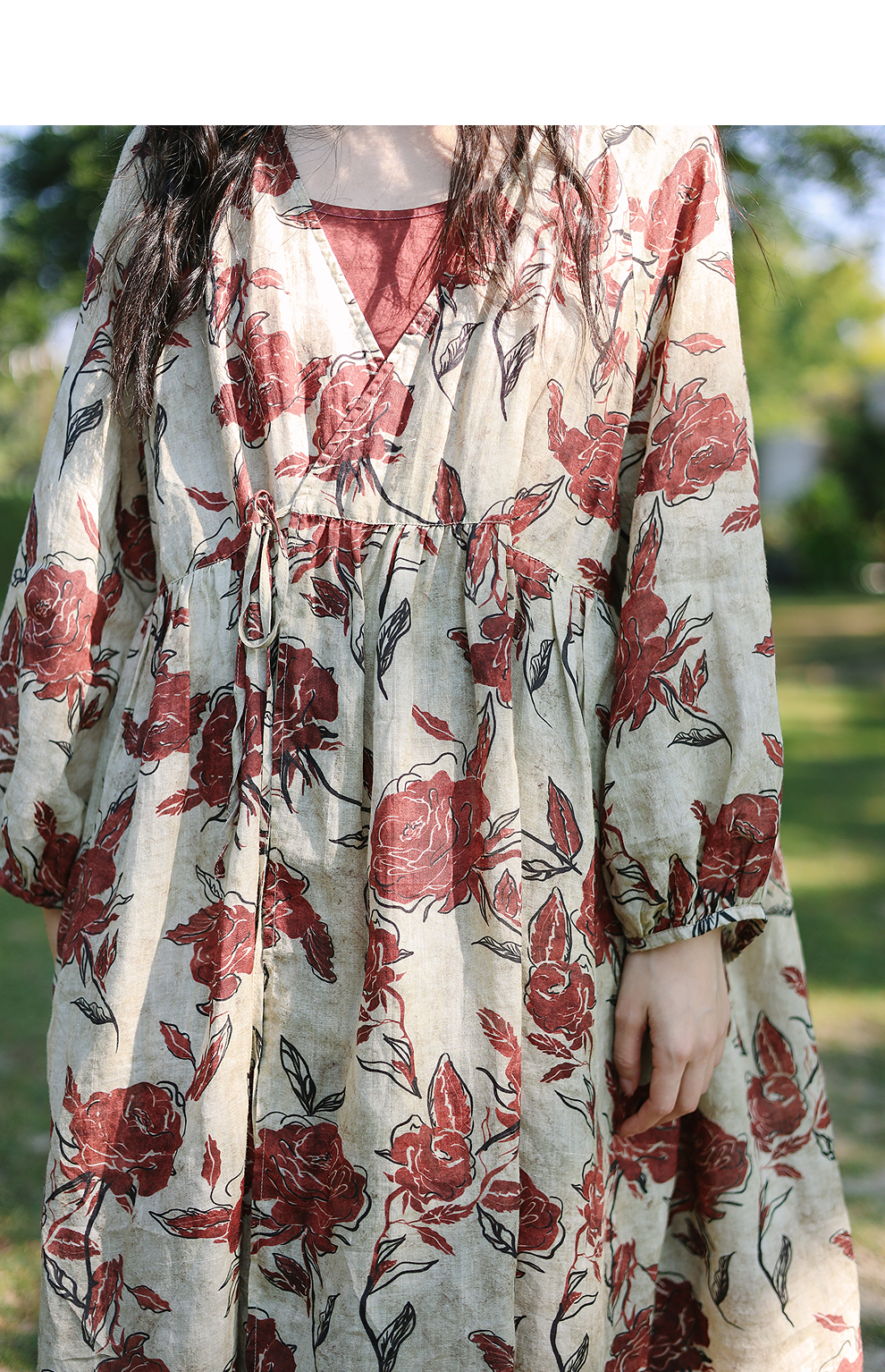 绽放旅行女装075朵/山茶花连衣裙苎麻印花交叠开门襟长袖开衫裙子