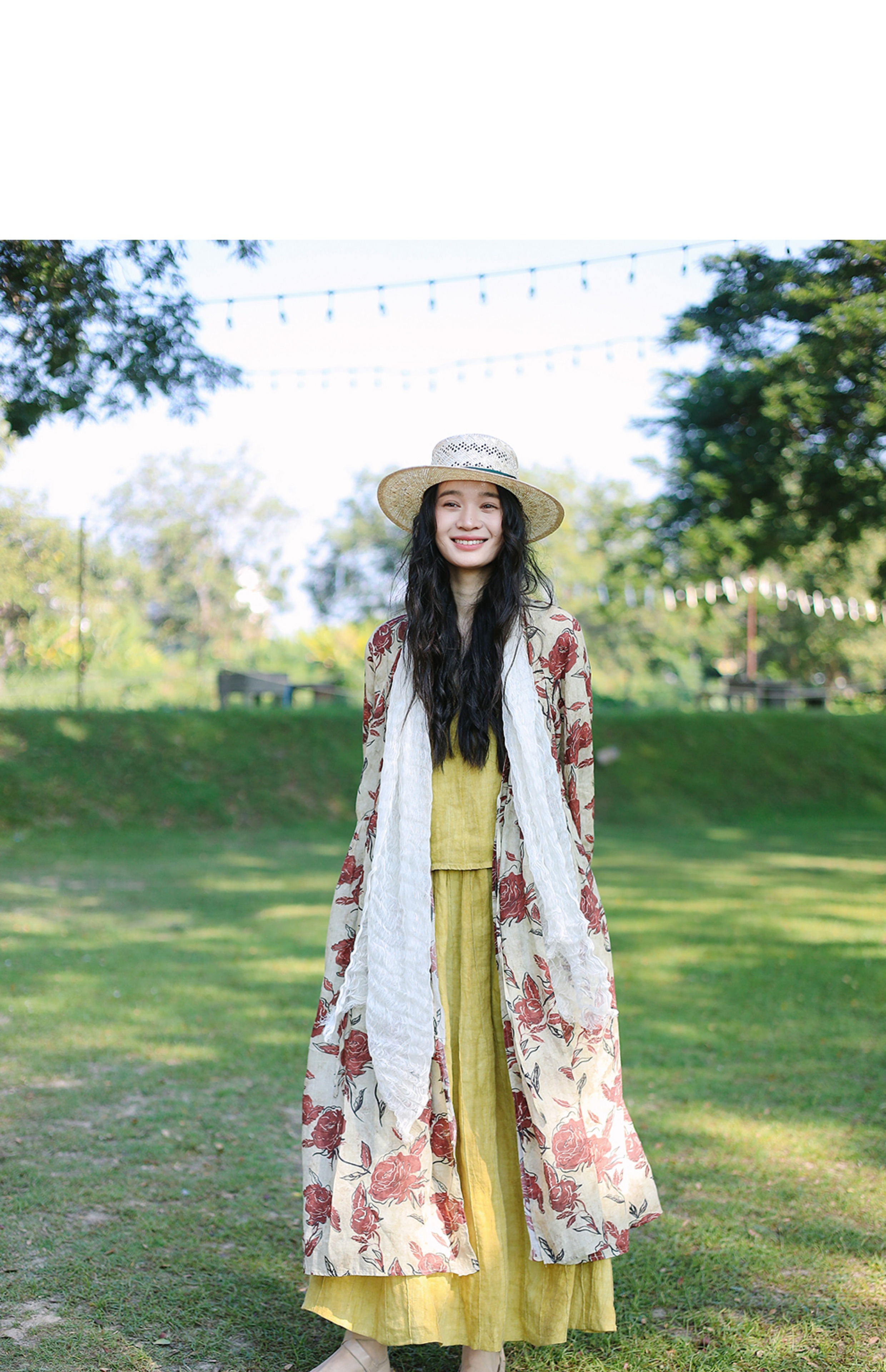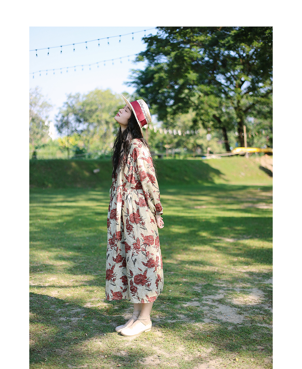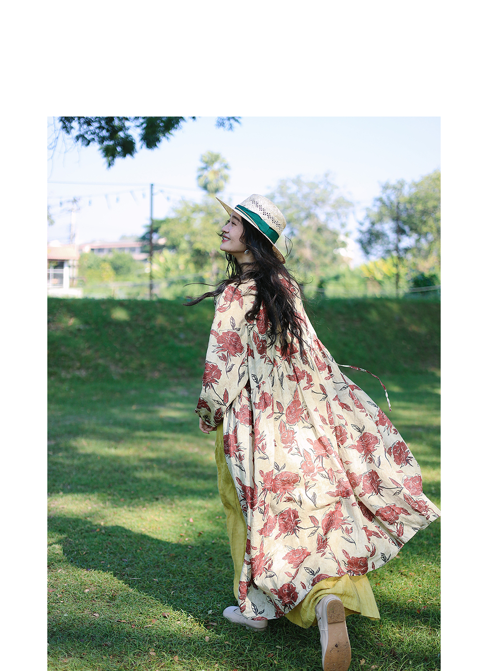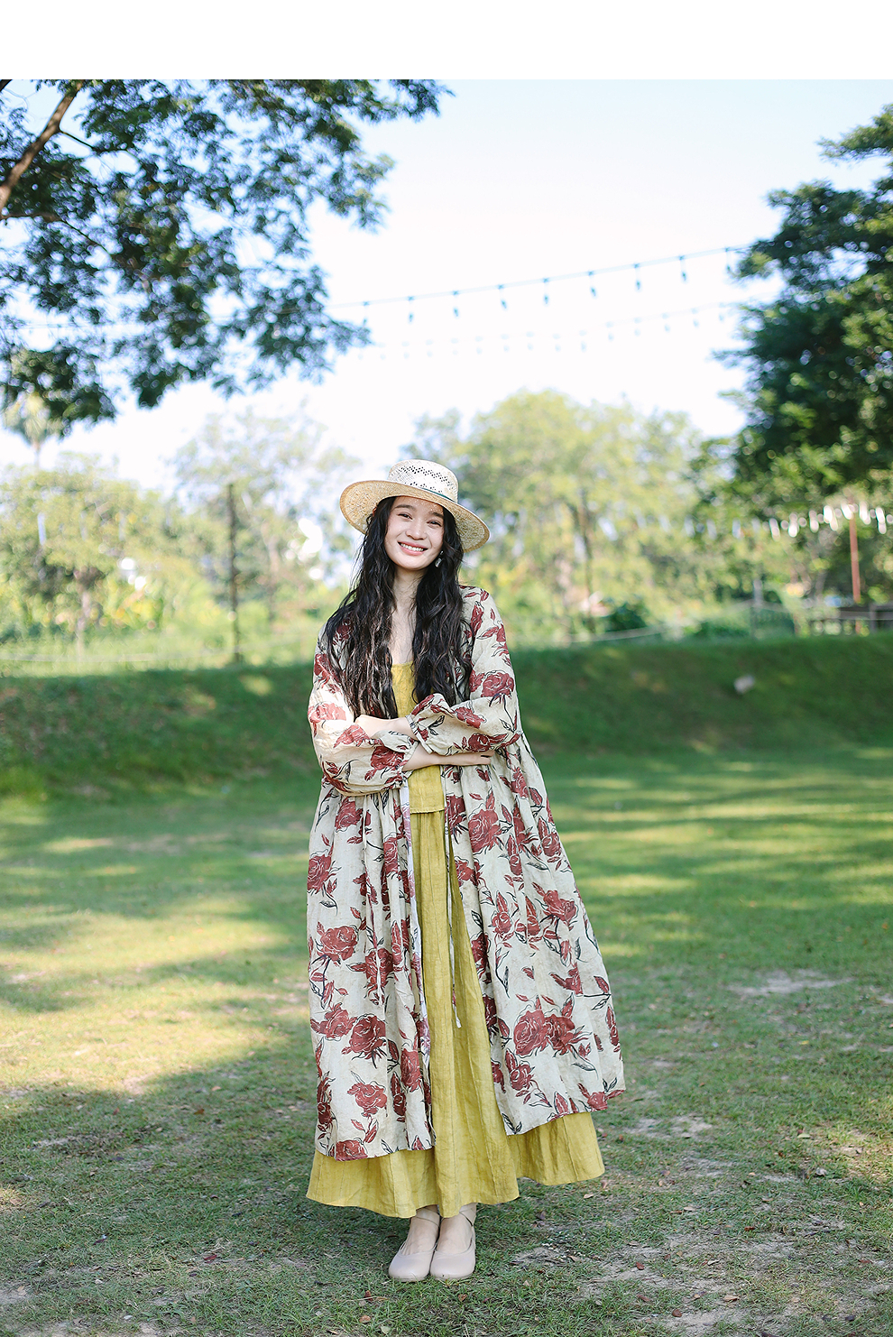 绽放旅行女装075朵/山茶花连衣裙苎麻印花交叠开门襟长袖开衫裙子