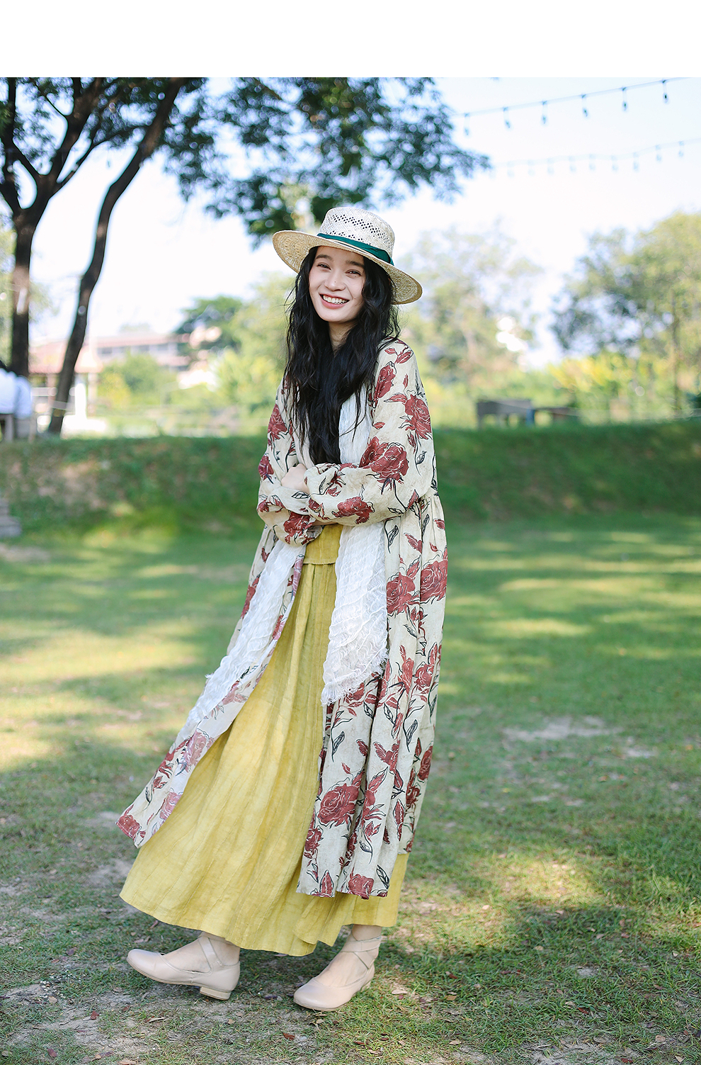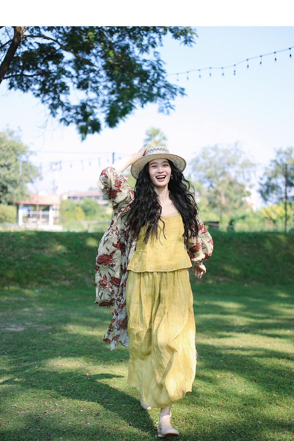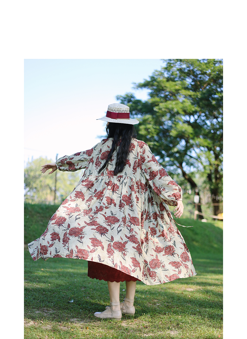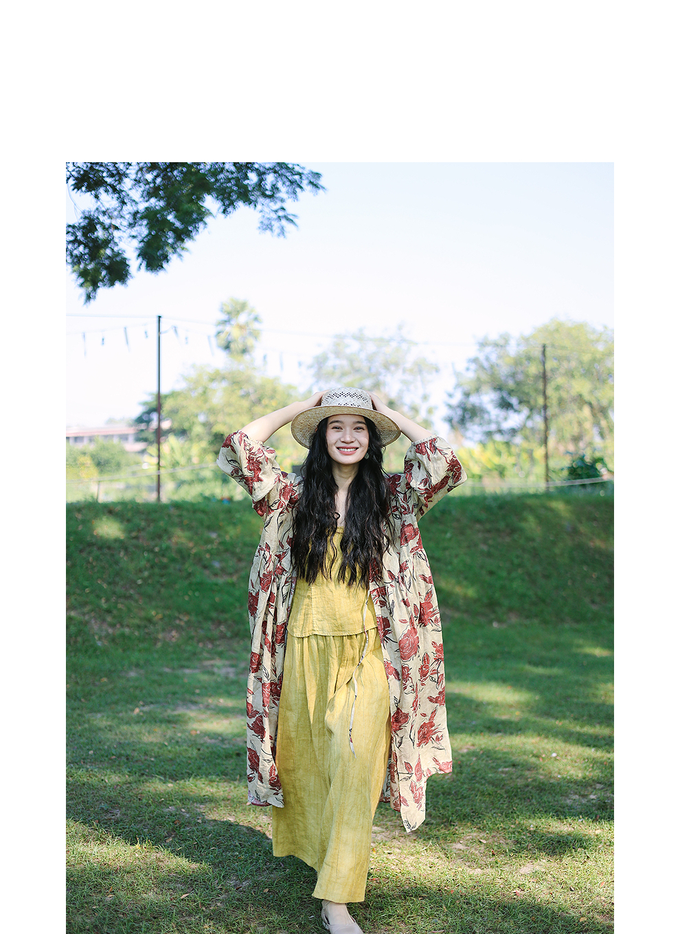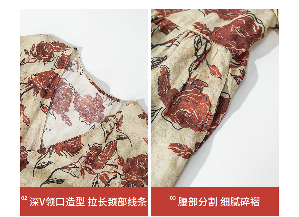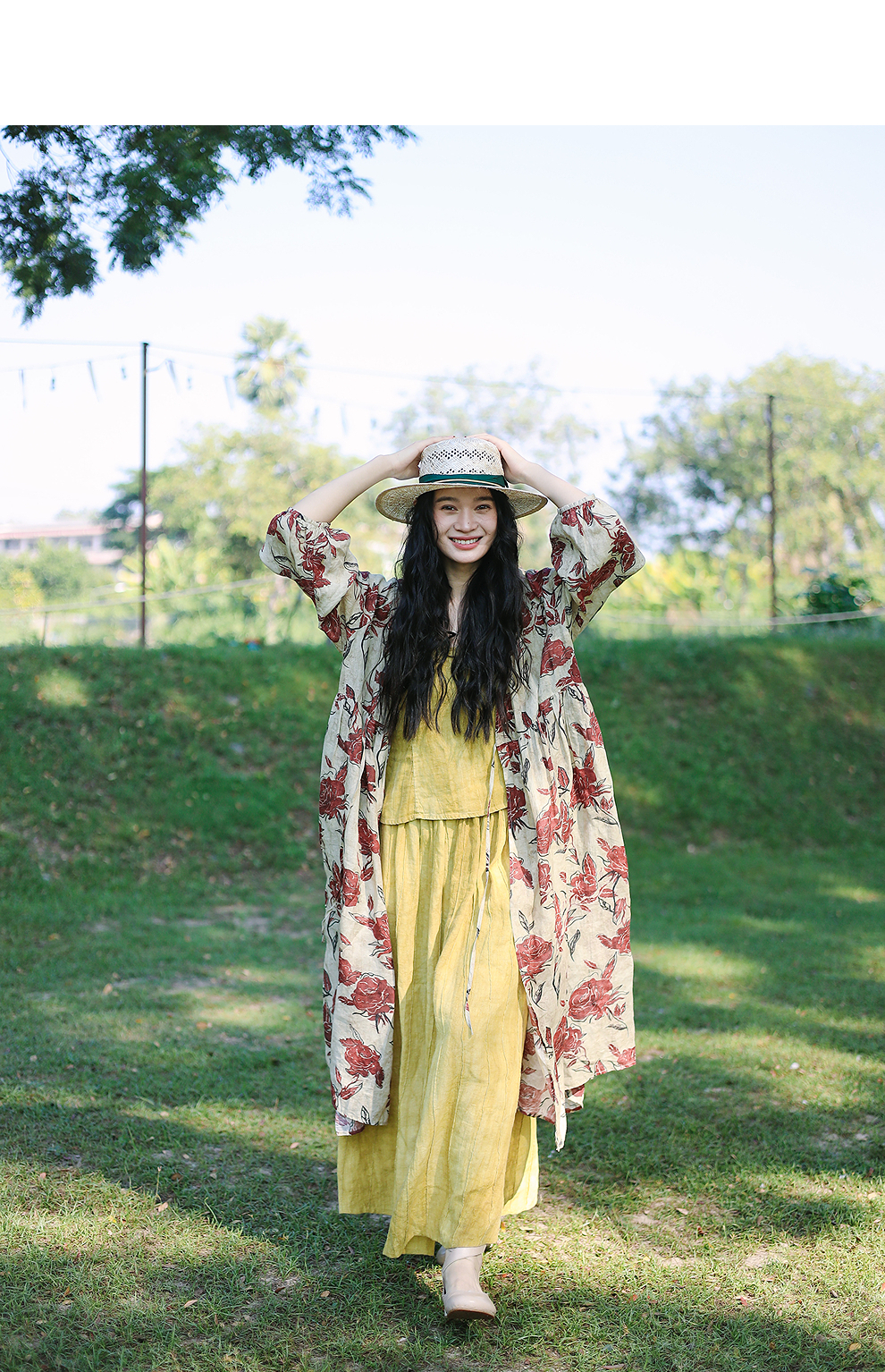 绽放旅行女装075朵/山茶花连衣裙苎麻印花交叠开门襟长袖开衫裙子