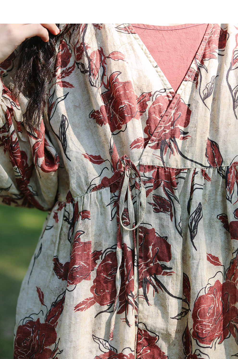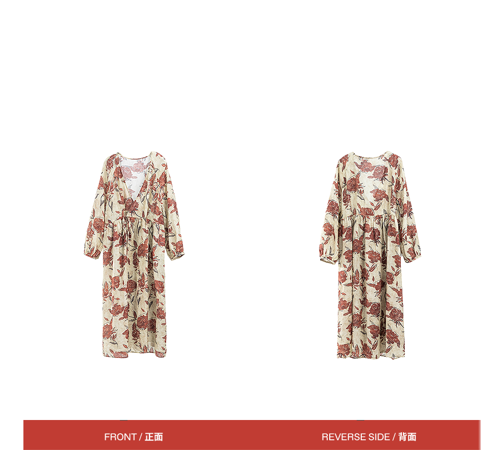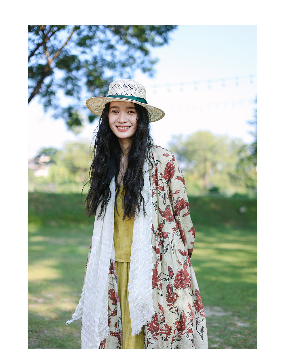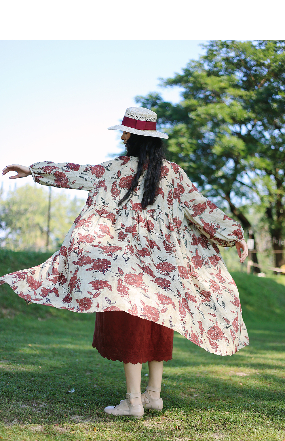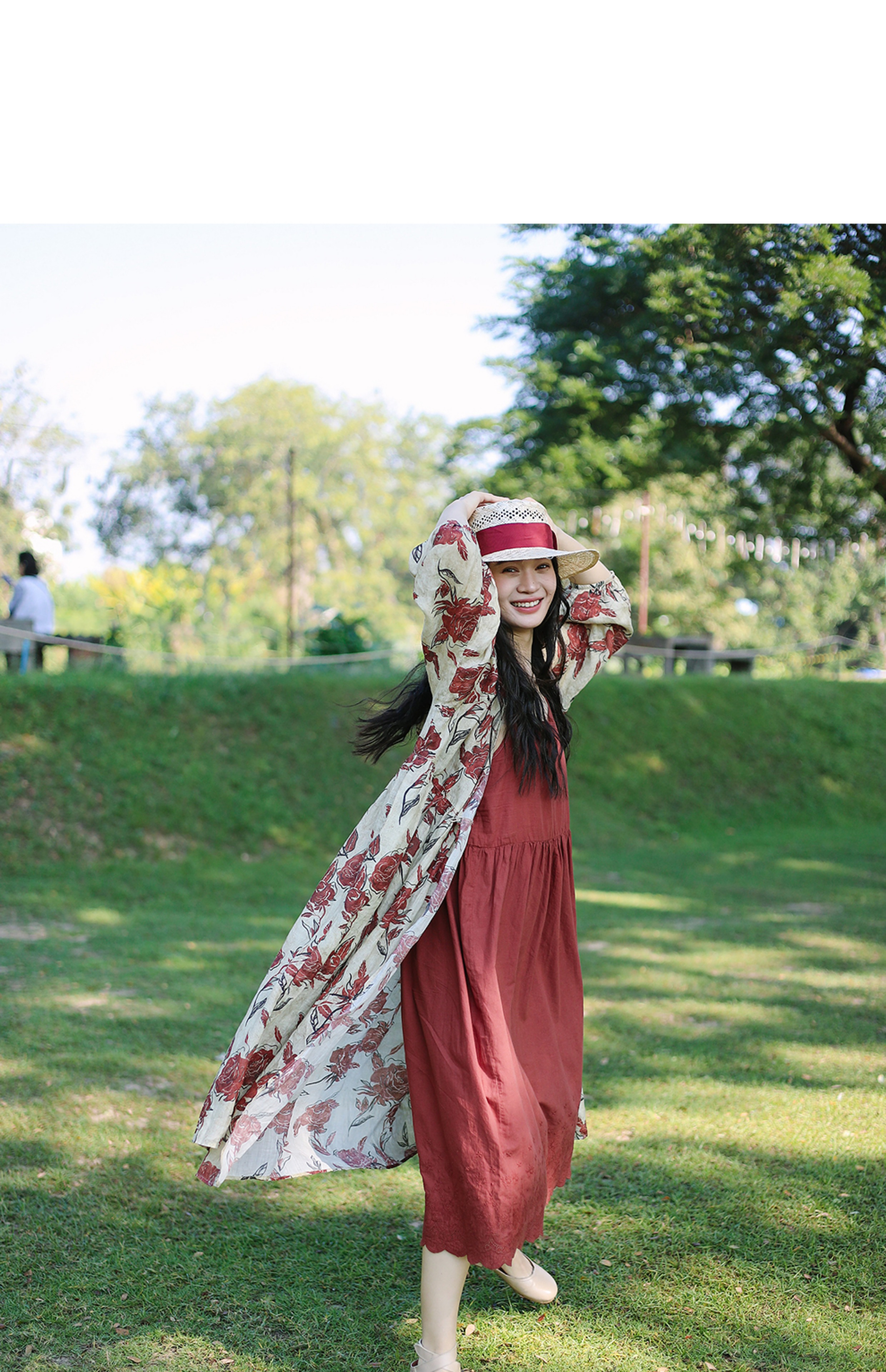 绽放旅行女装075朵/山茶花连衣裙苎麻印花交叠开门襟长袖开衫裙子