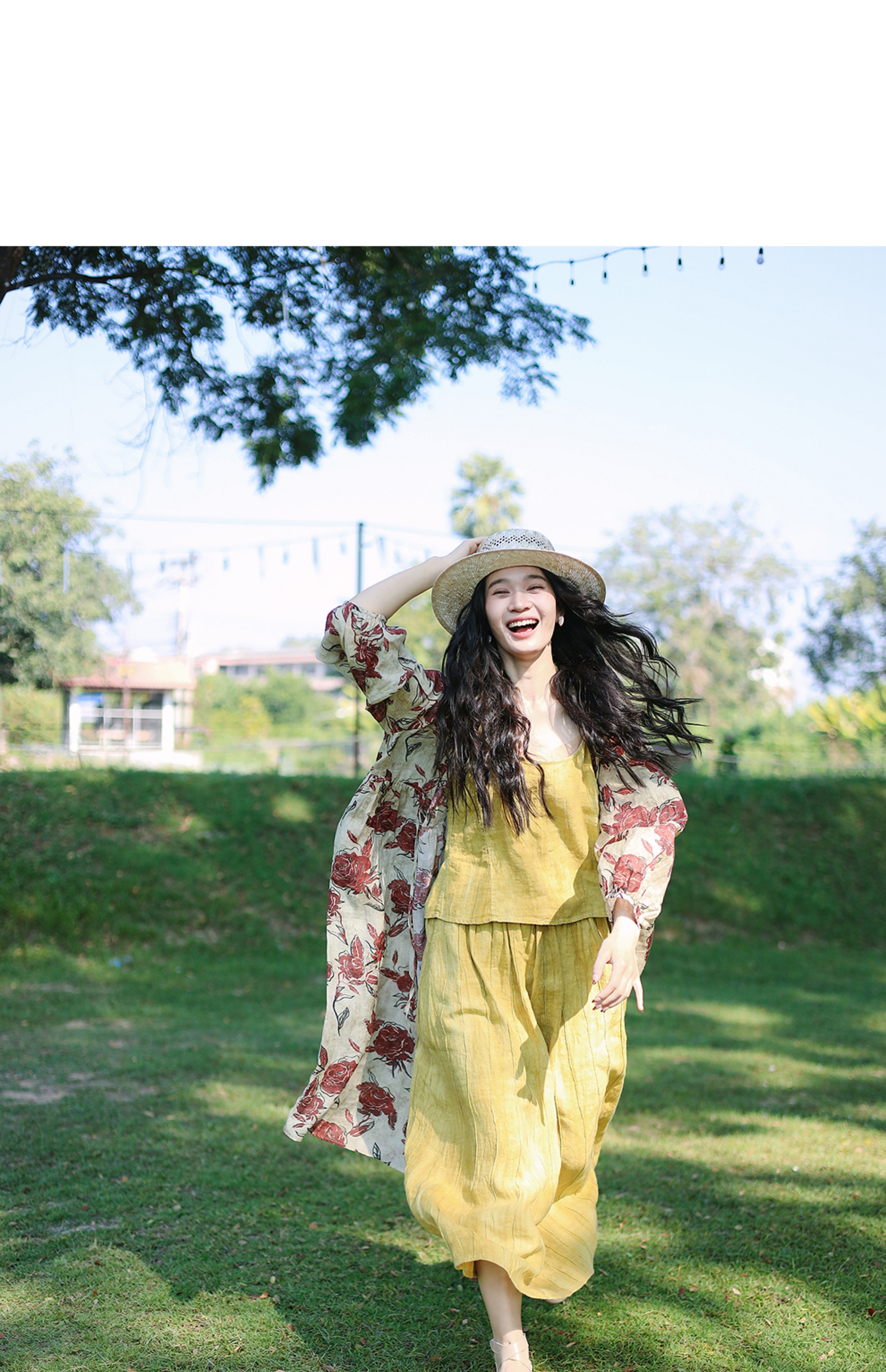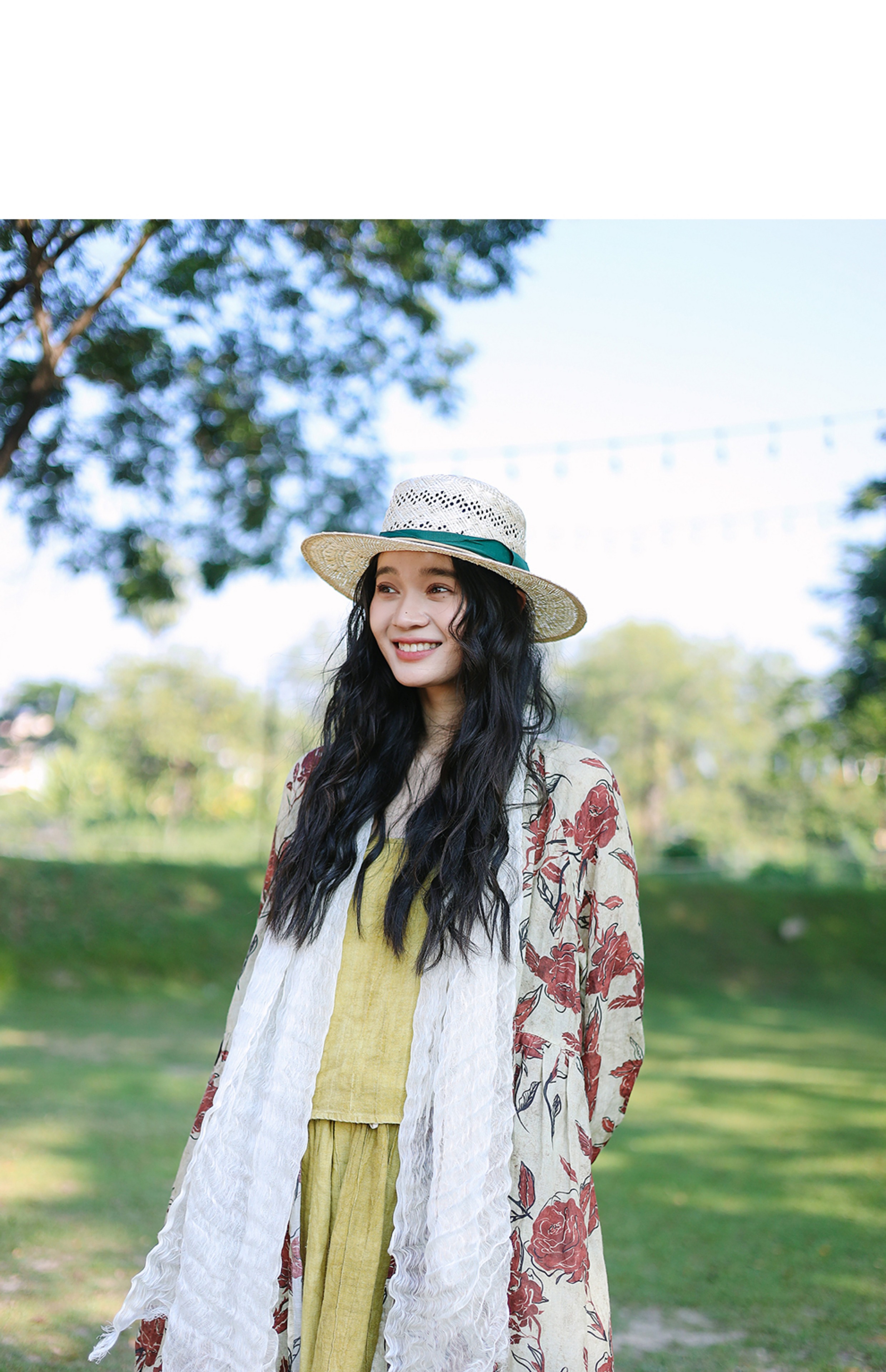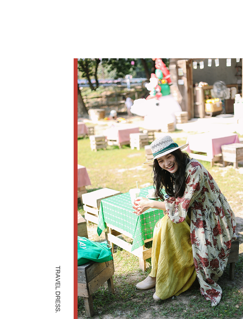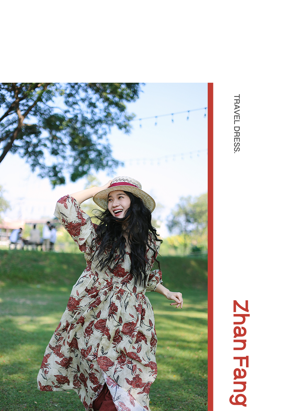 绽放旅行女装075朵/山茶花连衣裙苎麻印花交叠开门襟长袖开衫裙子