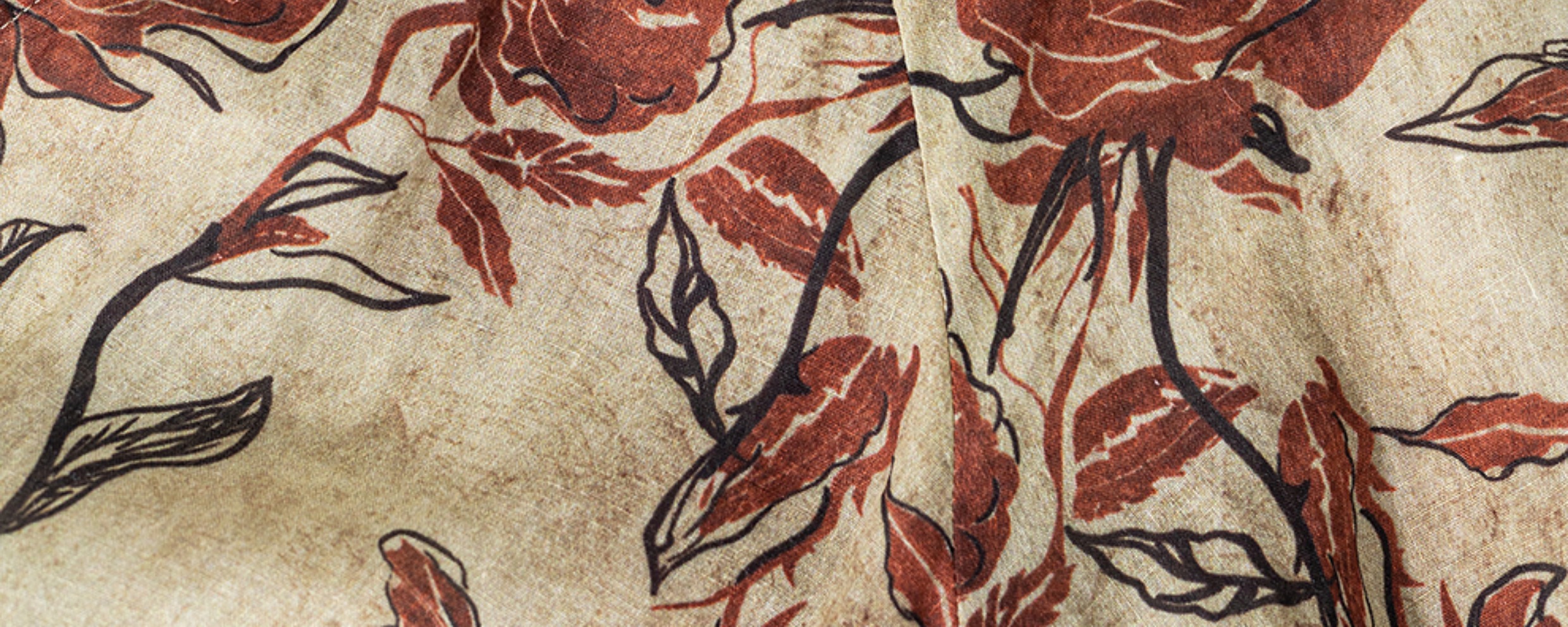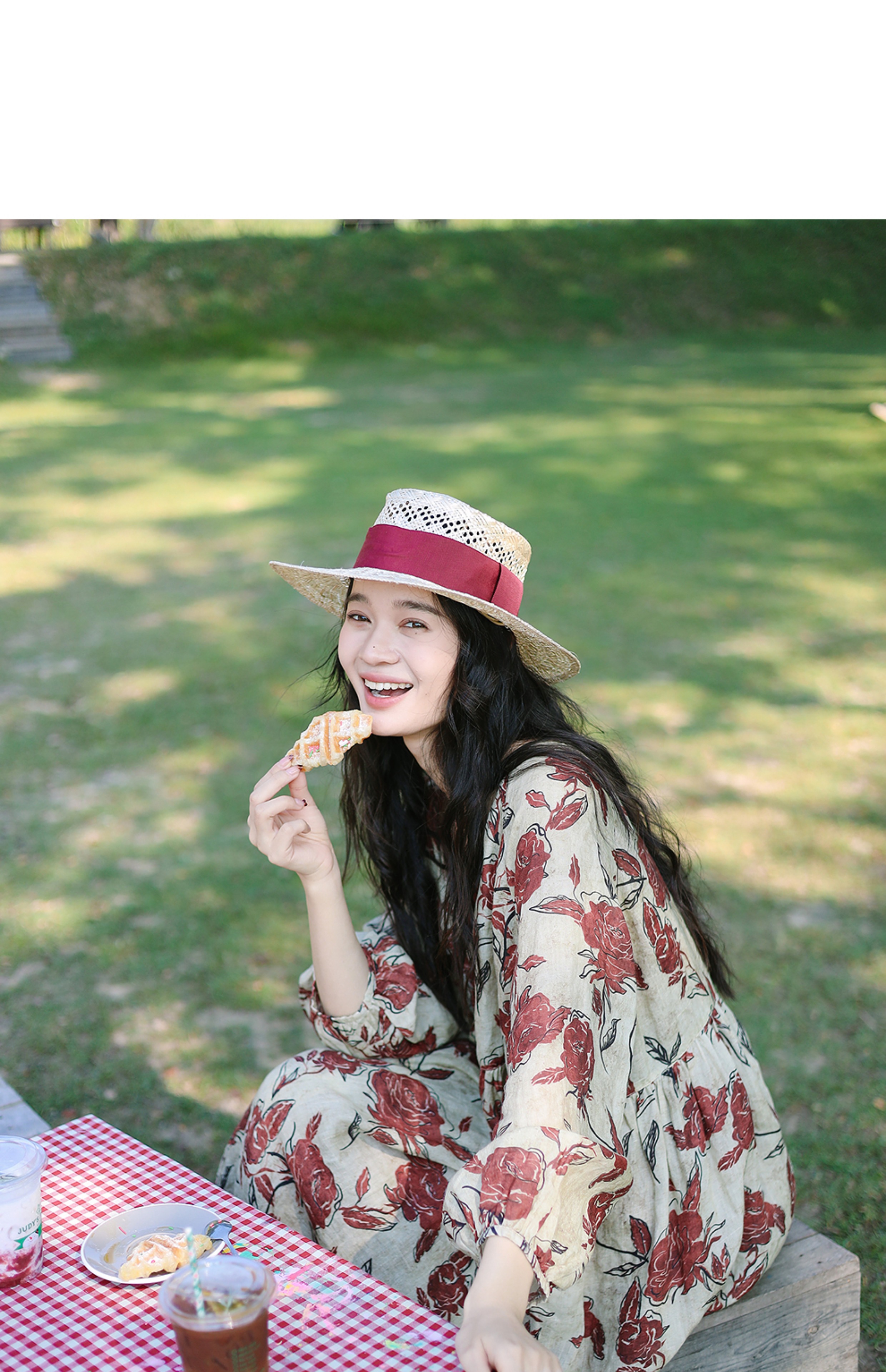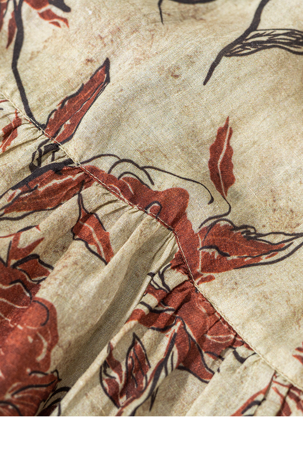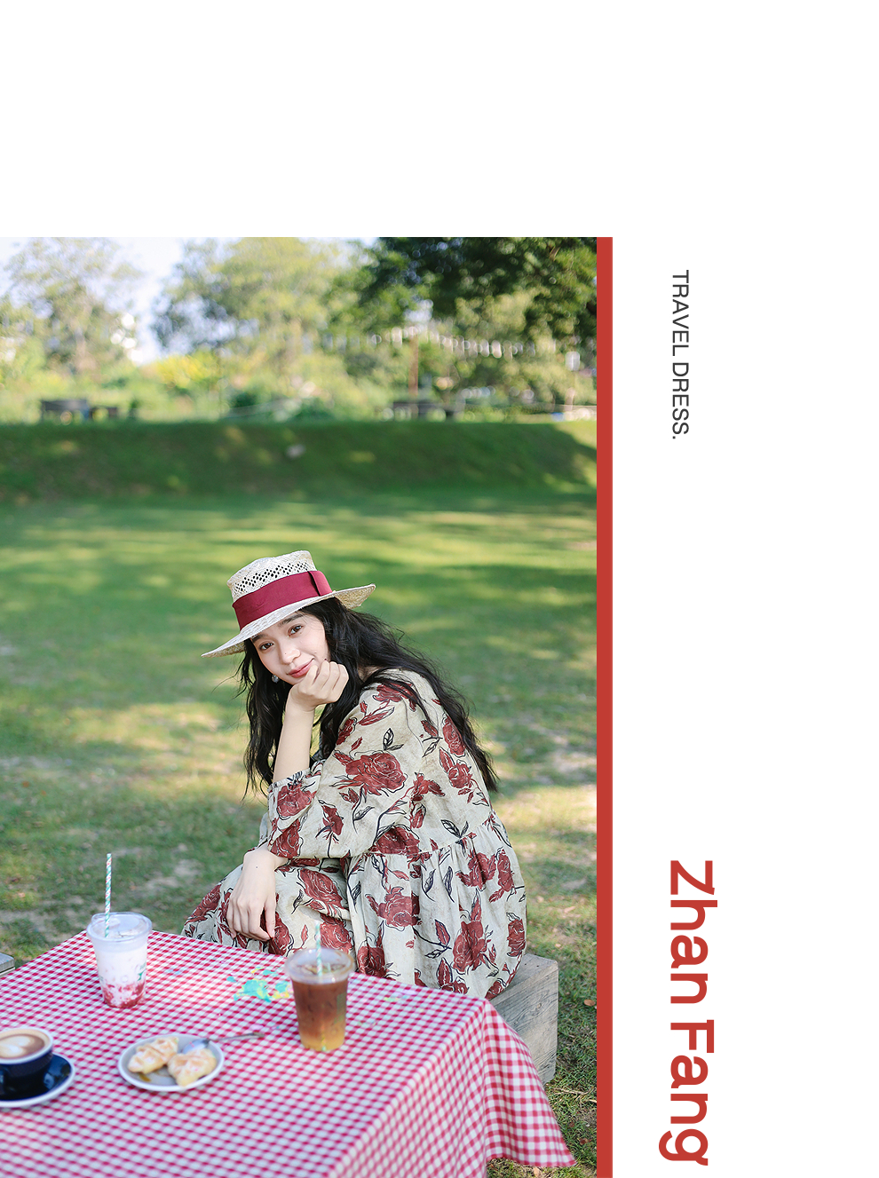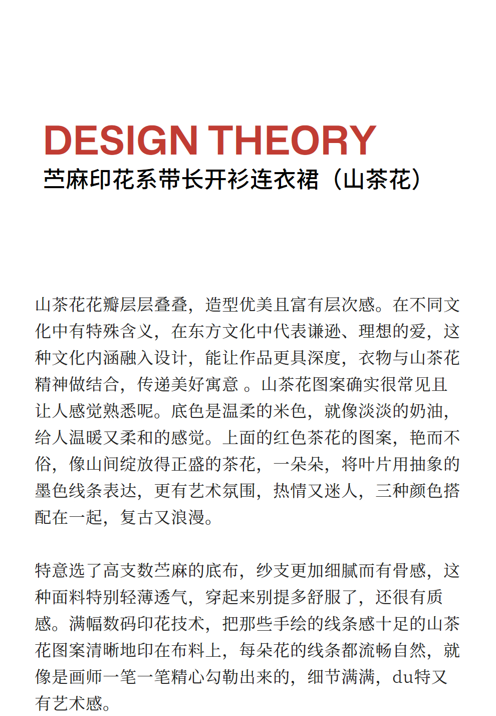 绽放旅行女装075朵/山茶花连衣裙苎麻印花交叠开门襟长袖开衫裙子