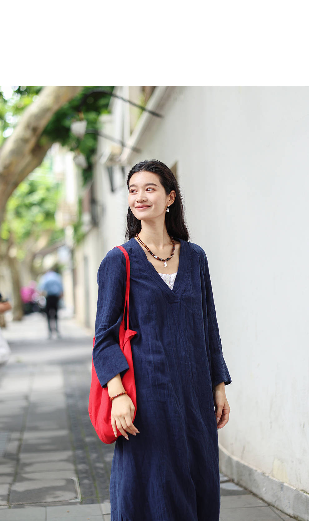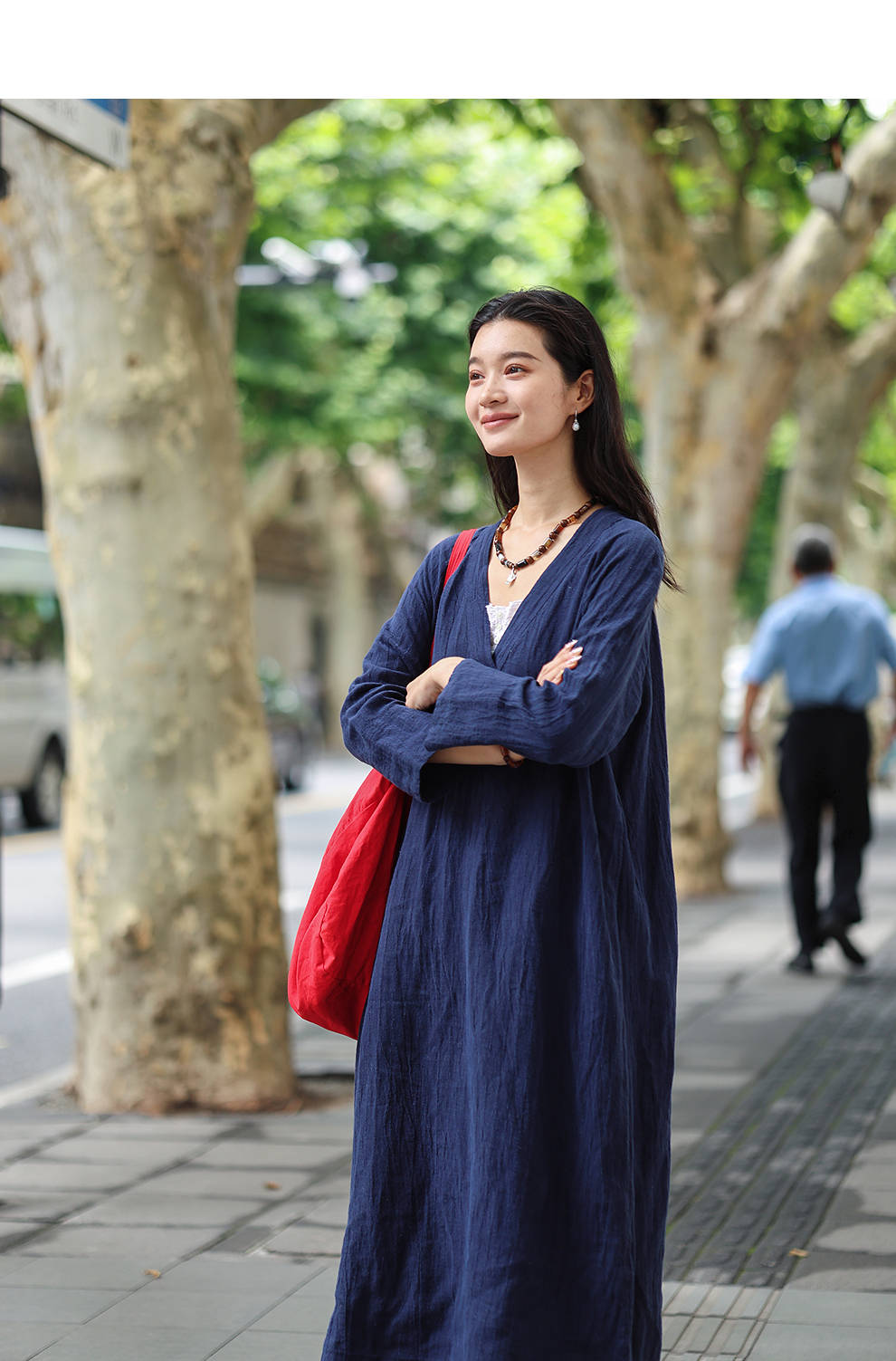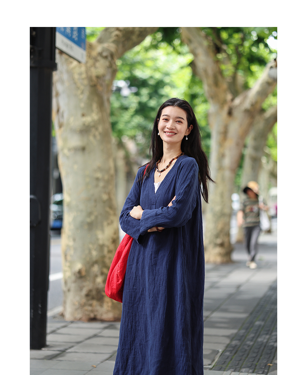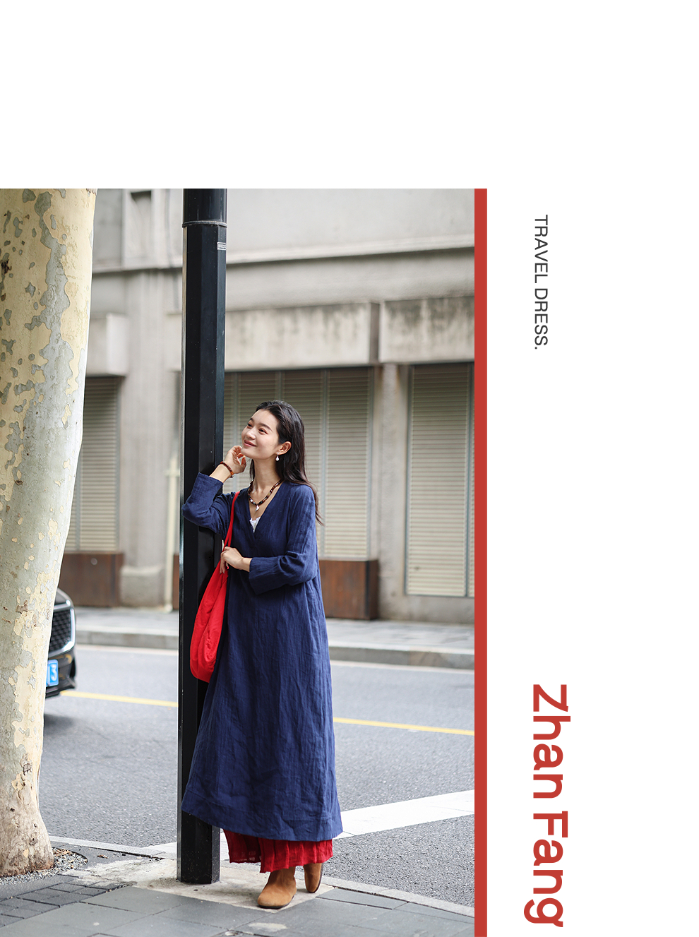 绽放旅行女装506朵/亚麻提花V领插肩文艺长袖气质连衣裙秋季新款