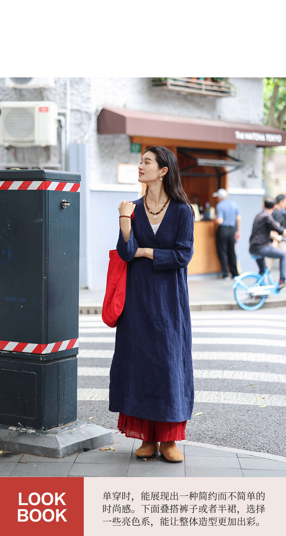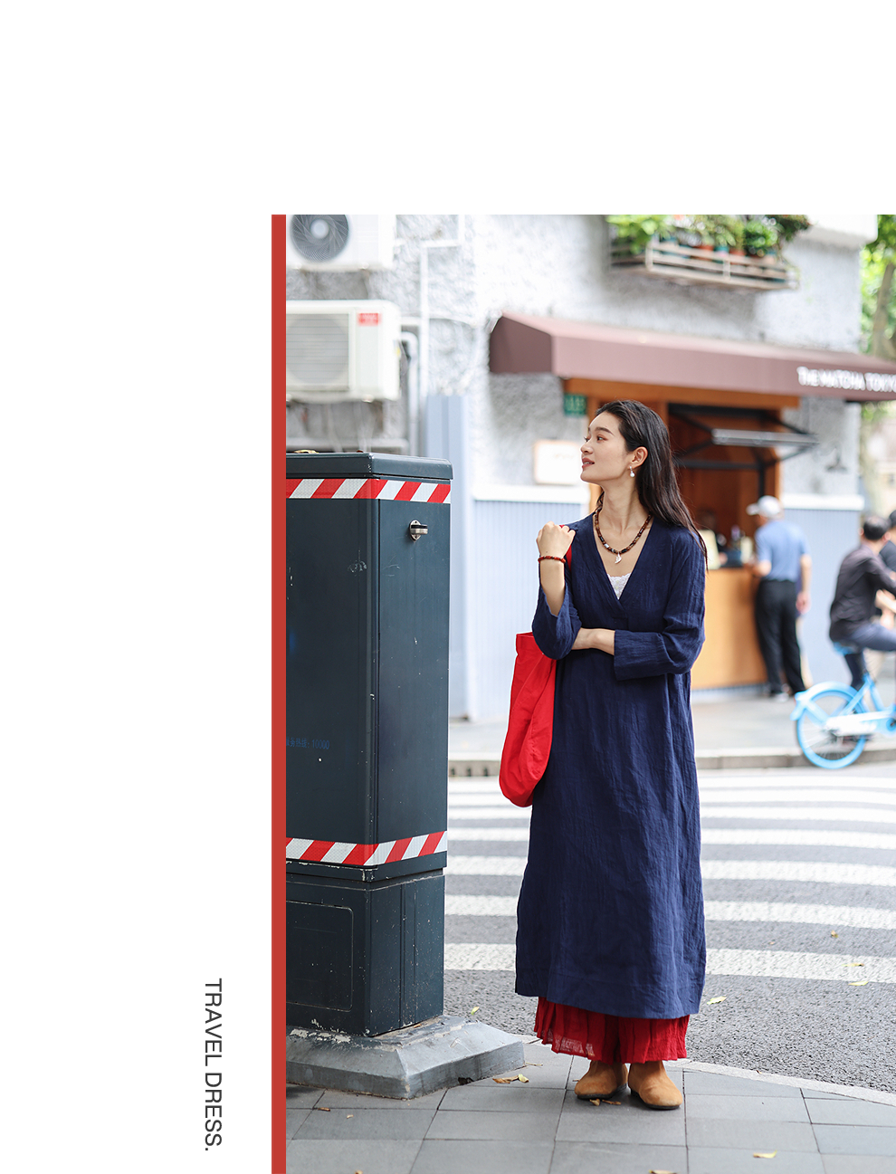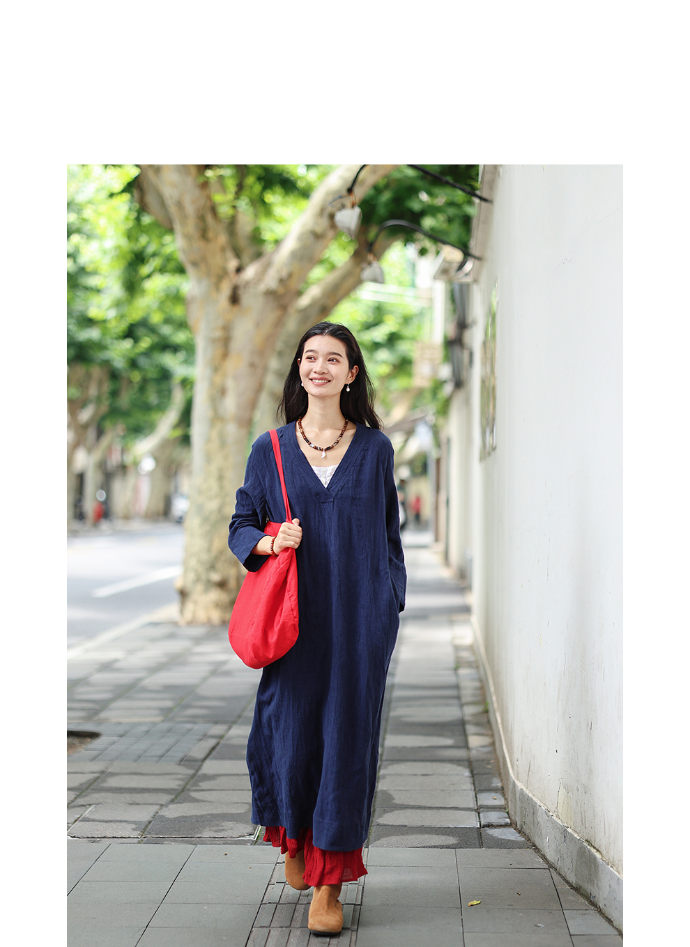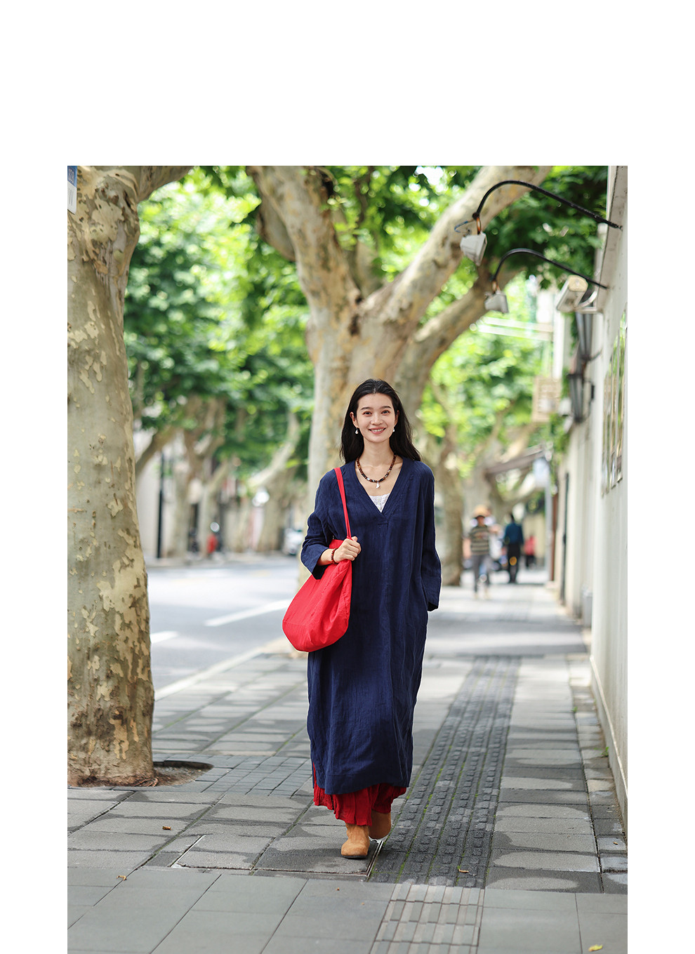 绽放旅行女装506朵/亚麻提花V领插肩文艺长袖气质连衣裙秋季新款
