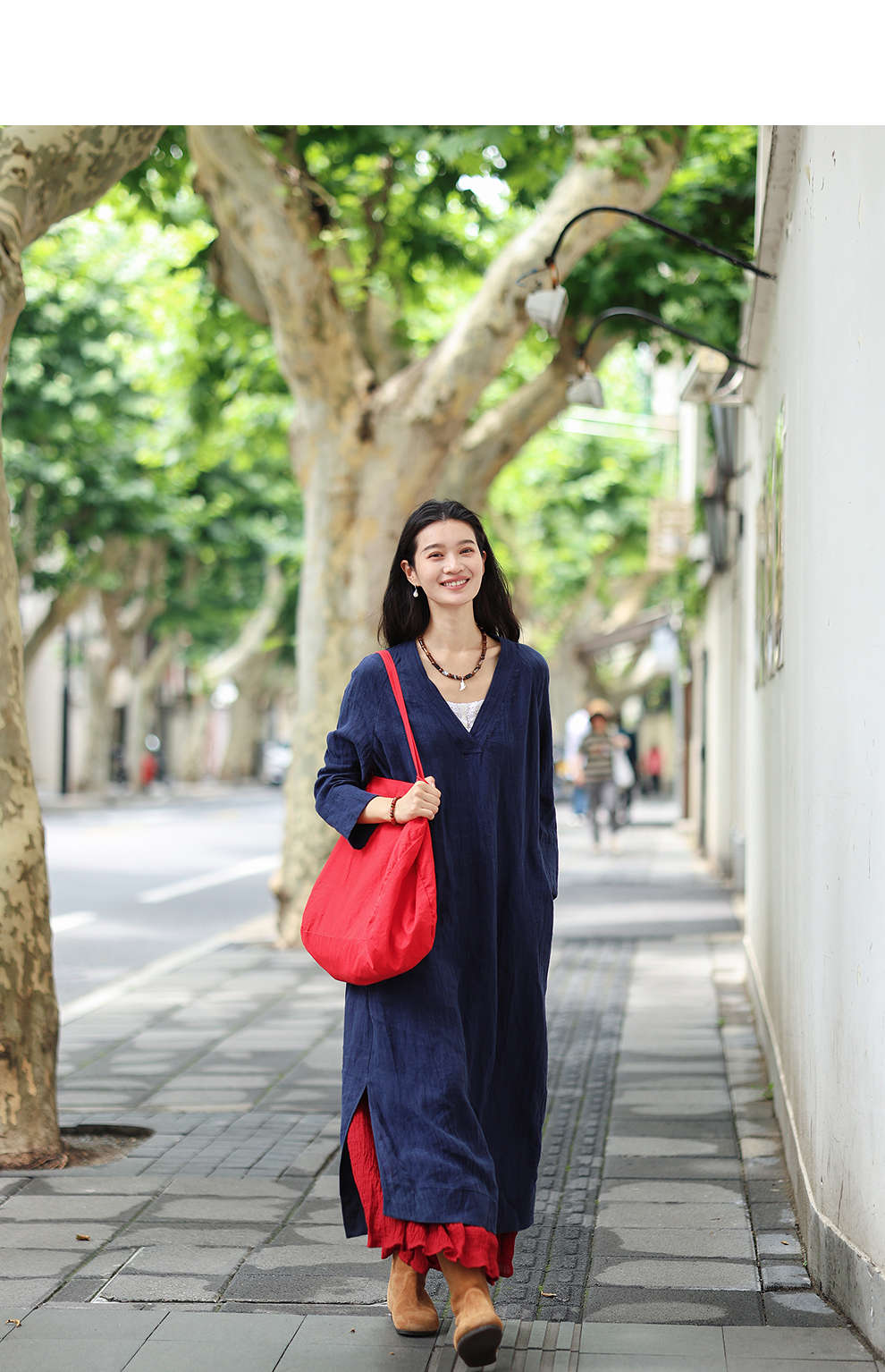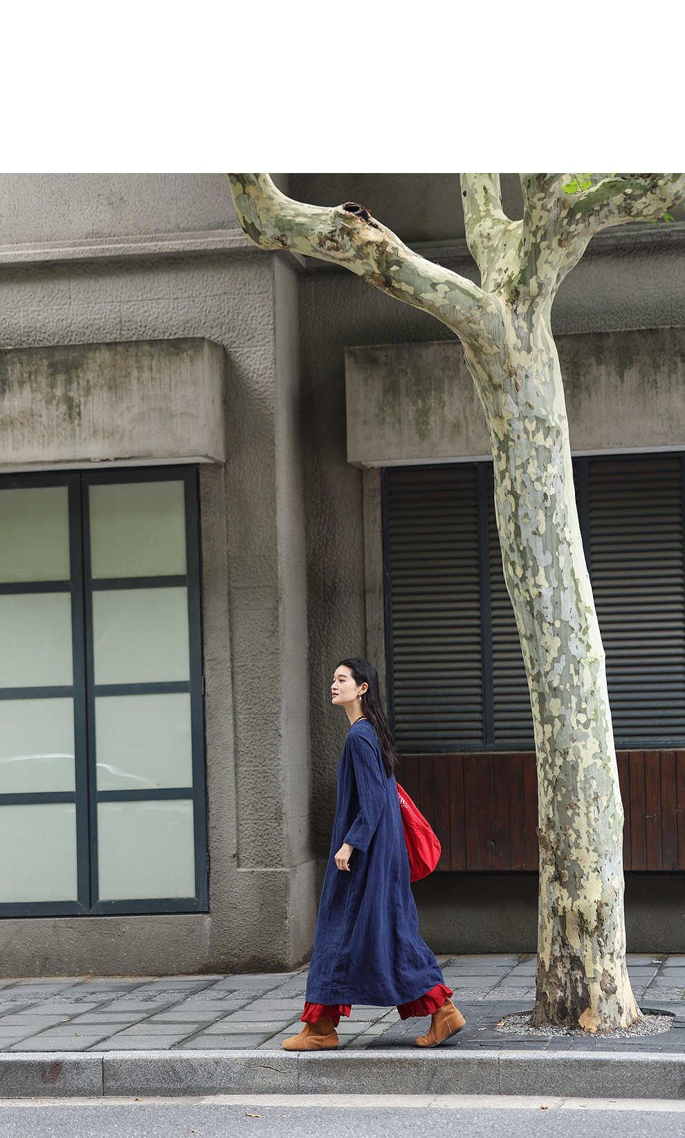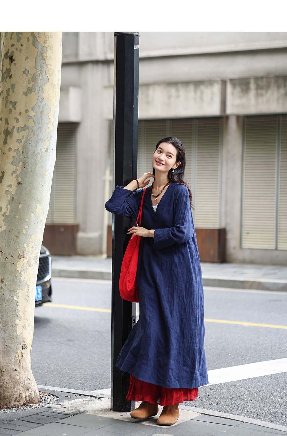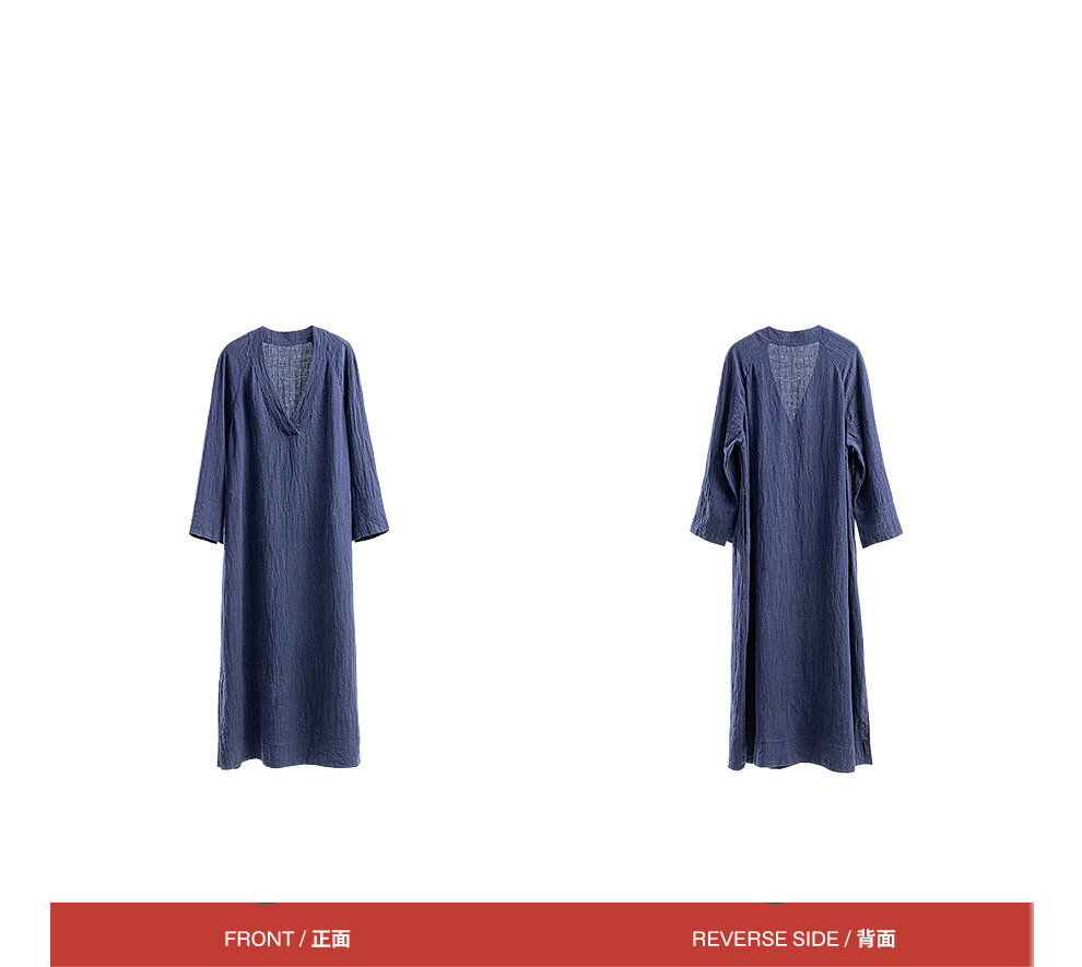 绽放旅行女装506朵/亚麻提花V领插肩文艺长袖气质连衣裙秋季新款