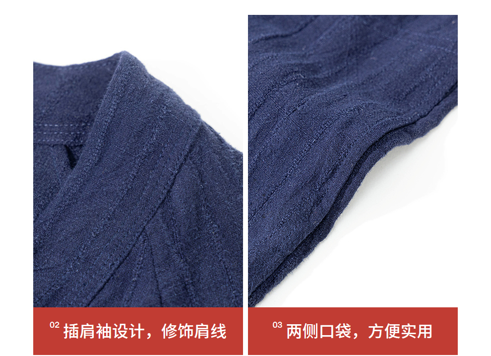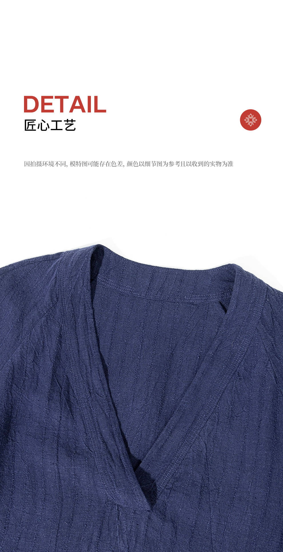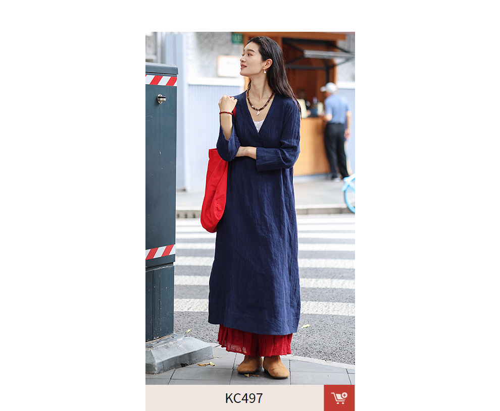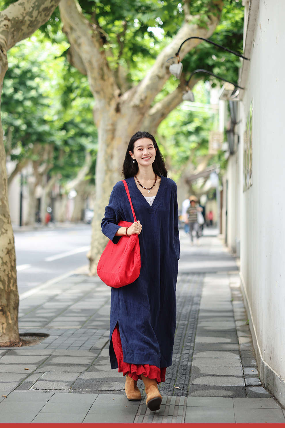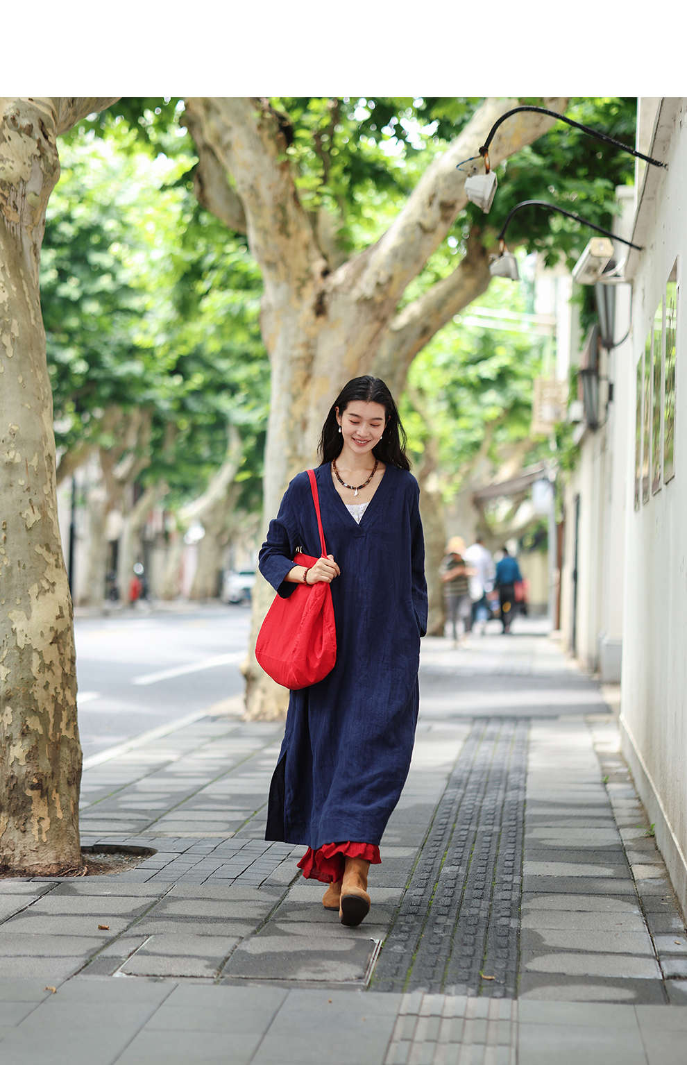 绽放旅行女装506朵/亚麻提花V领插肩文艺长袖气质连衣裙秋季新款