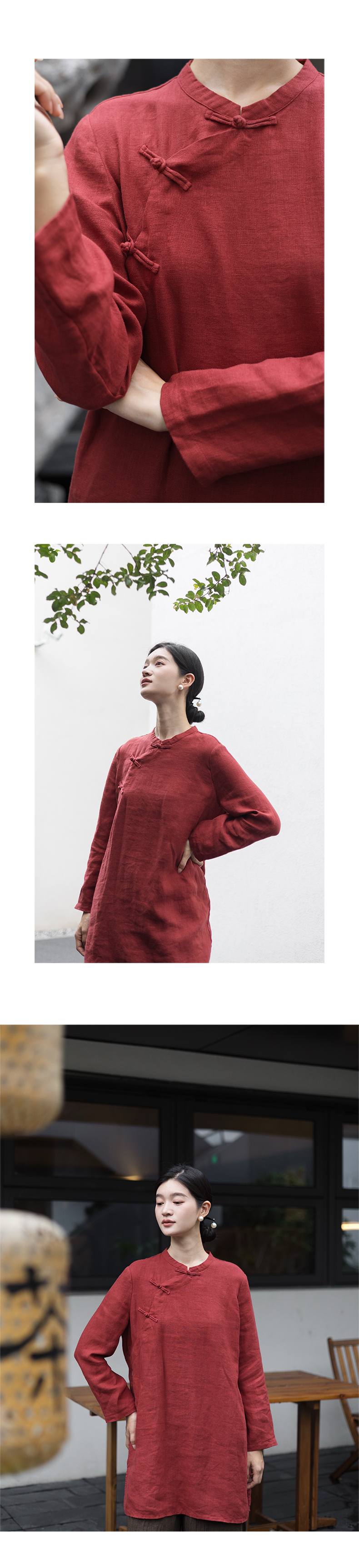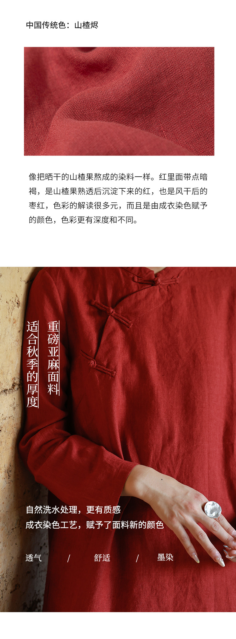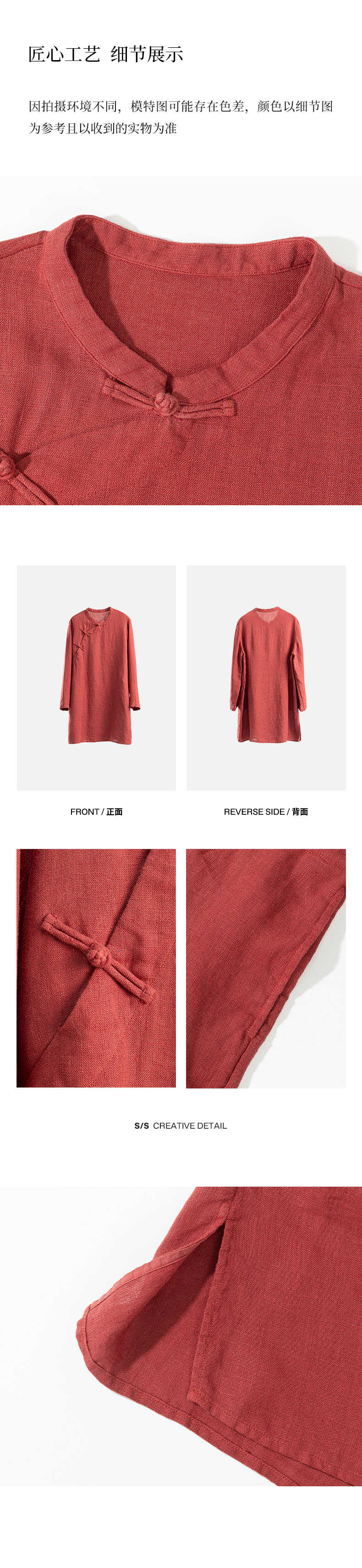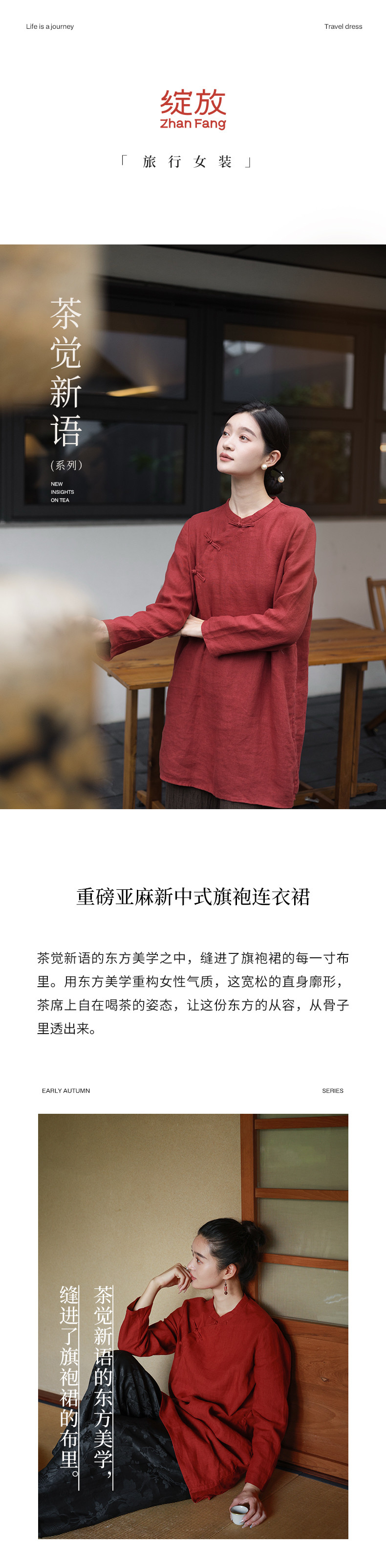 绽放旅行女装497朵/长纤色织亚麻立领新中式长袖旗袍连衣裙女秋季