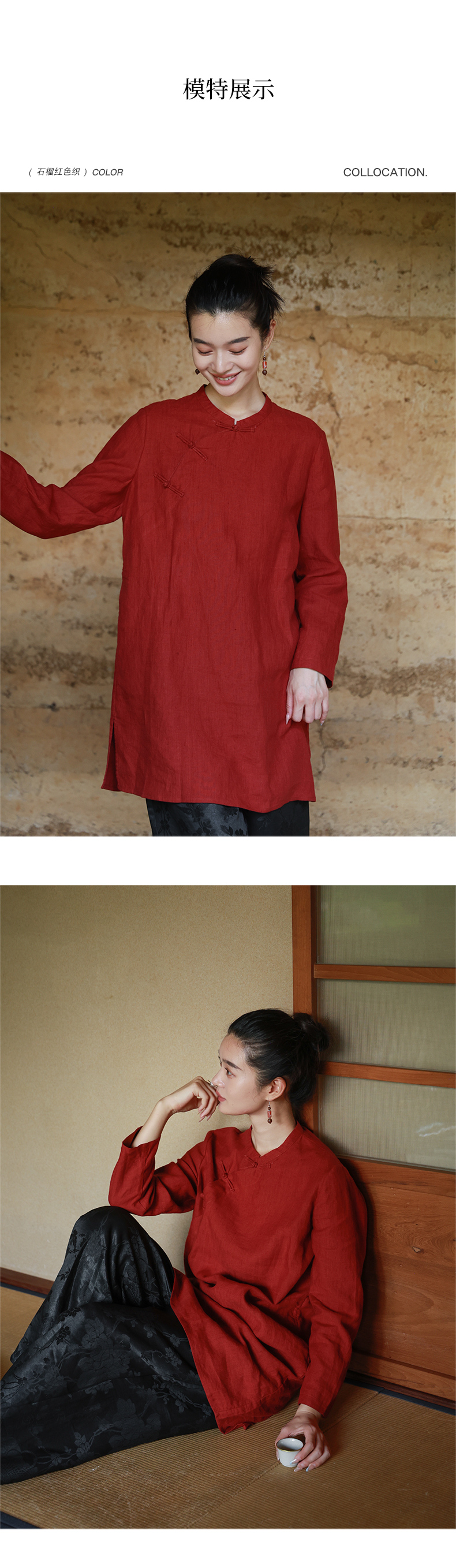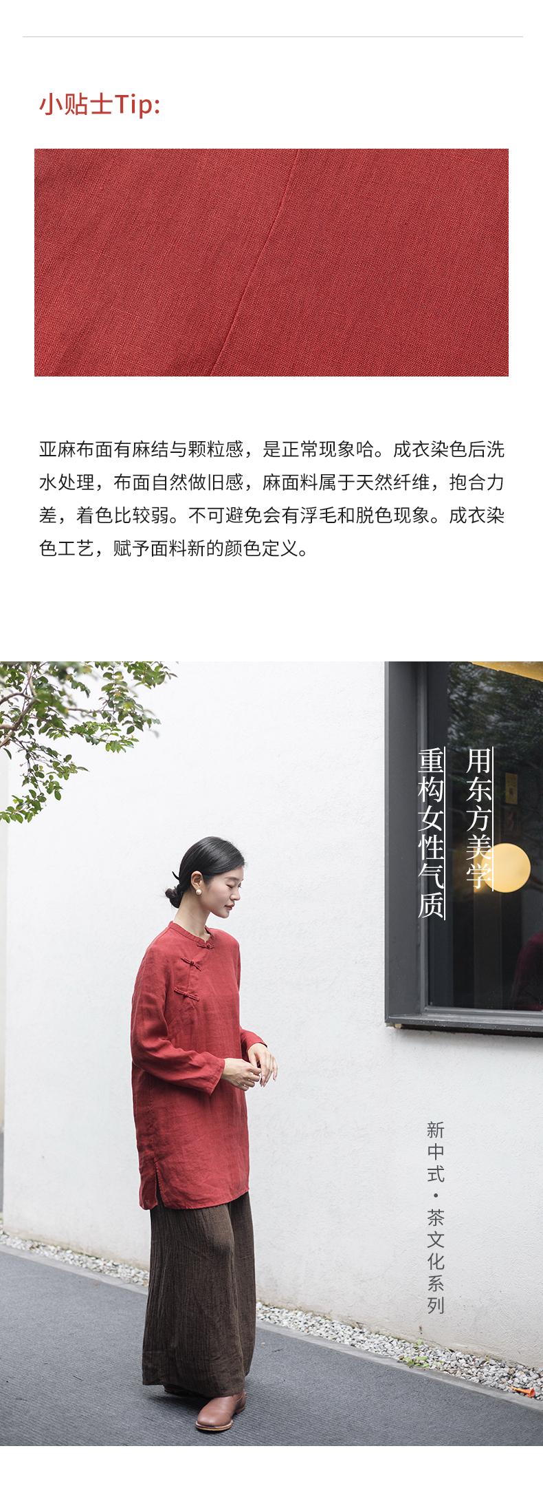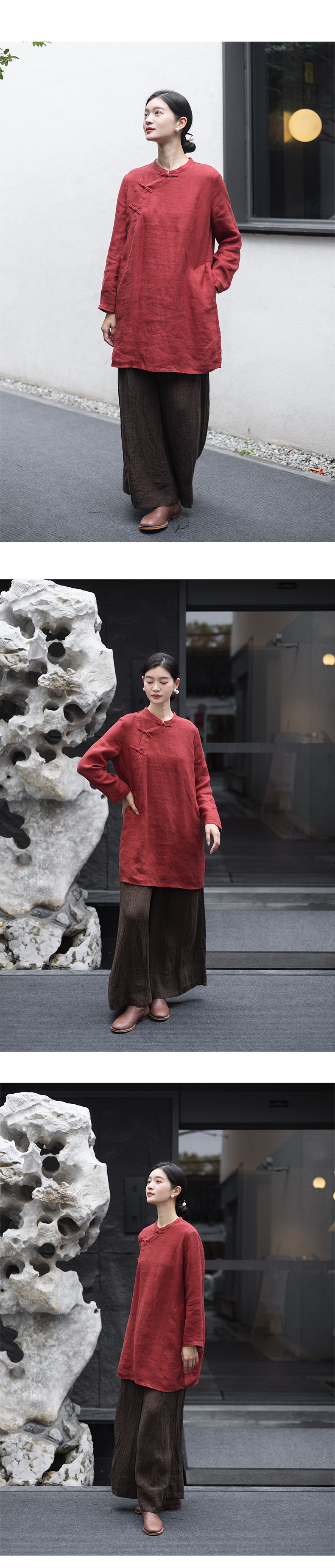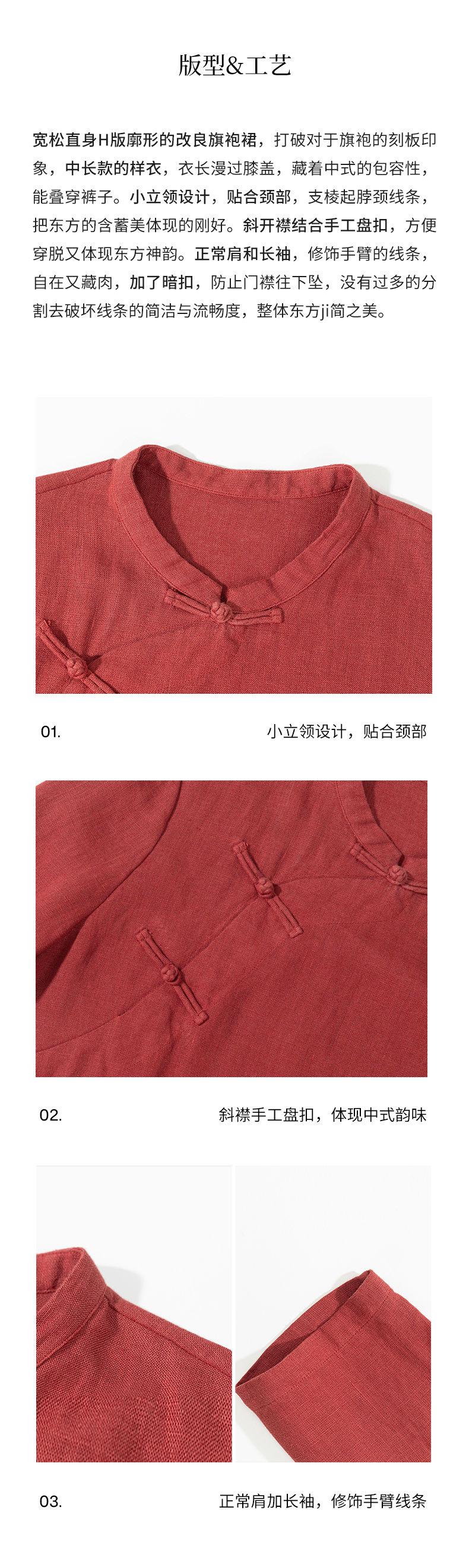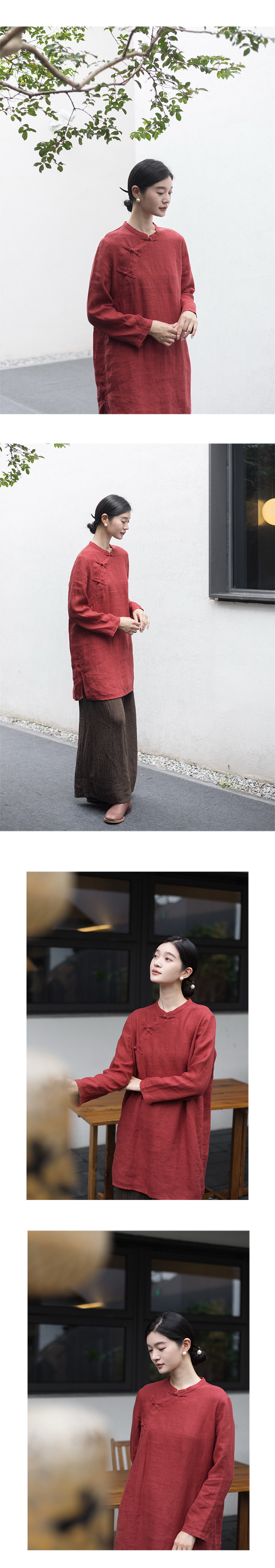 绽放旅行女装497朵/长纤色织亚麻立领新中式长袖旗袍连衣裙女秋季